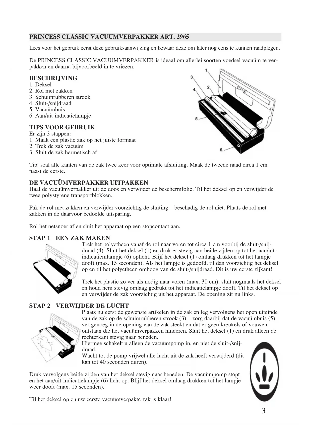 GEBRUIKSAANWIJZING Classic Vacuum Sealer 2965 PRINCESS