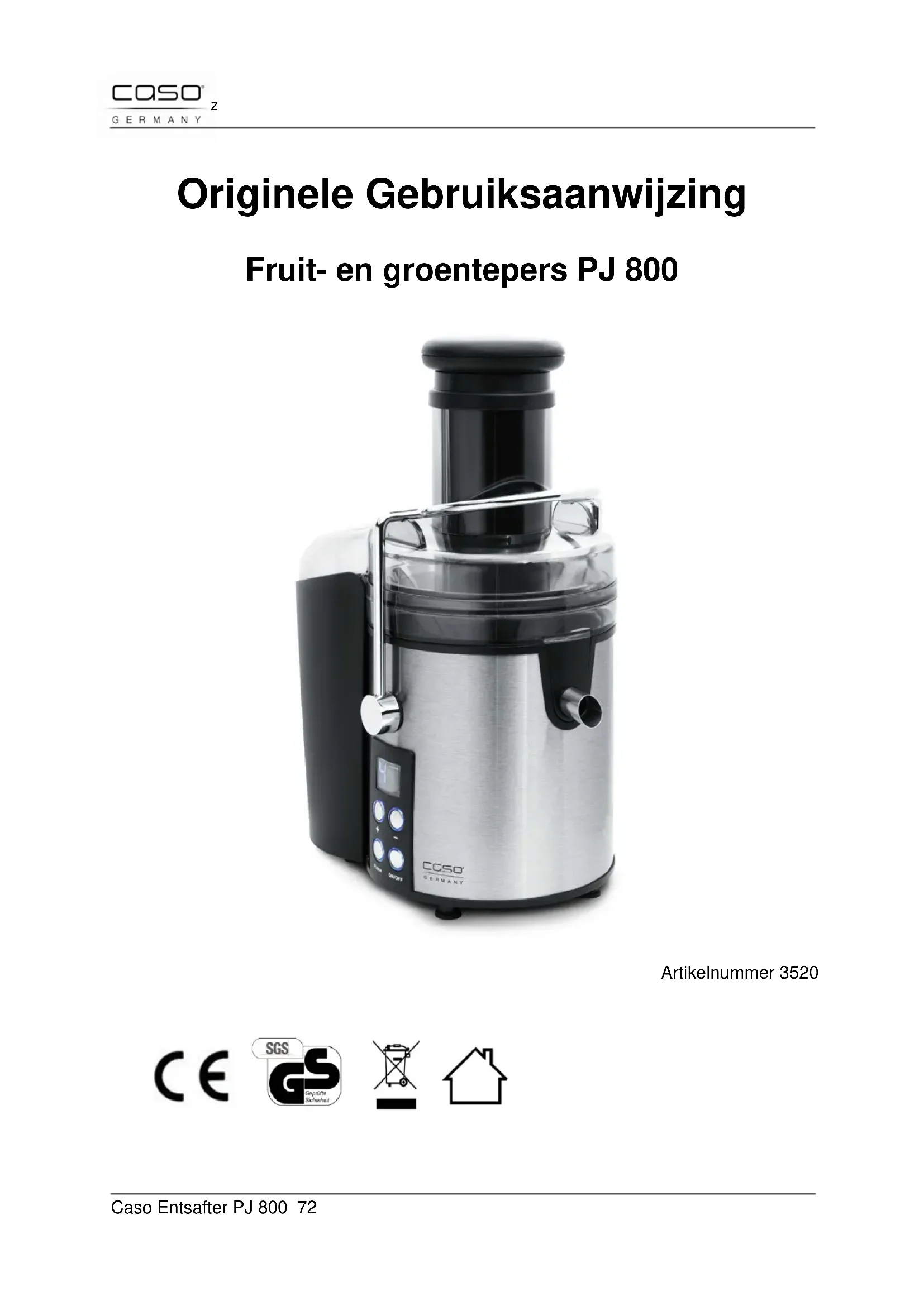 Artikelnummer 3520Caso Entsafter PJ 800 73 50 Gebruiksaanwijzing