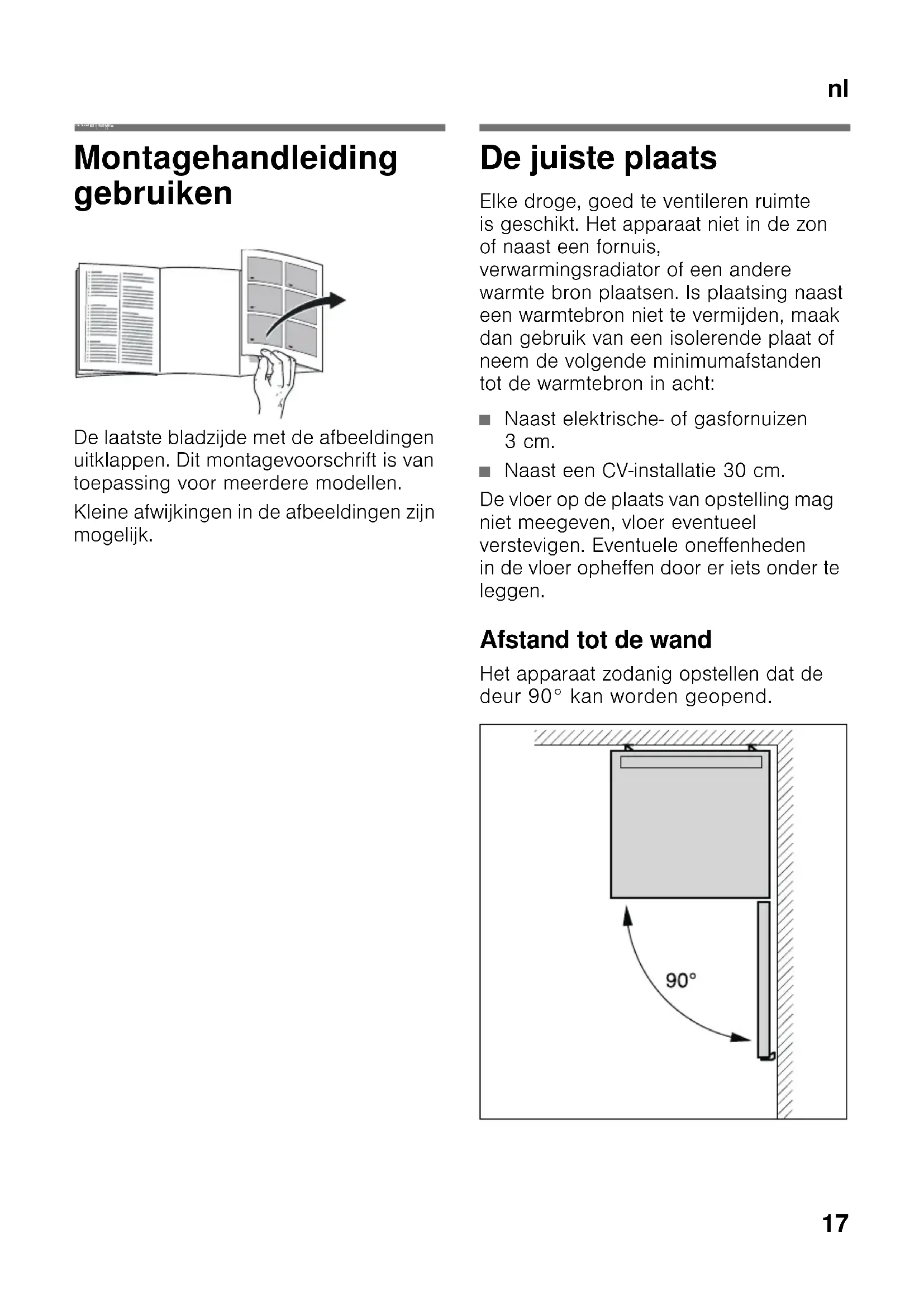 nlIn houd nlMontagevoorschrift Vrijstaand appa raat Montagehandleiding gebruiken De laatste bladzijde met de afbeeldingen uitklappen. Dit montagevoorschrift is van toepassing voor meerdere modellen. Kleine afwijkingen in de afbeeldingen zijn mogelijk. De juiste plaats Elke droge, goed te ventileren ruimte is geschikt. Het apparaat niet in de zon of naast een fornuis, verwarmingsradiator of een andere warmte bron plaatsen. Is plaatsing naast een warmtebron niet te vermijden, maak dan gebruik van een isolerende plaat of neem de volgende minimumafstanden tot de warmtebron in acht: ■ Naast elektrische- of gasfornuizen 3cm. ■ Naast een CV-installatie 30 cm. De vloer op de plaats van opstelling mag niet meegeven, vloer eventueel verstevigen. Eventuele oneffenheden in de vloer opheffen door er iets onder te leggen. Afstand tot de wand Het apparaat zodanig opstellen dat de deur 90° kan worden geopend.nl
