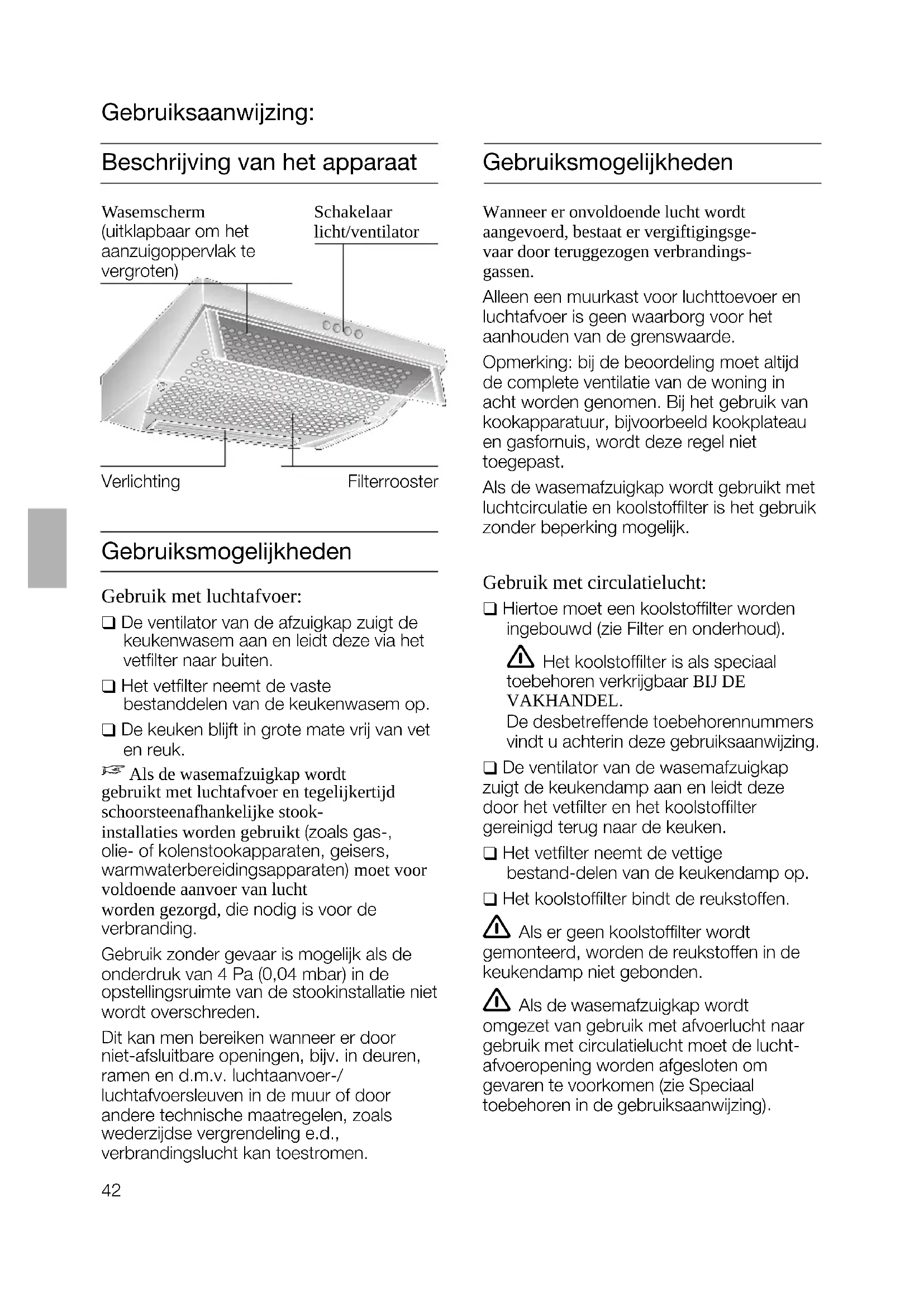 Air évacué à l'extérieur: ❑ Sur la grille de sortie d'air située sur la face supérieure de la hotte, collez la feuille de couverture livrée avec la hotte. Avant de coller, vérifiez préalablement si la surface sur laquelle collera la feuille est propre. Poids en kg: Air évacuéLargeur Air recyclé 50 cm 60 cm hotte à 1 moteur 60 cm hotte à 2 moteurs 7,0 8,0 10,0 8,0 9,0 11,0 90 cm Tous droits de modification réservés dans le cadre du progrès technique. 13,0 14,042 Gebruiksmogelijkheden Wanneer er onvoldoende lucht wordtaangevoerd, bestaat er vergiftigingsge-vaar door teruggezogen verbrandings-gassen.Alleen een muurkast voor luchttoevoer enluchtafvoer is geen waarborg voor het aanhouden van de grenswaarde.Opmerking: bij de beoordeling moet altijdde complete ventilatie van de woning inacht worden genomen. Bij het gebruik vankookapparatuur, bijvoorbeeld kookplateauen gasfornuis, wordt deze regel niettoegepast.Als de wasemafzuigkap wordt gebruikt metluchtcirculatie en koolstoffilter is het gebruikzonder beperking mogelijk. Gebruik met circulatielucht: ❑ Hiertoe moet een koolstoffilter wordeningebouwd (zie Filter en onderhoud). Het koolstoffilter is als speciaal toebehoren verkrijgbaar BIJ DE VAKHANDEL.De desbetreffende toebehorennummersvindt u achterin deze gebruiksaanwijzing.❑ De ventilator van de wasemafzuigkapzuigt de keukendamp aan en leidt dezedoor het vetfilter en het koolstoffilter gereinigd terug naar de keuken.❑ Het vetfilter neemt de vettige bestand-delen van de keukendamp op.❑ Het koolstoffilter bindt de reukstoffen. Als er geen koolstoffilter wordt gemonteerd, worden de reukstoffen in dekeukendamp niet gebonden. Als de wasemafzuigkap wordt omgezet van gebruik met afvoerlucht naargebruik met circulatielucht moet de lucht-afvoeropening worden afgesloten om gevaren te voorkomen (zie Speciaal toebehoren in de gebruiksaanwijzing) VerlichtingSchakelaarlicht/ventilatorFilterroosterWasemscherm(uitklapbaar om het aanzuigoppervlak te vergroten) Beschrijving van het apparaat Gebruiksaanwijzing: Gebruiksmogelijkheden Gebruik met luchtafvoer: ❑ De ventilator van de afzuigkap zuigt dekeukenwasem aan en leidt deze via hetvetfilter naar buiten.❑ Het vetfilter neemt de vaste bestanddelen van de keukenwasem op.❑ De keuken blijft in grote mate vrij van veten reuk. Als de wasemafzuigkap wordtgebruikt met luchtafvoer en tegelijkertijdschoorsteenafhankelijke stook-installaties worden gebruikt (zoals gas-,olie- of kolenstookapparaten, geisers,warmwaterbereidingsapparaten) moet voorvoldoende aanvoer van luchtworden gezorgd, die nodig is voor de verbranding.Gebruik zonder gevaar is mogelijk als deonderdruk van 4 Pa (0,04 mbar) in deopstellingsruimte van de stookinstallatie nietwordt overschreden.Dit kan men bereiken wanneer er door niet-afsluitbare openingen, bijv. in deuren,ramen en d.m.v. luchtaanvoer-/luchtafvoersleuven in de muur of doorandere technische maatregelen, zoalswederzijdse vergrendeling e.d., verbrandingslucht kan toestromen.43 Vóór het eerste gebruik Belangrijke aanwijzingen: ❑ Deze gebruiksaanwijzing geldt voor verschillende uitvoeringen van het apparaat. Het is mogelijk dat er een aantal kenmerken worden beschreven die niet van toepassing zijn op uw apparaat. ❑ Deze afzuigkap voldoet aan de geldende veiligheidsvoorschriften. Reparaties mogen uitsluitend worden uitgevoerd door een vakman. Door ondeskundige reparaties kunnen aanzienlijke gevaren voor de gebruiker ontstaan. Onder de afzuigkap niet flamberen. Brandgevaar bij het vetfilter door ! opstijgende vlammen. De kookzones moeten altijd zijn bedekt met pannen. Boven een fornuis voor vaste brandstoffen (steenkool, hout e.d.) is het gebruik van de afzuigkap alleen beperkt toegestaan (zie montagevoorschrift). Gaskookplaten / gasfornuizen Gebruik niet alle gaskookzones tegelijk langdurig (max. 15 minuten) op de hoogste stand, anders bestaat er kans op brandwonden bij aanraking van de oppervlakken van de behuizing en gevaar van beschadiging van de afzuigkap. Bij gebruik van de afzuigkap boven een gaskookplaat waarvan gelijktijdig drie of meer gaskookzones worden gebruikt, moet de afzuigkap op de maximumstand worden gezet. ❑ Lees de gebruiksaanwijzing zorgvuldig voordat u het nieuwe apparaat gebruikt. Ze bevat belangrijke informatie voor uw veiligheid en voor het gebruik en het onderhoud van het apparaat. ❑ Bewaar de gebruiksaanwijzing en het montagevoorschrift zorgvuldig, eventueel voor een volgende bezitter van het apparaat. Indien het apparaat beschadigd is, mag u het niet in gebruik nemen. Aansluiting en ingebruikneming mogen alleen door een vakman worden uitgevoerd. Als de aansluitkabel van dit apparaat beschadigd raakt, moet deze worden vervangen door de fabrikant, diens klantenservice of een andere gekwalificeerde vakman, om gevaren te voorkomen. Verpakkingsmateriaal volgens de voorschriften afvoeren (zie het montage- voorschrift). Deze afzuigkap mag is uitsluitend bedoeld voor huishoudelijk gebruik. Afzuigkap uitsluitend met ingeschroefde lampen gebruiken. Defecte lampen dienen onmiddellijk vervangen te worden om overbelasting van de overige lampen te voorkomen. Afzuigkap nooit zonder vetfilter gebruiken. Oververhit vet en olie is gemakkelijk ontvlambaar. Daarom gerechten met vet of olie, b.v. pata- tes frites, alleen onder toezicht toebereiden.44 Bedienen van de wasemafzuig kap De keukenwasem wordt op de doeltreffendste manier verwijderd door: