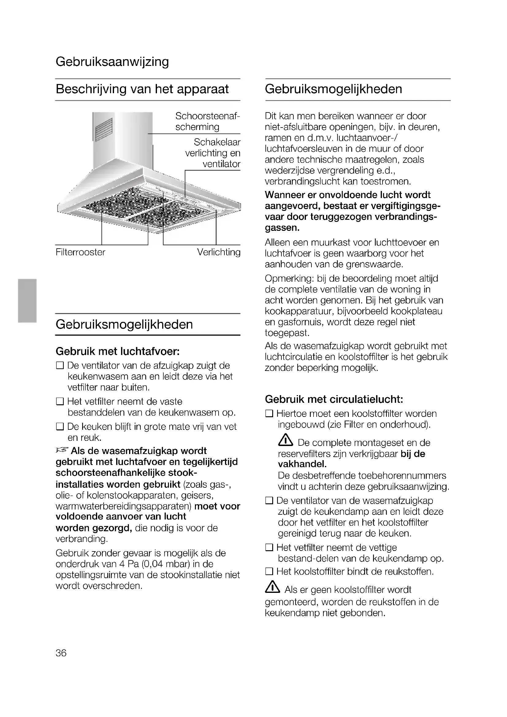 Als de wasemafzuigkap wordt gebruikt met luchtafvoer en tegelijkertijd schoorsteenafhankelijke stook- installaties worden gebruikt (zoals gas-, olie- of kolenstookapparaten, geisers, warmwaterbereidingsapparaten) moet voor voldoende aanvoer van lucht worden gezorgd, die nodig is voor de verbranding. Gebruik zonder gevaar is mogelijk als de onderdruk van 4 Pa (0,04 mbar) in de opstellingsruimte van de stookinstallatie niet wordt overschreden. Dit kan men bereiken wanneer er door niet-afsluitbare openingen, bijv. in deuren, ramen en d.m.v. luchtaanvoer-/ luchtafvoersleuven in de muur of door andere technische maatregelen, zoals wederzijdse vergrendeling e.d., verbrandingslucht kan toestromen. Wanneer er onvoldoende lucht wordt aangevoerd, bestaat er vergiftigingsge- vaar door teruggezogen verbrandings- gassen. Alleen een muurkast voor luchttoevoer en luchtafvoer is geen waarborg voor het aanhouden van de grenswaarde. Opmerking: bij de beoordeling moet altijd de complete ventilatie van de woning in acht worden genomen. Bij het gebruik van kookapparatuur, bijvoorbeeld kookplateau en gasfornuis, wordt deze regel niet toegepast. Als de wasemafzuigkap wordt gebruikt met luchtcirculatie en actieve-koolfilter is het gebruik zonder beperking mogelijk. Als de afvoerlucht door de buitenmuur wordt geleid, moet een telescoop-muur- kast worden gebruikt.