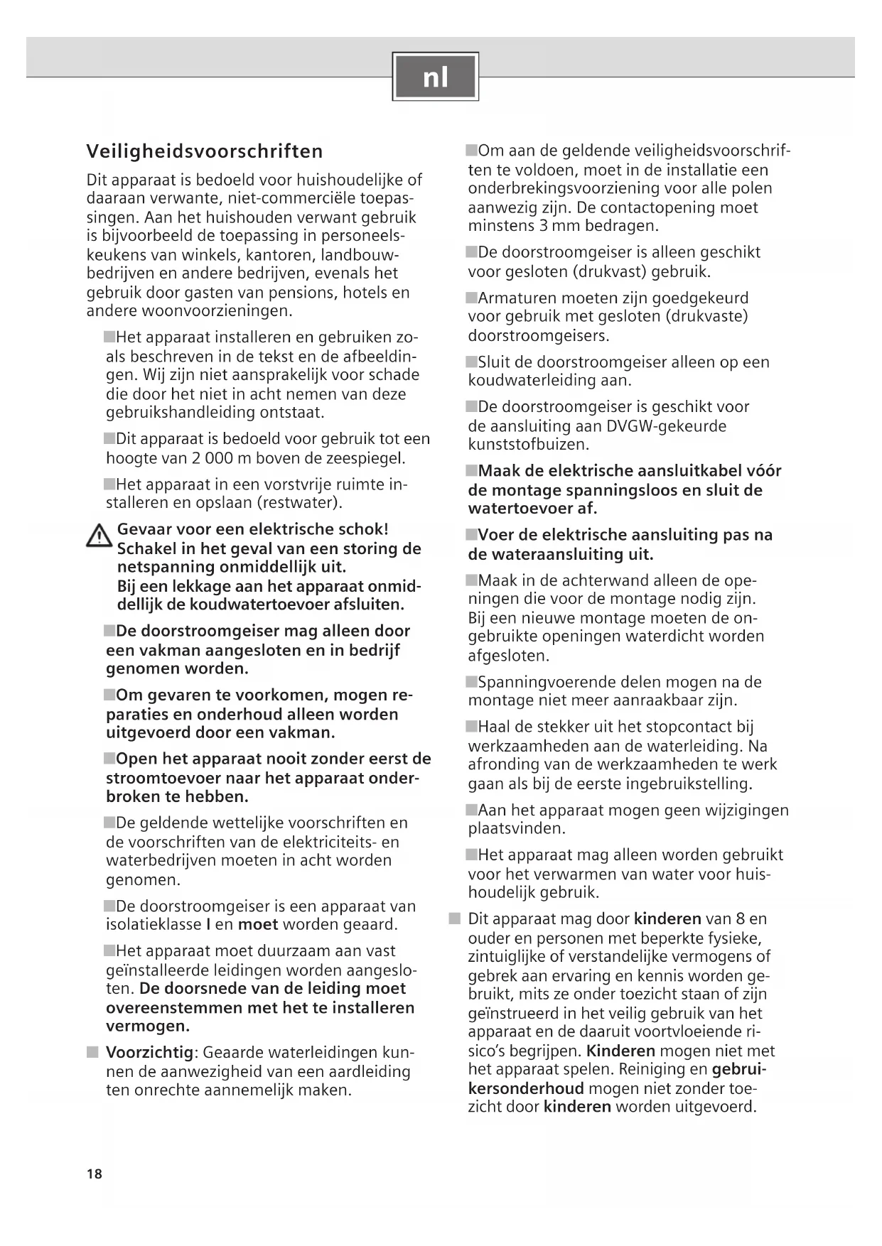Veiligheidsvoorschriften Dit apparaat is bedoeld voor huishoudelijke of daaraan verwante, niet-commerciële toepas- singen. Aan het huishouden verwant gebruik is bijvoorbeeld de toepassing in personeels- keukens van winkels, kantoren, landbouw- bedrijven en andere bedrijven, evenals het gebruik door gasten van pensions, hotels en andere woonvoorzieningen. ■ Het apparaat installeren en gebruiken zo- als beschreven in de tekst en de afbeeldin- gen. Wij zijn niet aansprakelijk voor schade die door het niet in acht nemen van deze gebruikshandleiding ontstaat. ■ Dit apparaat is bedoeld voor gebruik tot een hoogte van 2 000 m boven de zeespiegel. ■ Het apparaat in een vorstvrije ruimte in- stalleren en opslaan (restwater). Gevaar voor een elektrische schok! Schakel in het geval van een storing de netspanning onmiddellijk uit. Bij een lekkage aan het apparaat onmid- dellijk de koudwatertoevoer afsluiten. ■ De doorstroomgeiser mag alleen door een vakman aangesloten en in bedrijf genomen worden. ■ Om gevaren te voorkomen, mogen re- paraties en onderhoud alleen worden uitgevoerd door een vakman. ■ Open het apparaat nooit zonder eerst de stroomtoevoer naar het apparaat onder- broken te hebben. ■ De geldende wettelijke voorschriften en de voorschriften van de elektriciteits- en waterbedrijven moeten in acht worden genomen. ■ De doorstroomgeiser is een apparaat van isolatieklasse I en moet worden geaard. ■ Het apparaat moet duurzaam aan vast geïnstalleerde leidingen worden aangeslo- ten. De doorsnede van de leiding moet overeenstemmen met het te installeren vermogen. ■ Voorzichtig: Geaarde waterleidingen kun- nen de aanwezigheid van een aardleiding ten onrechte aannemelijk maken. ■ Om aan de geldende veiligheidsvoorschrif- ten te voldoen, moet in de installatie een onderbrekingsvoorziening voor alle polen aanwezig zijn. De contactopening moet minstens 3 mm bedragen. ■ De doorstroomgeiser is alleen geschikt voor gesloten (drukvast) gebruik. ■ Armaturen moeten zijn goedgekeurd voor gebruik met gesloten (drukvaste) doorstroomgeisers. ■ Sluit de doorstroomgeiser alleen op een koudwaterleiding aan. ■ De doorstroomgeiser is geschikt voor de aansluiting aan DVGW-gekeurde kunststofbuizen. ■ Maak de elektrische aansluitkabel vóór de montage spanningsloos en sluit de watertoevoer af. ■ Voer de elektrische aansluiting pas na de wateraansluiting uit. ■ Maak in de achterwand alleen de ope- ningen die voor de montage nodig zijn. Bij een nieuwe montage moeten de on- gebruikte openingen waterdicht worden afgesloten. ■ Spanningvoerende delen mogen na de montage niet meer aanraakbaar zijn. ■ Haal de stekker uit het stopcontact bij werkzaamheden aan de waterleiding. Na afronding van de werkzaamheden te werk gaan als bij de eerste ingebruikstelling. ■ Aan het apparaat mogen geen wijzigingen plaatsvinden. ■ Het apparaat mag alleen worden gebruikt voor het verwarmen van water voor huis- houdelijk gebruik. ■ Dit apparaat mag door kinderen van 8 en ouder en personen met beperkte fysieke, zintuiglijke of verstandelijke vermogens of gebrek aan ervaring en kennis worden ge- bruikt, mits ze onder toezicht staan of zijn geïnstrueerd in het veilig gebruik van het apparaat en de daaruit voortvloeiende ri- sico’s begrijpen. Kinderen mogen niet met het apparaat spelen. Reiniging en gebrui- kersonderhoud mogen niet zonder toe- zicht door kinderen worden uitgevoerd.19