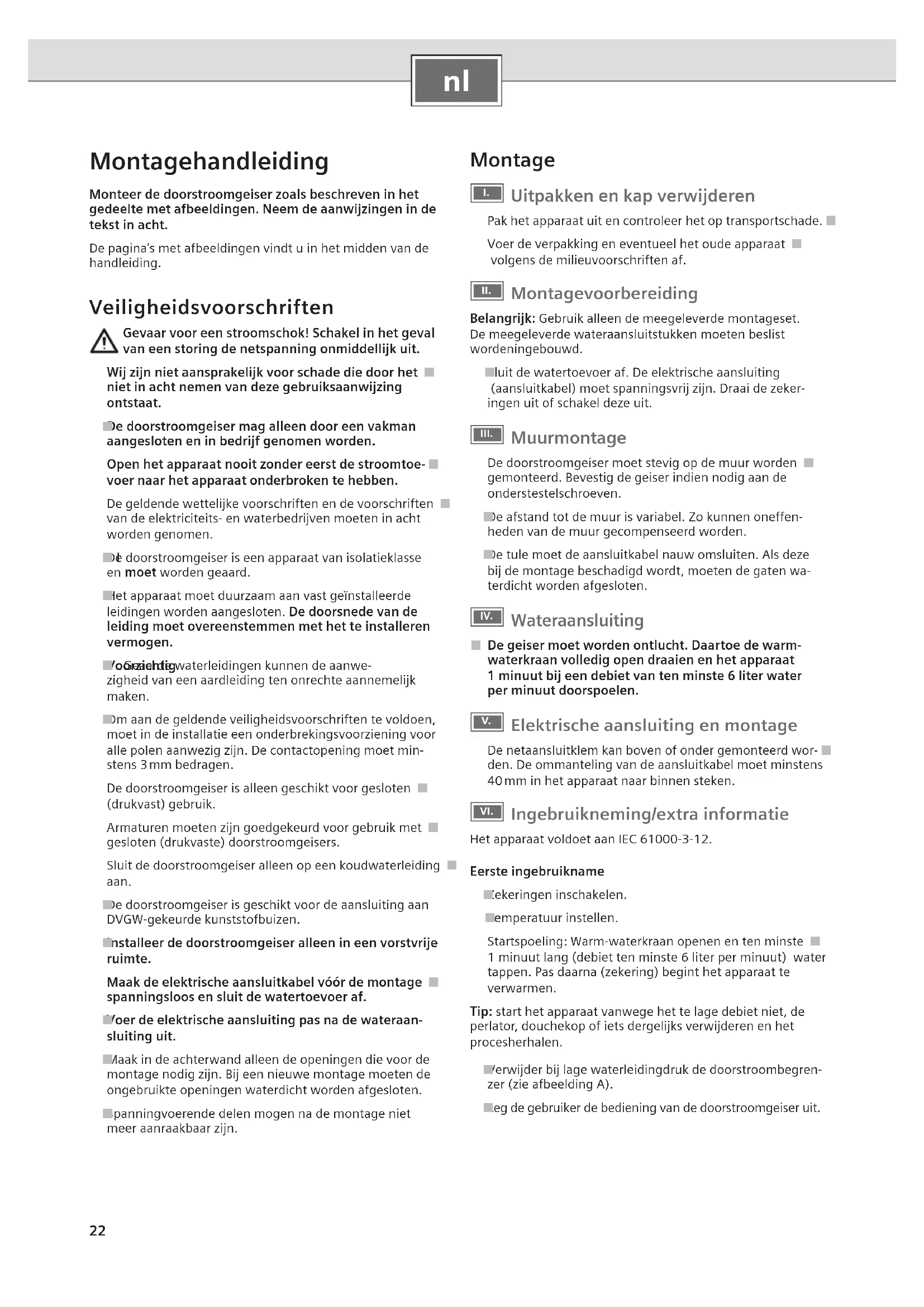 Montagehandleiding Monteer de doorstroomgeiser zoals beschreven in het gedeelte met afbeeldingen. Neem de aanwijzingen in de tekst in acht.De pagina’s met afbeeldingen vindt u in het midden van de handleiding. Veiligheidsvoorschriften Gevaar voor een stroomschok! Schakel in het geval van een storing de netspanning onmiddellijk uit.Wij zijn niet aansprakelijk voor schade die door het ■niet in acht nemen van deze gebruiksaanwijzing ontstaat.De doorstroomgeiser mag alleen door een vakman ■aangesloten en in bedrijf genomen worden.Open het apparaat nooit zonder eerst de stroomtoe- ■voer naar het apparaat onderbroken te hebben.De geldende wettelijke voorschriften en de voorschriften ■van de elektriciteits- en waterbedrijven moeten in acht worden genomen.De doorstroomgeiser is een apparaat van isolatieklasse ■ I en moet worden geaard.Het apparaat moet duurzaam aan vast geïnstalleerde ■leidingen worden aangesloten. De doorsnede van de leiding moet overeenstemmen met het te installeren vermogen.Voorzichtig ■ : Geaarde waterleidingen kunnen de aanwe-zigheid van een aardleiding ten onrechte aannemelijk maken.Om aan de geldende veiligheidsvoorschriften te voldoen, ■moet in de installatie een onderbrekingsvoorziening voor alle polen aanwezig zijn. De contactopening moet min-stens 3 mm bedragen.De doorstroomgeiser is alleen geschikt voor gesloten ■(drukvast) gebruik.Armaturen moeten zijn goedgekeurd voor gebruik met ■gesloten (drukvaste) doorstroomgeisers.Sluit de doorstroomgeiser alleen op een koudwaterleiding ■ aan. De doorstroomgeiser is geschikt voor de aansluiting aan ■DVGW-gekeurde kunststofbuizen.Installeer de doorstroomgeiser alleen in een vorstvrije ■ruimte.Maak de elektrische aansluitkabel vóór de montage ■spanningsloos en sluit de watertoevoer af.Voer de elektrische aansluiting pas na de wateraan- ■sluiting uit.Maak in de achterwand alleen de openingen die voor de ■montage nodig zijn. Bij een nieuwe montage moeten de ongebruikte openingen waterdicht worden afgesloten.Spanningvoerende delen mogen na de montage niet ■meer aanraakbaar zijn. Montage