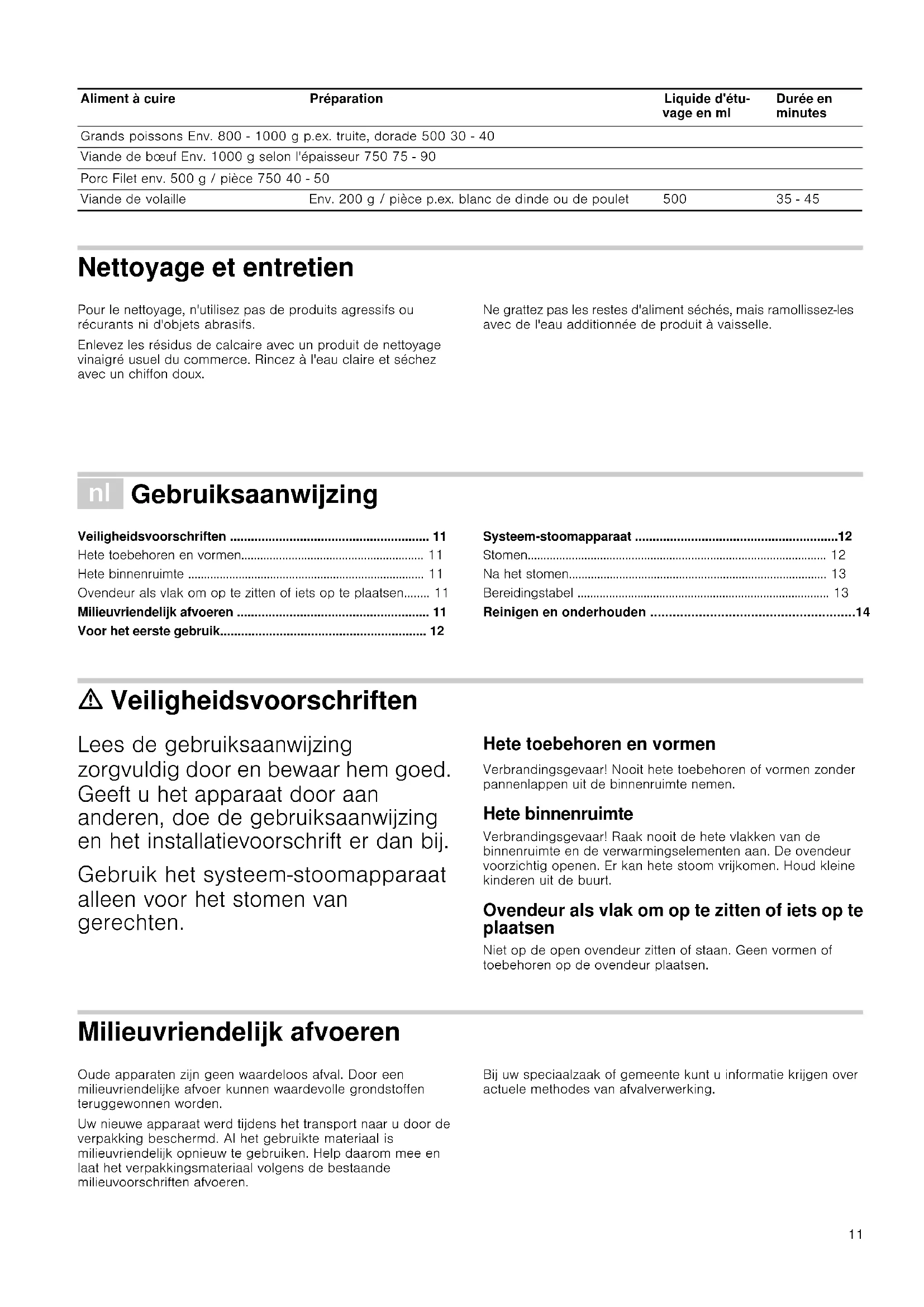 - Reinigen en onderhouden ã=Veiligheidsvoorschriften Lees de gebruiksaanwijzing zorgvuldig door en bewaar hem goed. Geeft u het apparaat door aan anderen, doe de gebruiksaanwijzing en het installatievoorschrift er dan bij. Gebruik het systeem-stoomapparaat alleen voor het stomen van gerechten. Hete toebehoren en vormen Verbrandingsgevaar! Nooit hete toebehoren of vormen zonder pannenlappen uit de binnenruimte nemen. Hete binnenruimte Verbrandingsgevaar! Raak nooit de hete vlakken van de binnenruimte en de verwarmingselementen aan. De ovendeur voorzichtig openen. Er kan hete stoom vrijkomen. Houd kleine kinderen uit de buurt. Ovendeur als vlak om op te zitten of iets op te plaatsen Niet op de open ovendeur zitten of staan. Geen vormen of toebehoren op de ovendeur plaatsen. Milieuvriendelijk afvoeren Oude apparaten zijn geen waardeloos afval. Door een milieuvriendelijke afvoer kunnen waardevolle grondstoffen teruggewonnen worden. Uw nieuwe apparaat werd tijdens het transport naar u door de verpakking beschermd. Al het gebruikte materiaal is milieuvriendelijk opnieuw te gebruiken. Help daarom mee en laat het verpakkingsmateriaal volgens de bestaande milieuvoorschriften afvoeren. Bij uw speciaalzaak of gemeente kunt u informatie krijgen over actuele methodes van afvalverwerking. Grands poissons Env. 800 - 1000 g p.ex. truite, dorade 500 30 - 40 Viande de bœuf Env. 1000 g selon l'épaisseur 750 75 - 90 Porc Filet env. 500 g / pièce 750 40 - 50 Viande de volaille Env. 200 g / pièce p.ex. blanc de dinde ou de poulet 500 35 - 45 Aliment à cuire Préparation Liquide d'étu- vage en ml Durée en minutes12 Voor het eerste gebruik Is het systeem-stoomapparaat beschadigd, dan mag u het niet in gebruik nemen. Maak het systeem-stoomapparaat en alle toebehoren schoon met heet zeepsop. Plak de bijgevoegde beschermfolie onder het vooruitstekende deel van het werkblad. Hiervoor de folie eraf trekken, vastlijmen en bijsnijden. Systeem-stoomapparaat De basis van het systeem-stoomapparaat vormt altijd de ovenpan, het grote stoominzetstuk en het glazen deksel. Voor grote hoeveelheden en voor het klaarmaken van rijst of sauzen kunt u daarnaast de telescooprail met de bakken gebruiken. Gebruik alleen de meegeleverde originele onderdelen. Meer informatie over de bereiding met stoom vindt u in de bijgevoegde brochure. U kunt de ovenpan ook afzonderlijk gebruiken, bijvoorbeeld voor het klaarmaken van grote ovenschotels. Stomen De oven mag tijdens de bereiding niet worden geopend. Uitzondering: wanneer verschillende gerechten worden gecombineerd waarvan de bereidingstijden erg uiteenlopen. De bereidingstijd wordt bepaald door de grootte van het product. Bij het tegelijkertijd garen van levensmiddelen met verschillende bereidingstijden geldt: ■ Snijd het levensmiddel dat een langere bereidingstijd heeft in kleinere stukken. ■ Maak de bereidingstijd voor gevoelige levensmiddelen langer door grotere stukken te garen. In principe wordt voor het stomen 500 ml water (geen gedestilleerd water) gebruikt. Uitzondering: levensmiddelen die opzwellen (bijv. aardappels) en ingrediënten met lange bereidingstijden hebben volgens de bereidingstabel 750 ml water nodig (zie de bereidingstabel of de bijgevoegde brochure). p. 14