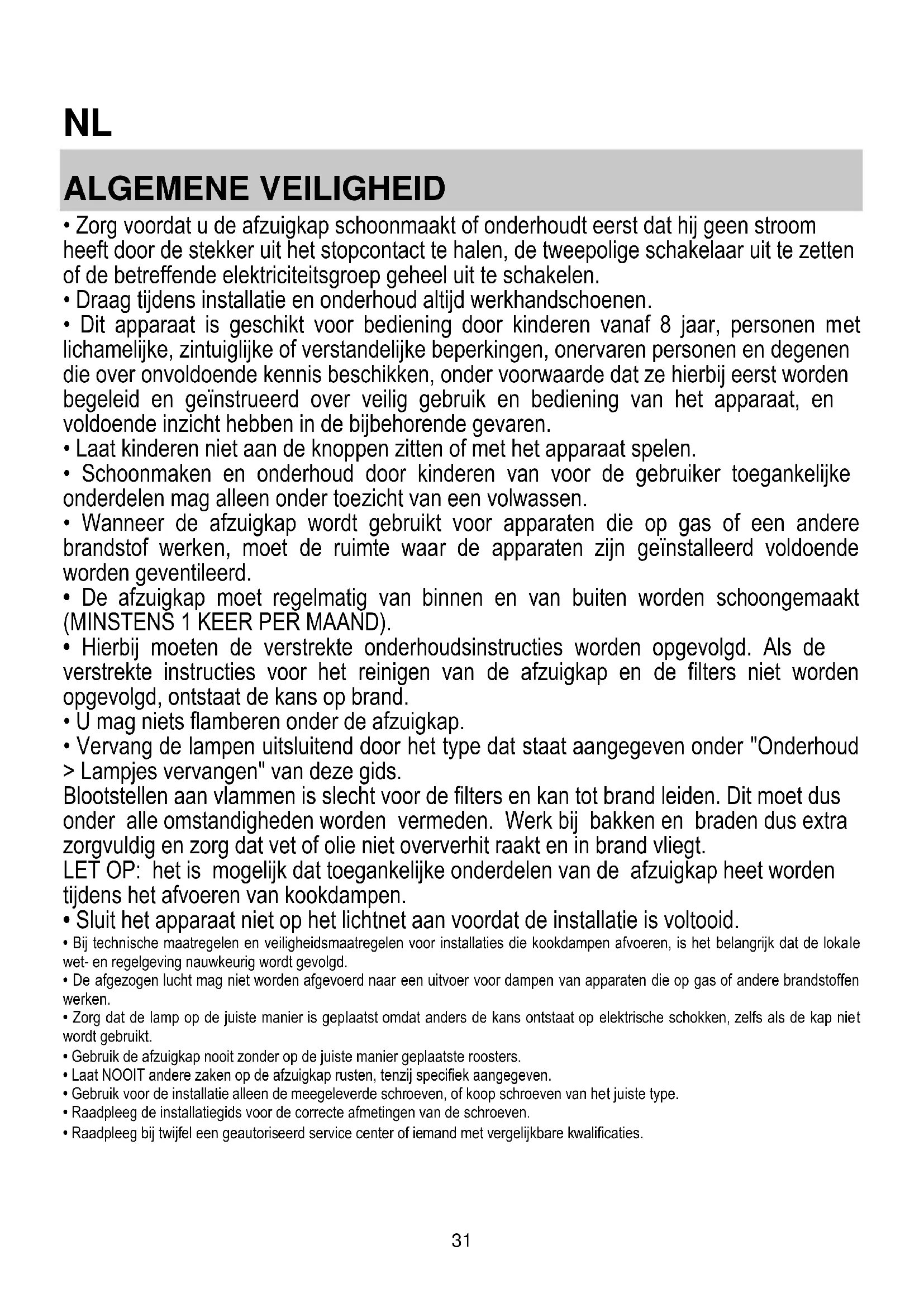 - Laat NOOIT andere zaken op de afzuigkap rusten, tenzij specifiek aangegeven.