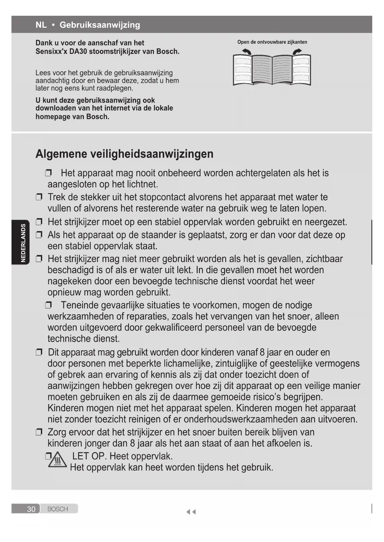 LET OP. Heet oppervlak. Het oppervlak kan heet worden tijdens het gebruik. NL • Gebruiksaanwijzing Dank u voor de aanschaf van het Sensixx'x DA30 stoomstrijkijzer van Bosch. Lees voor het gebruik de gebruiksaanwijzing aandachtig door en bewaar deze, zodat u hem later nog eens kunt raadplegen. U kunt deze gebruiksaanwijzing ook downloaden van het internet via de lokale homepage van Bosch. Open de ontvouwbare zijkanten31 B O S C H
