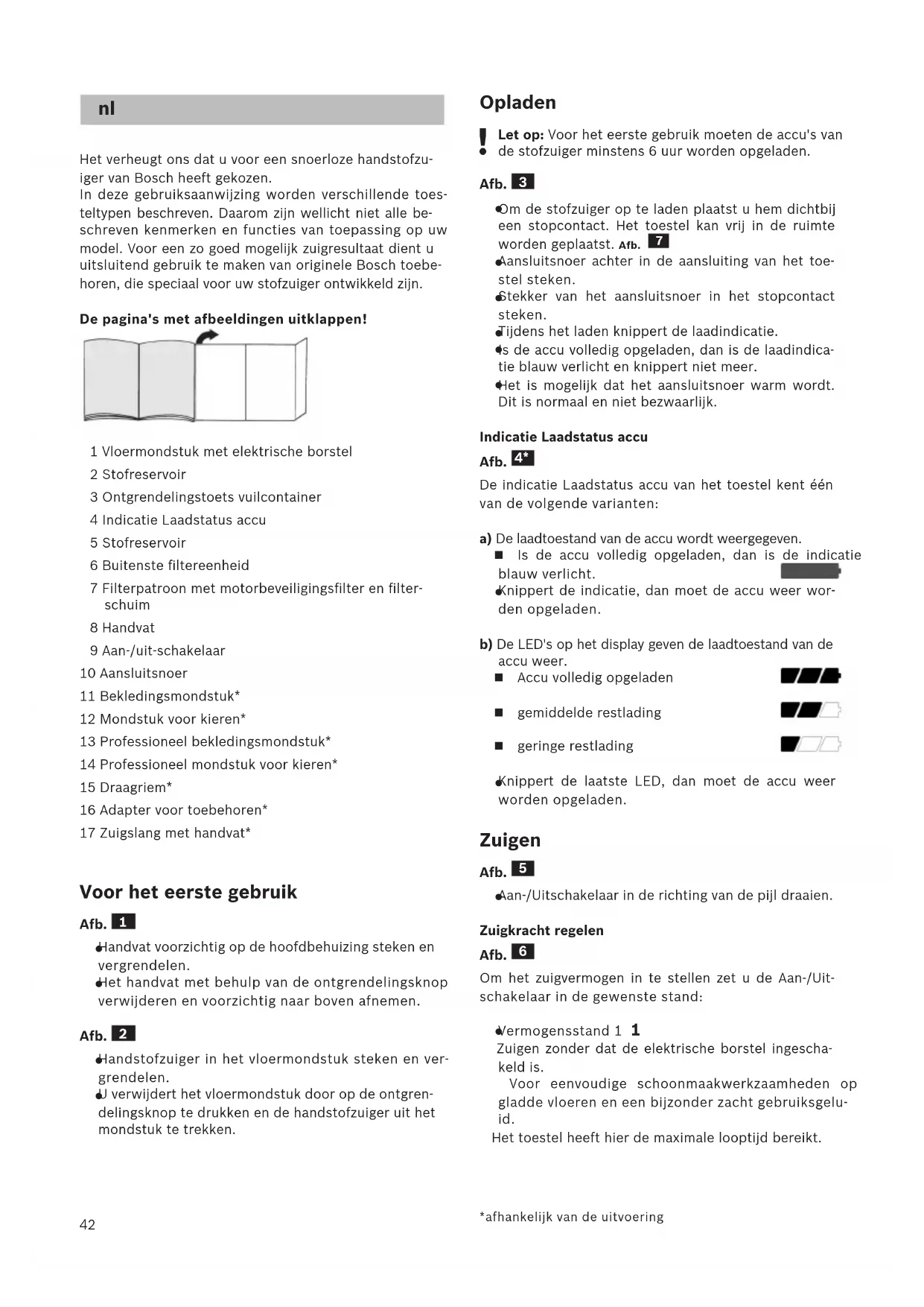 Het verheugt ons dat u voor een snoerloze handstofzu- iger van Bosch heeft gekozen. In deze gebruiksaanwijzing worden verschillende toes- teltypen beschreven. Daarom zijn wellicht niet alle be- schreven kenmerken en functies van toepassing op uw model. Voor een zo goed mogelijk zuigresultaat dient u uitsluitend gebruik te maken van originele Bosch toebe- horen, die speciaal voor uw stofzuiger ontwikkeld zijn. De pagina's met afbeeldingen uitklappen! 1 Vloermondstuk met elektrische borstel 2 Stofreservoir 3 Ontgrendelingstoets vuilcontainer 4 Indicatie Laadstatus accu 5 Stofreservoir 6 Buitenste filtereenheid 7 Filterpatroon met motorbeveiligingsfilter en filter- schuim 8 Handvat 9 Aan-/uit-schakelaar 10 Aansluitsnoer 11 Bekledingsmondstuk* 12 Mondstuk voor kieren* 13 Professioneel bekledingsmondstuk* 14 Professioneel mondstuk voor kieren* 15 Draagriem* 16 Adapter voor toebehoren* 17 Zuigslang met handvat* Voor het eerste gebruik Afb.