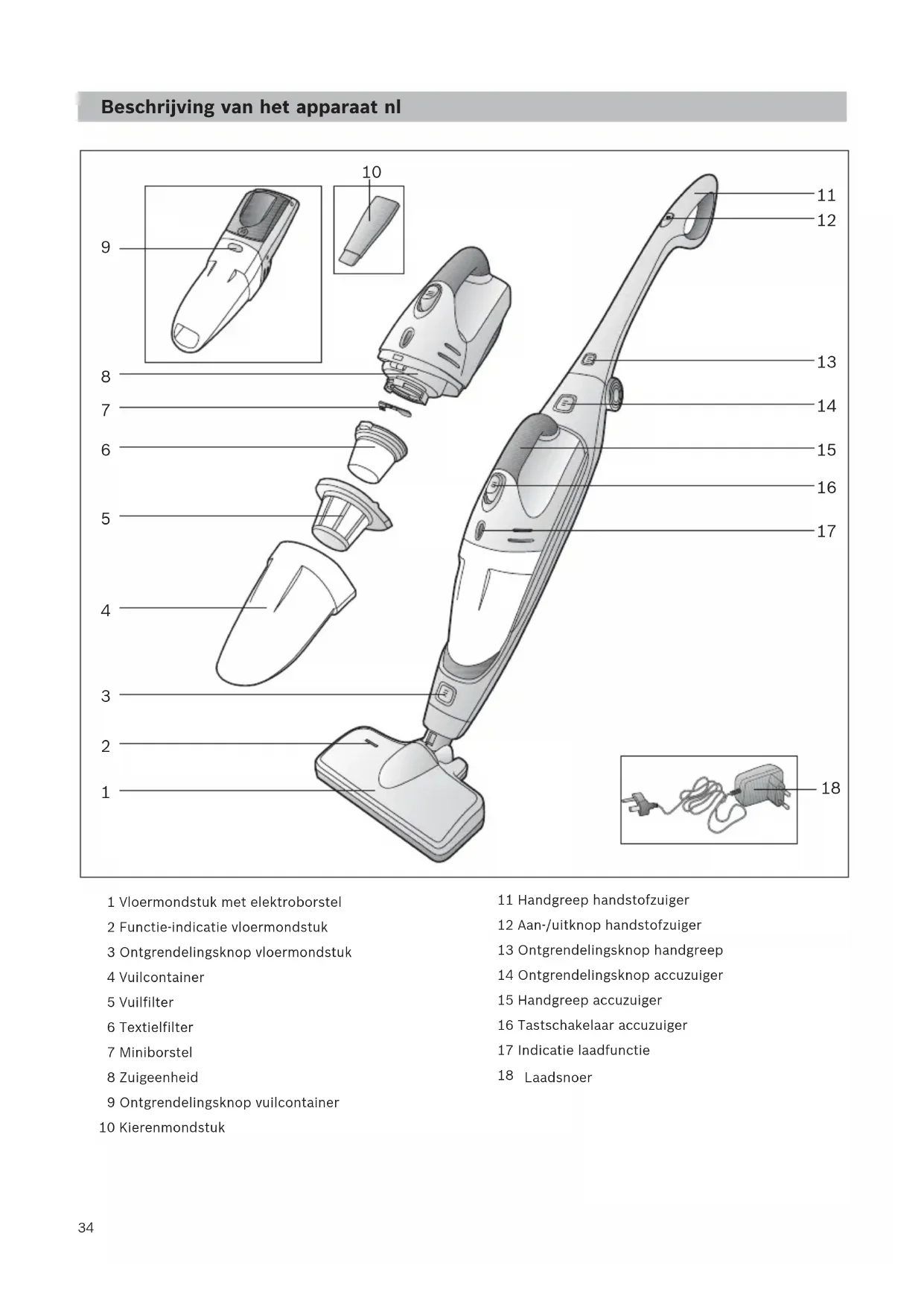 1 Vloermondstuk met elektroborstel 2 Functie-indicatie vloermondstuk 3 Ontgrendelingsknop vloermondstuk 4 Vuilcontainer 5 Vuilfilter 6 Textielfilter 7 Miniborstel 8 Zuigeenheid 9 Ontgrendelingsknop vuilcontainer 10 Kierenmondstuk 11 Handgreep handstofzuiger 12 Aan-/uitknop handstofzuiger 13 Ontgrendelingsknop handgreep 14 Ontgrendelingsknop accuzuiger 15 Handgreep accuzuiger 16 Tastschakelaar accuzuiger 17 Indicatie laadfunctie 18 Laadstation 19 Vloerstaand laadstation 20 Laadsnoer Laadsnoer Beschrijving van het apparaat nl35