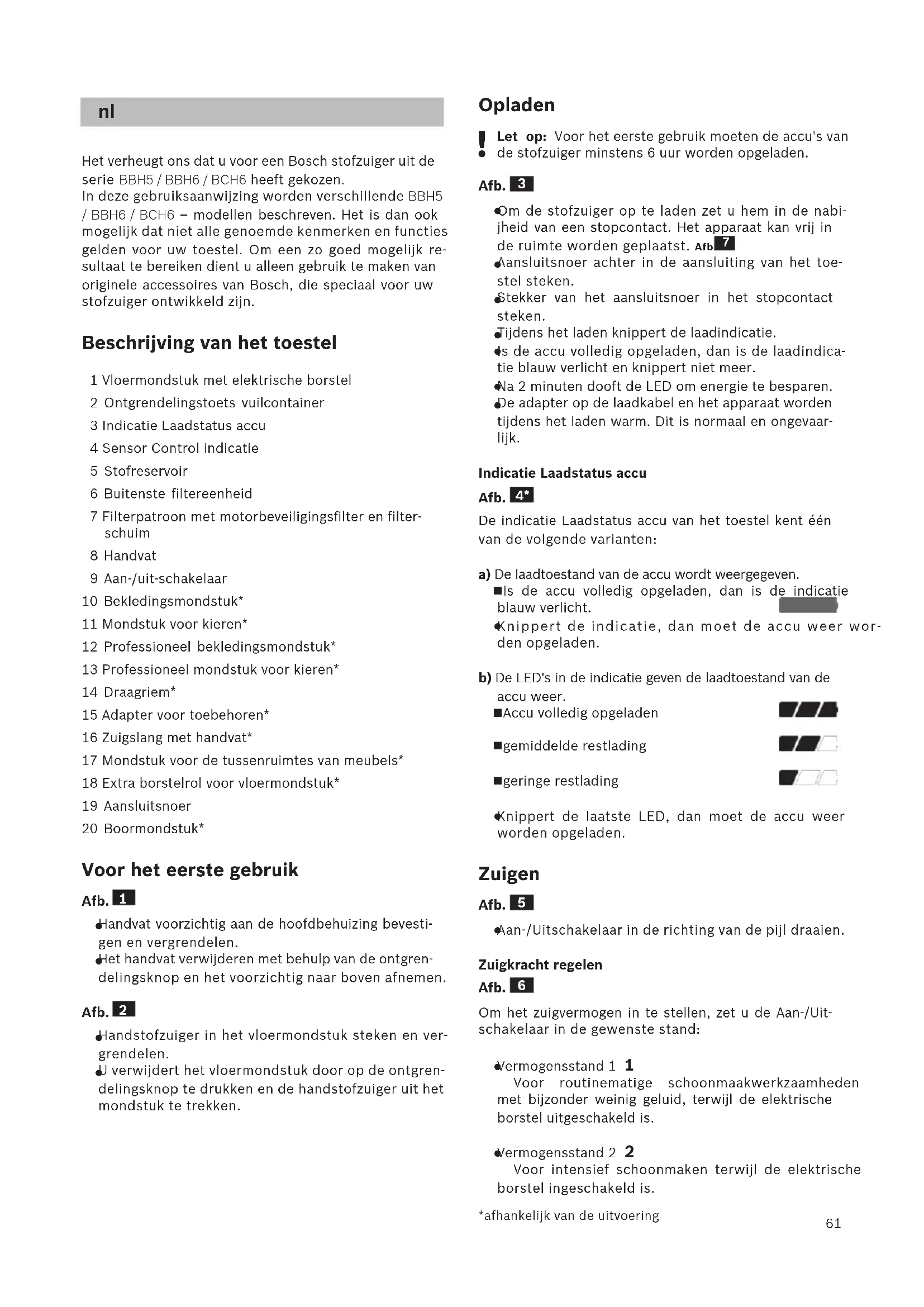 Het verheugt ons dat u voor een Bosch stofzuiger uit de serie BBH5 / BBH6 / BCH6 heeft gekozen. In deze gebruiksaanwijzing worden verschillende BBH5 / BBH6 / BCH6 – modellen beschreven. Het is dan ook mogelijk dat niet alle genoemde kenmerken en functies gelden voor uw toestel. Om een zo goed mogelijk re- sultaat te bereiken dient u alleen gebruik te maken van originele accessoires van Bosch, die speciaal voor uw stofzuiger ontwikkeld zijn. Beschrijving van het toestel 1 Vloermondstuk met elektrische borstel 2 Ontgrendelingstoets vuilcontainer 3 Indicatie Laadstatus accu 4 Sensor Control indicatie 5 Stofreservoir 6 Buitenste filtereenheid 7 Filterpatroon met motorbeveiligingsfilter en filter- schuim 8 Handvat 9 Aan-/uit-schakelaar 10 Bekledingsmondstuk* 11 Mondstuk voor kieren* 12 Professioneel bekledingsmondstuk* 13 Professioneel mondstuk voor kieren* 14 Draagriem* 15 Adapter voor toebehoren* 16 Zuigslang met handvat* 17 Mondstuk voor de tussenruimtes van meubels* 18 Extra borstelrol voor vloermondstuk* 19 Aansluitsnoer 20 Boormondstuk* Voor het eerste gebruik Afb.