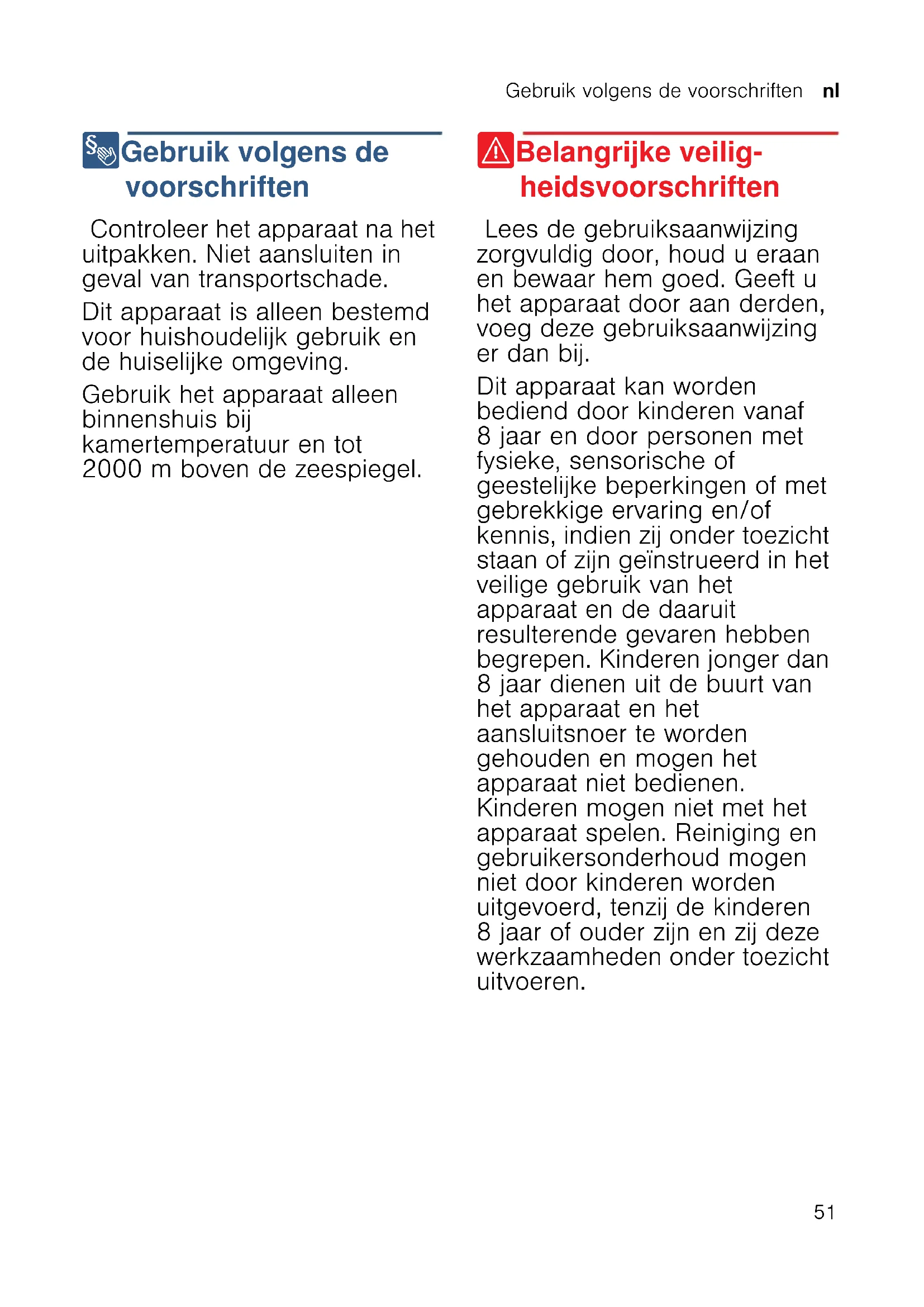 8 Gebruik volgens de voorschriften Gebr ui k vol gens de voor sc hr i f t en Controleer het apparaat na het uitpakken. Niet aansluiten in geval van transportschade. Dit apparaat is alleen bestemd voor huishoudelijk gebruik en de huiselijke omgeving. Gebruik het apparaat alleen binnenshuis bij kamertemperatuur en tot 2000 m boven de zeespiegel. ( Belangrijke veilig- heidsvoorschriften Be l a n g r i j k e veiligheidsvoorschriften Lees de gebruiksaanwijzing zorgvuldig door, houd u eraan en bewaar hem goed. Geeft u het apparaat door aan derden, voeg deze gebruiksaanwijzing er dan bij. Dit apparaat kan worden bediend door kinderen vanaf 8jaar en door personen met fysieke, sensorische of geestelijke beperkingen of met gebrekkige ervaring en/of kennis, indien zij onder toezicht staan of zijn geïnstrueerd in het veilige gebruik van het apparaat en de daaruit resulterende gevaren hebben begrepen. Kinderen jonger dan 8jaar dienen uit de buurt van het apparaat en het aansluitsnoer te worden gehouden en mogen het apparaat niet bedienen. Kinderen mogen niet met het apparaat spelen. Reiniging en gebruikersonderhoud mogen niet door kinderen worden uitgevoerd, tenzij de kinderen 8jaar of ouder zijn en zij deze werkzaamheden onder toezicht uitvoeren.nl Belangrijke veiligheidsvoorschriften