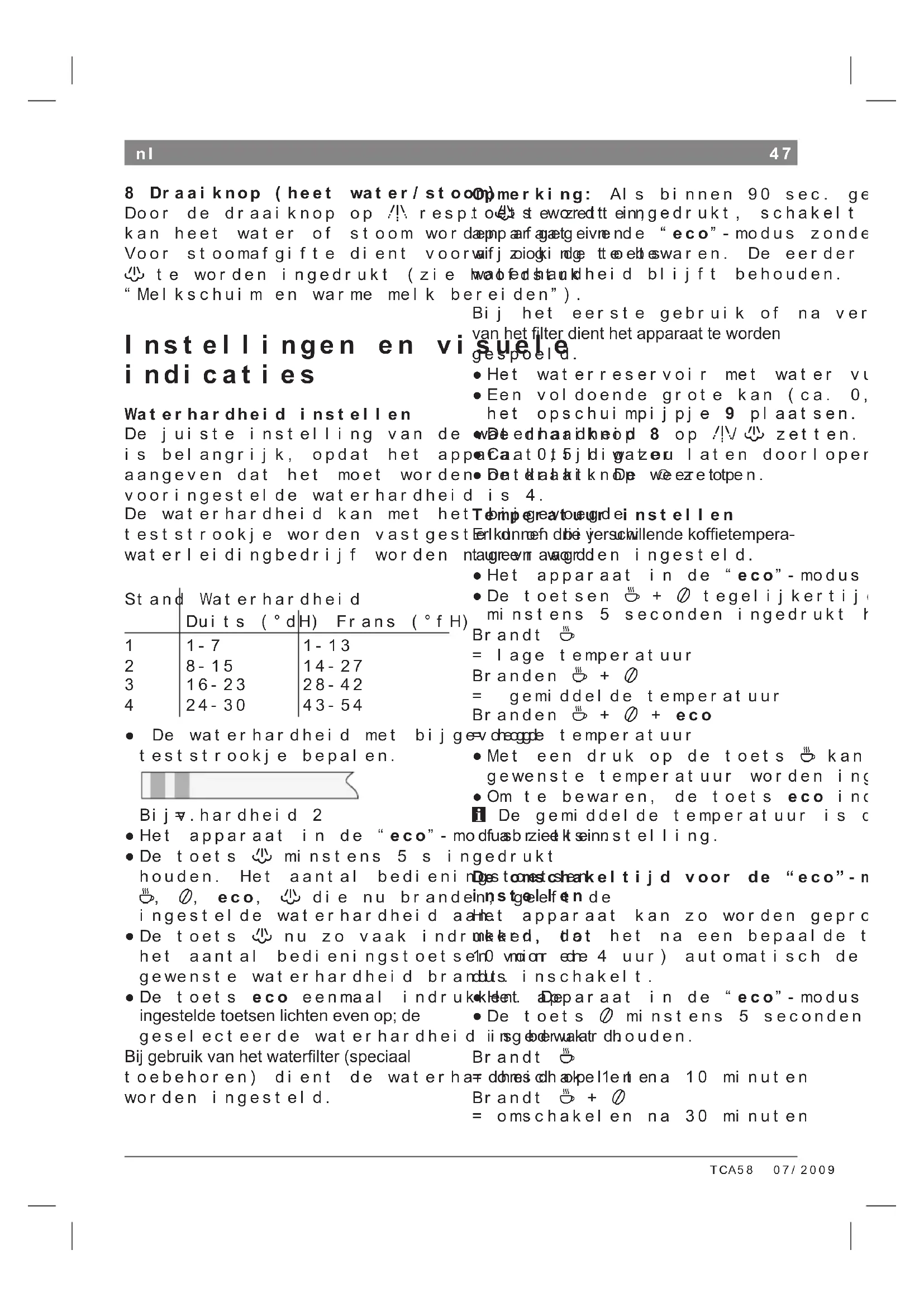 –erkortvoorhetuitschakelenstoomwerd genomen. iHet apparaat is zo geprogrammeerd, datHetapparaatiszogeprogrammeerd,dat hetnaca.10minutenautomatischde “eco”modusinschakelt.Deomschakeltijd kandesgewenstwordenveranderd, ziehoofdstuk“Instellingenenvisuele indicaties”. 7 Toets h (stoom opwarmen)(stoom opwarmen) Dooropdetoetshtedrukken,wordtin hetapparaatstoomaangemaaktvoorhet opschuimenofopwarmen.47 TCA5807/2009