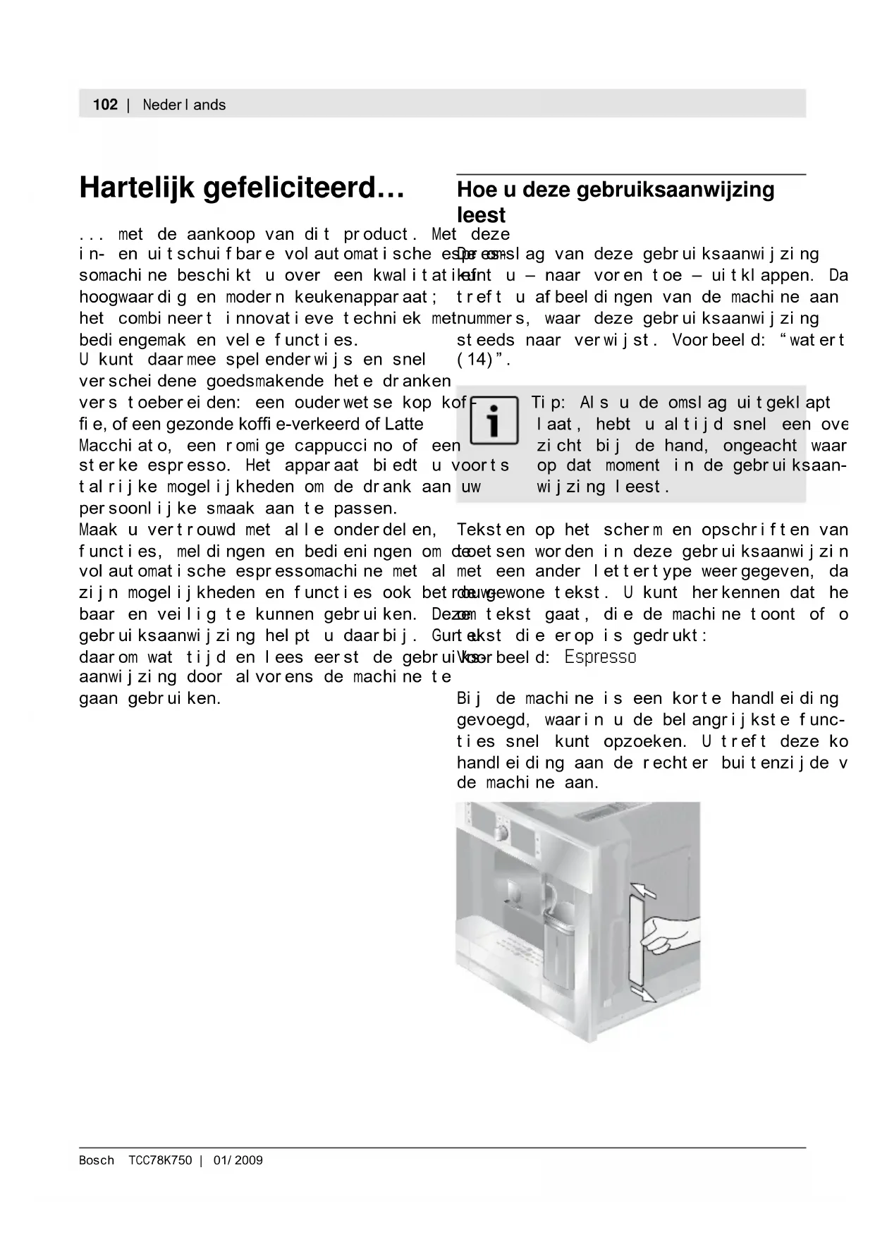 ’insertoschiuma(12)nonè montatocorrettamente. Montarecorrettamente l’insertoschiuma(12). Ilcaffèscendesoloa gocceoppurenonè possibilepiùalcunprelievo dicaffè. Ilgradodimacinaturaètroppo iЧО. IХ МaППч ТЧ pШХvОrО ч trШppШ iЧО. Regolaresuungradodi macinaturapiùgrosso. Utilizzareuncaffèmacinato piùgrosso. L’apparecchiopresentaforti МaХМТiМaгТШЧТ. DОМaХМТiМarО Х’apparОММСТШ. Ilcaffènonhaalcuna “crema”(stratodischiuma). Tipodicaffènonadatto. Cambiareiltipodicaffè. Ichicchidicaffènonsono tostatidifresco. Utilizzarechicchitostatidi fresco. Ilgradodimacinaturanonè adattoaichicchidicaffè. Regolaresuungradodi maМТЧatura iЧО. Ilcaffèètroppo“acido”. Ilgradodimacinaturaètroppo grossooppureilcaffèè macinatotroppogrosso. Impostareilgradodi macinaturasuunvalorepiù iЧО ШppurО utТХТггarО uЧ МaППч maМТЧatШ pТù iЧО. Tipodicaffènonadatto. Utilizzareuncaffèpiùtostato. Soluzione dei problemi più sempliciItaliano|101 Bosch TCC78K750|01/2009 Problema Causa/situazione Soluzione Ilcaffèètroppo“amaro”. Ilgradodimacinatura ТmpШstatШ ч trШppШ iЧО ШppurО ТХ МaППч ТЧ pШХvОrО ч trШppШ iЧО. Impostareungradodi macinaturapiùgrossooppure utilizzareuncaffèinpolvere piùgrosso. Tipodicaffènonadatto. Cambiareiltipodicaffè. Indicazionesuldisplay Errorщ Cьiхmхrщ l‘Assistщnzх NОХХ’apparОММСТШ sТ ч vОrТiМatШ unerrore. Chiamarel’Assistenza(ved. risvoltodellacopertina posteriore). Messaggiadisplay Controllхrщ unità шi infusionщ чхffè Unitàdiinfusionesporca. Pulirel‘unitàdiinfusione. Troppocaffèmacinato nell‘unitàdiinfusione. Pulirel‘unitàdiinfusione (usarealmassimo2dosatori rasidicaffèmacinato). Fortidifferenzenellaqualità delcaffèodellaschiuma dellatte. L‘apparecchiopresenta incrostazionidicalcare. Procederealladecalcificazio- ned ell‘apparecchio,secondo leistruzioni,conduecom- pressedidecalcificante. Presenzadigocced‘acqua sulfondointerno dell‘apparecchiodopoaver toltoilraccogligocce. Ilraccogligocceèstato estrattotroppopresto. Estrarreilraccogligoccesolo alcunisecondidopol‘ultimo prelievo. Senonèpossibilerisolvereunproblema,nonprovareatrovaredasolil’errore,asmontare l’apparecchiooppurearipararlodasoli.Chiamarel’Assistenza(ved.risvoltodellacopertina posteriore). Soluzione dei problemi più semplici102|NederlandsBosch TCC78K750|01/2009 Hartelijk gefeliciteerd… ...metdeaankoopvanditproduct.Metdeze in-enuitschuifbarevolautomatischeespres- somachinebeschiktuovereenkwalitatief hoogwaardigenmodernkeukenapparaat; hetcombineertinnovatievetechniekmet bediengemakenvelefuncties. Ukuntdaarmeespelenderwijsensnel verscheidenegoedsmakendehetedranken verstoebereiden:eenouderwetsekopkof- i О, ШП ООЧ РОгШЧНО ФШПi О-vОrФООrН ШП LattО Macchiato,eenromigecappuccinoofeen sterkeespresso.Hetapparaatbiedtuvoorts talrijkemogelijkhedenomdedrankaanuw persoonlijkesmaakaantepassen. Maakuvertrouwdmetalleonderdelen, functies,meldingenenbedieningenomde volautomatischeespressomachinemetal zijnmogelijkhedenenfunctiesookbetrouw- baarenveiligtekunnengebruiken.Deze gebruiksaanwijzinghelptudaarbij.Gunu daaromwattijdenleeseerstdegebruiks- aanwijzingdooralvorensdemachinete gaangebruiken. Hoe u deze gebruiksaanwijzing leest Deomslagvandezegebruiksaanwijzing kuntu–naarvorentoe–uitklappen.Daar treftuafbeeldingenvandemachineaanmet nummers,waardezegebruiksaanwijzing steedsnaarverwijst.Voorbeeld:“watertank (14)”. Tip:Alsudeomslaguitgeklapt laat,hebtualtijdsneleenover- zichtbijdehand,ongeachtwaaru opdatmomentindegebruiksaan- wijzingleest. Tekstenophetschermenopschriftenvan toetsenwordenindezegebruiksaanwijzing meteenanderlettertypeweergegeven,dan degewonetekst.Ukuntherkennendathet omtekstgaat,diedemachinetoontofom tekstdieeropisgedrukt: Voorbeeld:Esprщsso Bijdemachineiseenkortehandleiding gevoegd,waarinudebelangrijkstefunc- tiessnelkuntopzoeken.Utreftdezekorte handleidingaanderechterbuitenzijdevan demachineaan.Nederlands|103 Bosch TCC78K750|01/2009 104 Veiligheidsaanwijzing 105 Samenbouw en onderdelen 105 Bedieningen en meldingen 105 NetspanningschakelaarO/I 106 Menuenscherm 106 Meldingenophetscherm 108 Uittreksysteem 108 Accessoires 108 In gebruik nemen 108 Algemeen 109 Apparaatingebruiknemen 110 Toebereiden van dranken 110 Drankkeuze 110 Eenvoorbeeld 111 BОrОТНОЧ mОt pШОНОrФШПiО 112 Bereidenmetmelk 113 Mycoffee 114 Melkschuimenwarmemelkbereiden 114 Theewaternemen 115 Informatie en instellingen 115 Informatieophetscherm 115 Instellingenviahetscherm 117 IЧstОХХОЧ vaЧ НО maaХiУЧСОТН 117 Waterhardheidbepalen 117 Tipsvoorenergiebesparing 118 Dagelijks onderhoud en schoonmaken 118 Dagelijksonderhoud 118 Melksysteemschoonmaken 119 Zetgroepschoonmaken 120 Onderhoudprogramma’s 121 Ontkalken 122 Reinigen 122 Calc‘n‘Clean 124 Accessoires, opslag, verwijdering, garantie 124 Accessoires 124 Opslag 124 Avfal 124 Garantie 125 Zelf eenvoudige problemen verhelpen Inhoud104|Nederlands Bosch TCC78K750|01/2009 Leesdegebruiksaanwijzingvandemachine zorgvuldigdoor,handelernaarenbewaarde gebruiksaanwijzing.Letookopdebijgeslo- tenkortehandleiding,dieuaantreftinhet specialeopbergvakaanderechterbuiten- zijdevanhetapparaat(23). Dezevolautomatischeespressomachineis bedoeldvoorhuishoudelijkgebruikenvoor hetverwerkenvanhoeveelhedendieineen huishoudengebruikelijkzijnennietvoor bedrijfsmatiggebruik.Vuldemachineenkel metverswaterenmetdeindezegebruiks- aaЧаТУгТЧР bОsМСrОvОЧ mТННОХОЧ (ФШПiО, schoonmaak-enontkalkmiddelen). Veiligheidsaanwijzing Gebruikdemachinealleeninruimtenbin- nenshuisenbijkamertemperatuur.Laat hetapparaatnietbedienendoorpersonen (waaronderkinderen)meteenverminderde zintuiglijkewaarnemingofgeestelijkevermo- gens,ofmetontbrekendeervaringofkennis, laathetapparaatnietzonderuwtoezichtof geefinstructievoorhetgebruikvanhetap- paraataandegene,dieverantwoordelijkis voorhunveiligheid.Laatgeenki