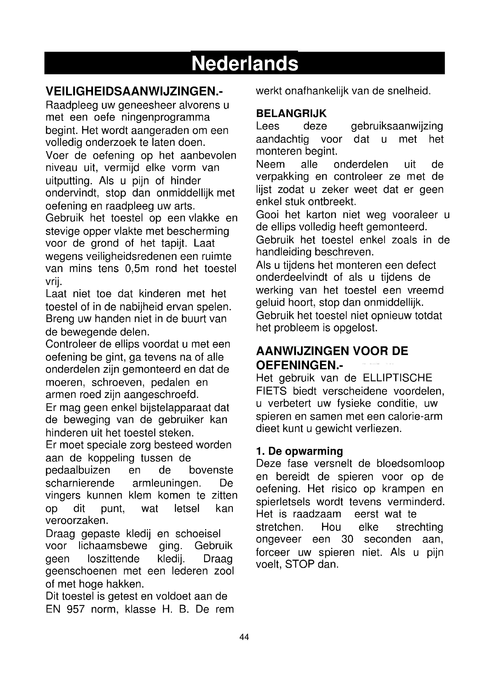 Raadpleeg uw geneesheer alvorens u met een oefe ningenprogramma begint. Het worden aangeraden om een volledig onderzoek te lien doen. Voer de oefening op het aanbevoleniveau uit, vermijd elke vom vanuitputting. Als u pijn of hinder ondervindt, stop dan onmiddelijk met oefening en raadpleeg uw arts. Gebruik het toestel op een vlakke en stevige opper vlakte met bescherming voor de grond of het tapijt. Laat wegens veiligheidsredenen een ruimte van mins tens 0,5m rond het toestel vrij.