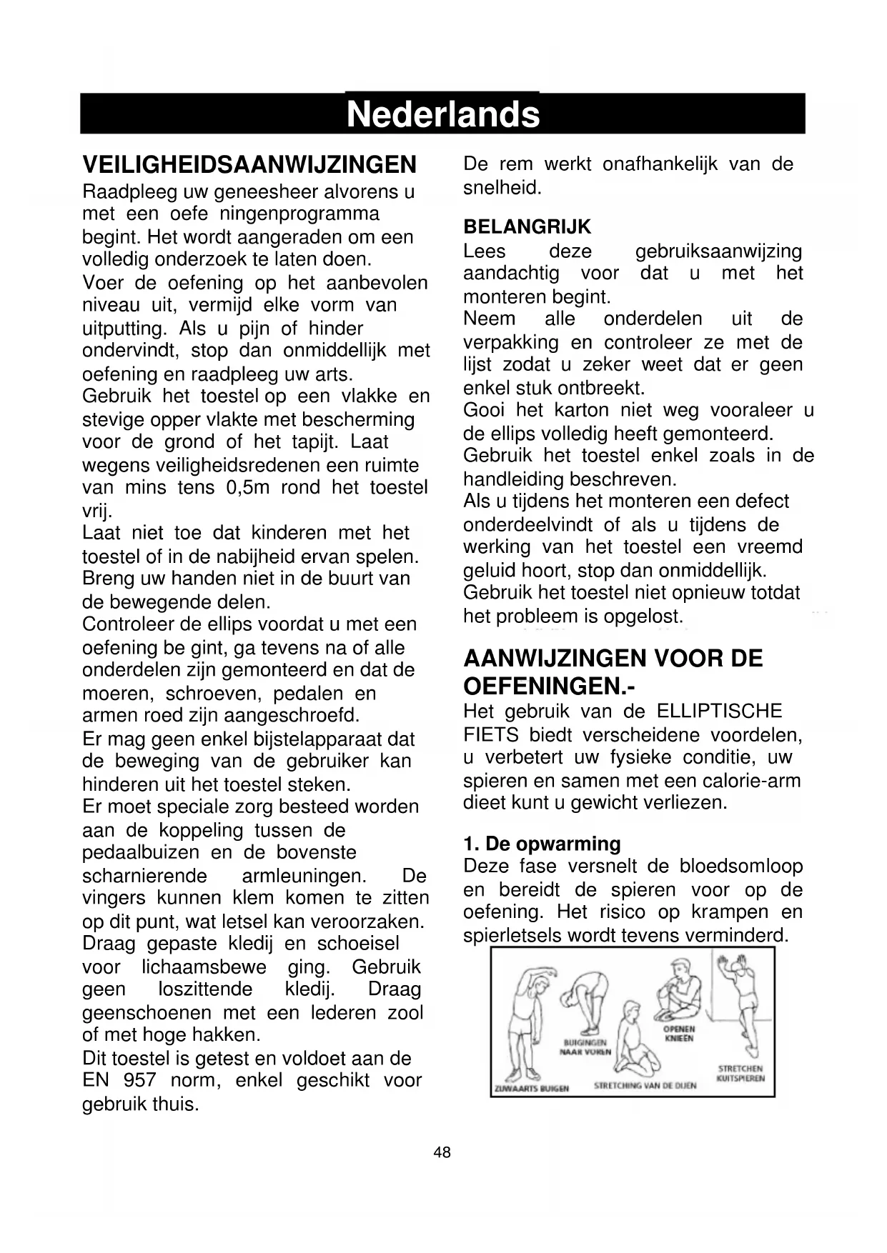 Controleer de ellips voordat u met een oefening be gint, ga tevens na of alle onderdelen zijn gemonteerd en dat de moeren, schroeven, pedalen en armen roed zijn aangeschroefd.