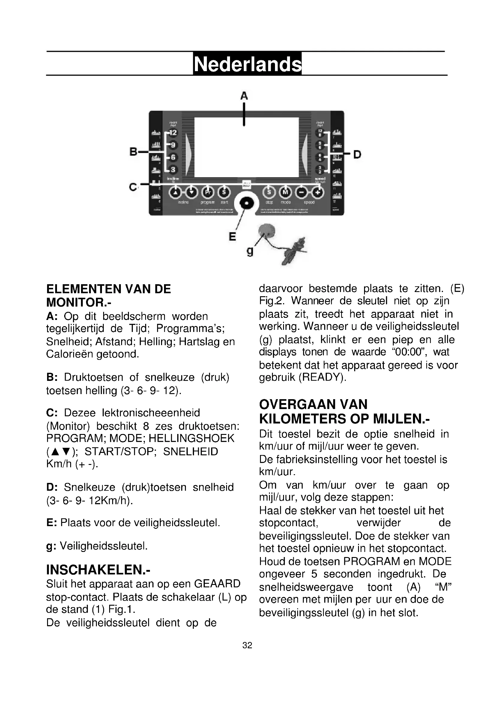 C: Dezee lektronischeenheit (Monitor) beschicht 8 ces druktoetsen: PROGRAM; MODE; HELLINGSHOEK ( ) ; START/STOP; SNELHEID Km/h (+ -).