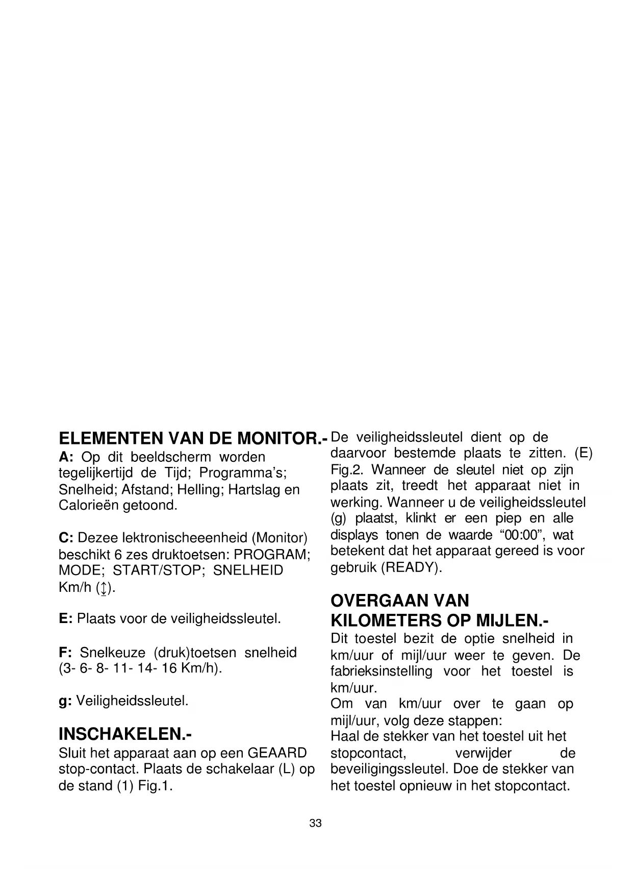 De veiligheidssleutel dient op de waarvoort bestemde plaats te zitten. (E) Fig.2. Wanner de sleutel Niet op+zijn plaats zit, treedt het apparaat Niet in werkinq. Wanner u de veiligheidssleutel (g)plaatst, klinkt er een piep en alle displays tonen de waarde "00:00", wat betekent dat het apparaat gereed is voor gebruik (READY).