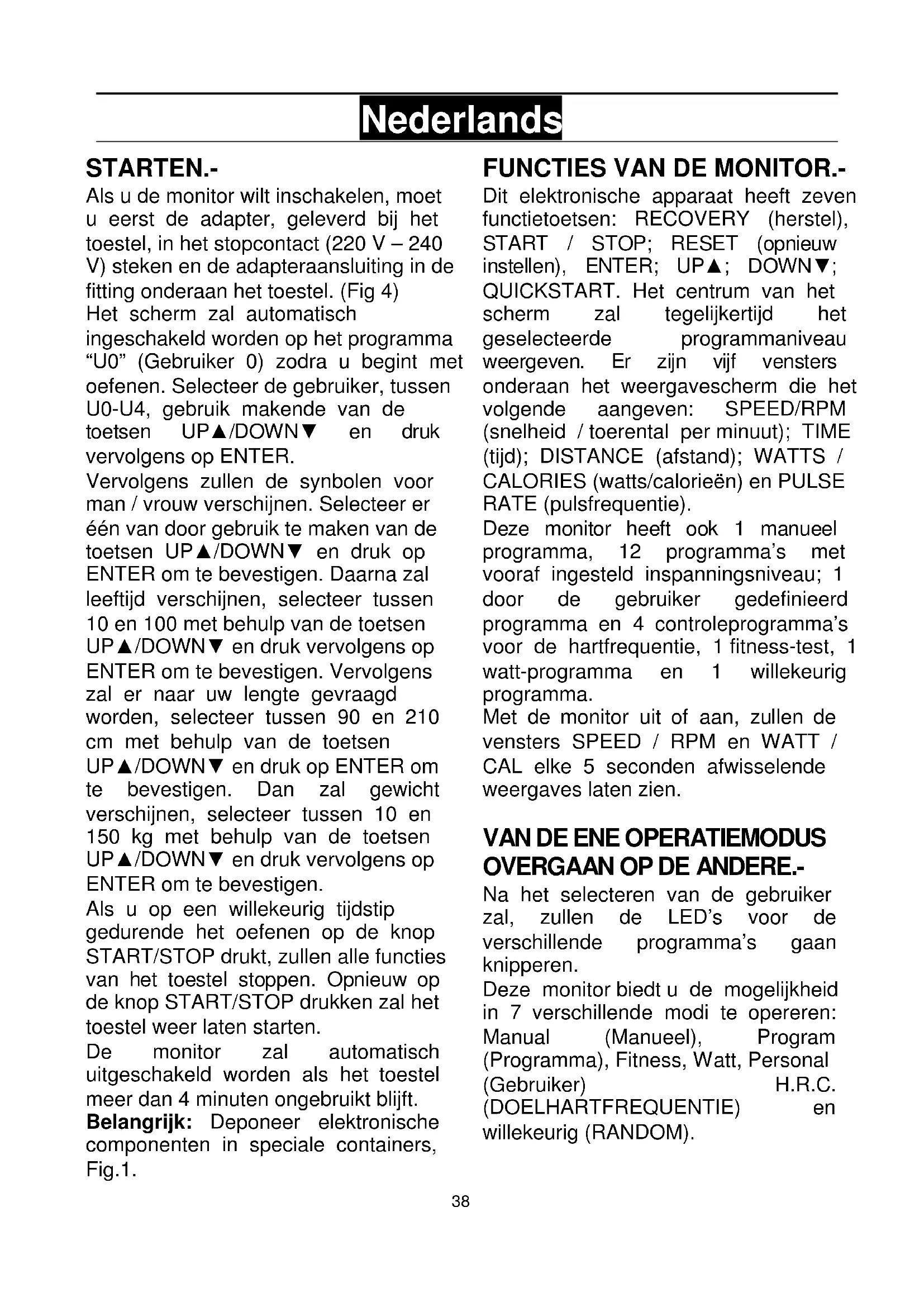 Als u de monitor wilt inschakelen, moet u eerst de adapter, geleverd bij het toestel, in het stopcontact (220 V – 240 V) steken en de adapteraansluiting in de fitting onderaan het toestel. (Fig 4) Het scherm zal automatisch ingeschakeld worden op het programma "U0" (Gebruiker 0) zodra u begint met oefenen. Selecteer de gebruiker, tussen U0-U4, gebruik makende van de toetsen UP▲/DOWN▼ en druk vervolgens op ENTER.