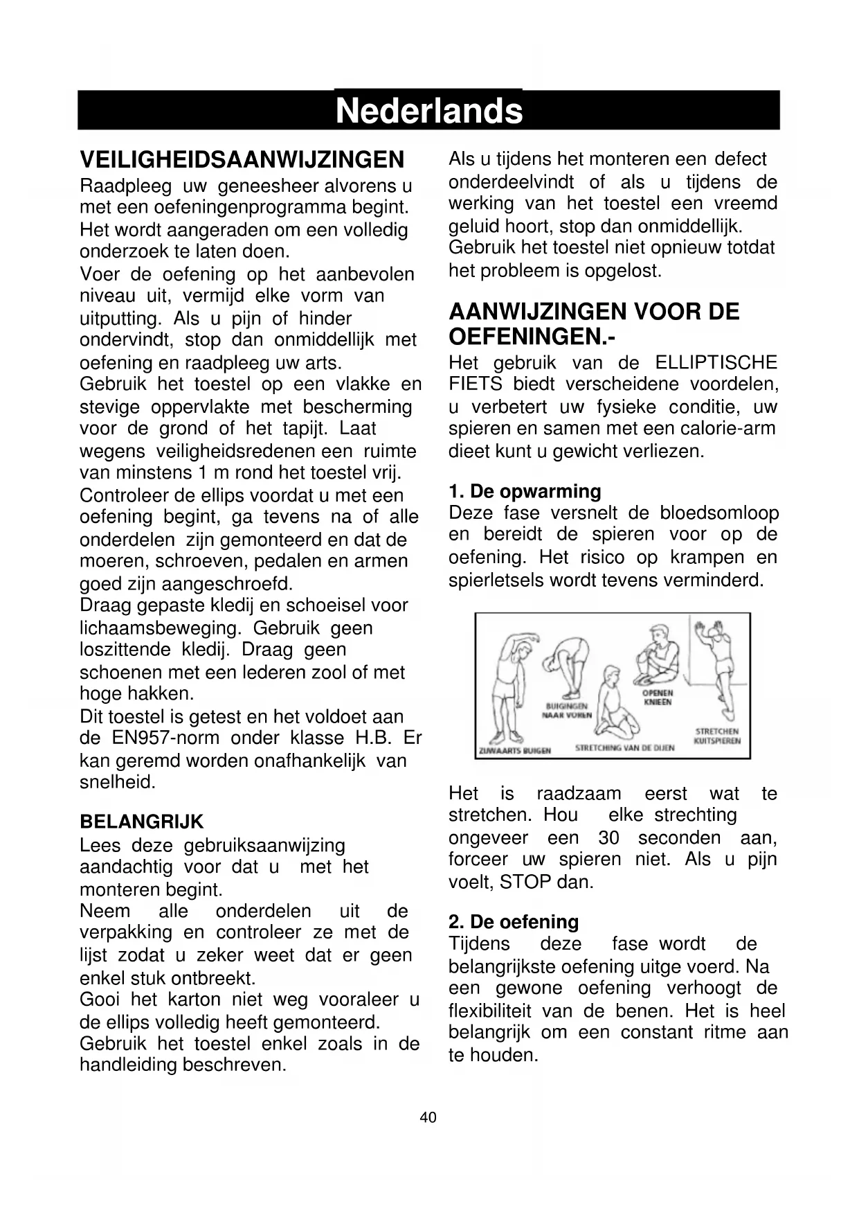 Nederlands VEILIGHEIDSAANWIJZINGEN Raadpleeg uw geneesheer alvorens u met een oefeningenprogramma begint. Het wordt aangeraden om een volledig onderzoek te laten doen. Voer de oefening op het aanbevolen niveau uit, vermijd elke vorm van uitputting. Als u pijn of hinder ondervindt, stop dan onmiddellijk met oefening en raadpleeg uw arts. Gebruik het toestel op een vlakke en stevige oppervlakte met bescherming voor de grond of het tapijt. Laat wegens veiligheidsredenen een ruimte van minstens 1 m rond het toestel vrij. Controleer de ellips voordat u met een oefening begint, ga tevens na of alle onderdelen zijn gemonteerd en dat de moeren, schroeven, pedalen en armen goed zijn aangeschroefd. Draag gepaste kledij en schoeisel voor lichaamsbeweging. Gebruik geen loszittende kledij. Draag geen schoenen met een lederen zool of met hoge hakken. Dit toestel is getest en het voldoet aan de EN957-norm onder klasse H.B. Er kan geremd worden onafhankelijk van snelheid. BELANGRIJK Lees deze gebruiksaanwijzing aandachtig voor dat u met het monteren begint. Neem alle onderdelen uit de verpakking en controleer ze met de lijst zodat u zeker weet dat er geen enkel stuk ontbreekt. Gooi het karton niet weg vooraleer u de ellips volledig heeft gemonteerd. Gebruik het toestel enkel zoals in de handleiding beschreven. Als u tijdens het monteren een defect onderdeelvindt of als u tijdens de werking van het toestel een vreemd geluid hoort, stop dan onmiddellijk. Gebruik het toestel niet opnieuw totdat het probleem is opgelost.