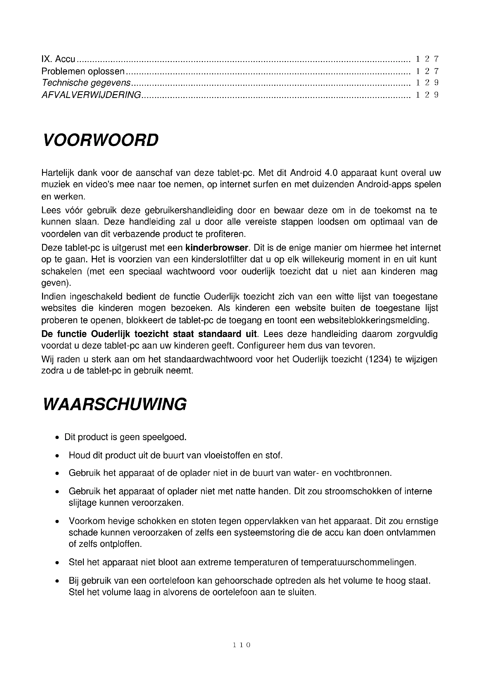 IX. Accu ................................................................................................................................. 127 Problemen oplossen .............................................................................................................. 127 Technische gegevens ............................................................................................................ 129 AFVALVERWIJDERING ........................................................................................................ 129 VOORWOORD Hartelijk dank voor de aanschaf van deze tablet-pc. Met dit Android 4.0 apparaat kunt overal uw muziek en video's mee naar toe nemen, op internet surfen en met duizenden Android-apps spelen en werken. Lees vóór gebruik deze gebruikershandleiding door en bewaar deze om in de toekomst na te kunnen slaan. Deze handleiding zal u door alle vereiste stappen loodsen om optimaal van de voordelen van dit verbazende product te profiteren. Deze tablet-pc is uitgerust met een kinderbrowser. Dit is de enige manier om hiermee het internet op te gaan. Het is voorzien van een kinderslotfilter dat u op elk willekeurig moment in en uit kunt schakelen (met een speciaal wachtwoord voor ouderlijk toezicht dat u niet aan kinderen mag geven). Indien ingeschakeld bedient de functie Ouderlijk toezicht zich van een witte lijst van toegestane websites die kinderen mogen bezoeken. Als kinderen een website buiten de toegestane lijst proberen te openen, blokkeert de tablet-pc de toegang en toont een websiteblokkeringsmelding. De functie Ouderlijk toezicht staat standaard uit. Lees deze handleiding daarom zorgvuldig voordat u deze tablet-pc aan uw kinderen geeft. Configureer hem dus van tevoren. Wij raden u sterk aan om het standaardwachtwoord voor het Ouderlijk toezicht (1234) te wijzigen zodra u de tablet-pc in gebruik neemt. WAARSCHUWING