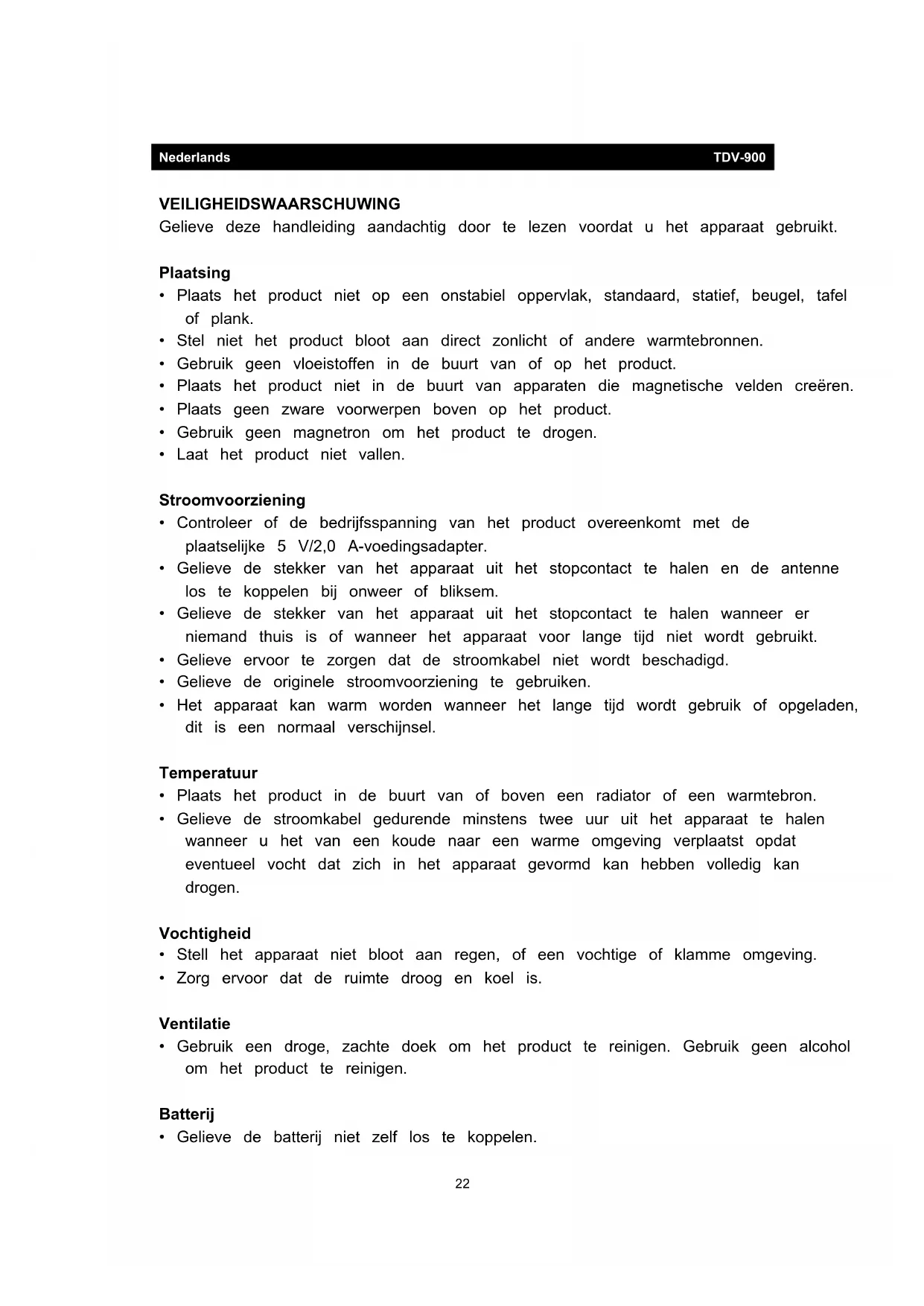 Videosysteem PAL Bedrijfstijd ongeveer 2,5 uur wanneer het apparaat volledig opgeladen is Batterijcapaciteit 4000 mAh/3,7 V Kenmerken en specificaties kunnen zonder voorafgaande kennisgeving worden gewijzigd. Garantie Lenco biedt service en garantie aan overeenkomstig met de Europese wetgeving. Dit houdt in dat u, in het geval van reparaties (zowel tijdens als na de garantieperiode), uw lokale handelaar moet contacteren. Belangrijke opmerking: Het is niet mogelijk om producten die moeten worden gerepareerd direct naar Lenco te sturen. Belangrijke opmerking: De garantie verloopt als een onofficieel servicecenter het apparaat op wat voor manier dan ook heeft geopend, of er toegang toe heeft gekregen. Het apparaat is niet geschikt voor professioneel gebruik. In het geval van professioneel gebruik worden alle garantieverplichtingen van de fabrikant nietig verklaard. Disclaimer Er worden regelmatig updates in de firmware en/of hardwarecomponenten gemaakt. Daardoor kunnen gedeelten van de instructie, de specificaties en afbeeldingen in deze documentatie enigszins verschillen van uw eigen situatie. Alle onderwerpen die staan beschreven in deze handleiding zijn bedoeld als illustratie en zijn niet van toepassing op specifieke situaties. Aan de beschrijving in dit document kunnen geen rechten worden ontleend. Afvoer van het oude apparaat Dit symbool geeft aan dat het betreffende elektrische product of de batterij niet mag worden verwijderd als algemeen huishoudelijk afval in Europa. Zorg voor een juiste afvalverwerking door het product en de batterij in overeenstemming met alle van toepassing zijnde lokale wetten voor het verwijderen van elektrische apparatuur of batterijen te verwijderen. Als u dit doet, helpt u de natuurlijke hulpbronnen te behouden en de standaard van milieubescherming te verbeteren bij de behandeling en verwijdering40 van elektrisch afval (Afgedankte Elektrische en Elektronische Apparatuur). Service Bezoek voor meer informatie en helpdeskondersteuning www.lenco.com Lenco Benelux BV, Thermiekstraat 1a, 6361 HB, Nederland.41 Deutsch TDV-900 SICHERHEITSHINWEISE Lesen Sie diese Bedienungsanleitung vor dem Gebrauch des Geräts sorgfältig durch. Standort
