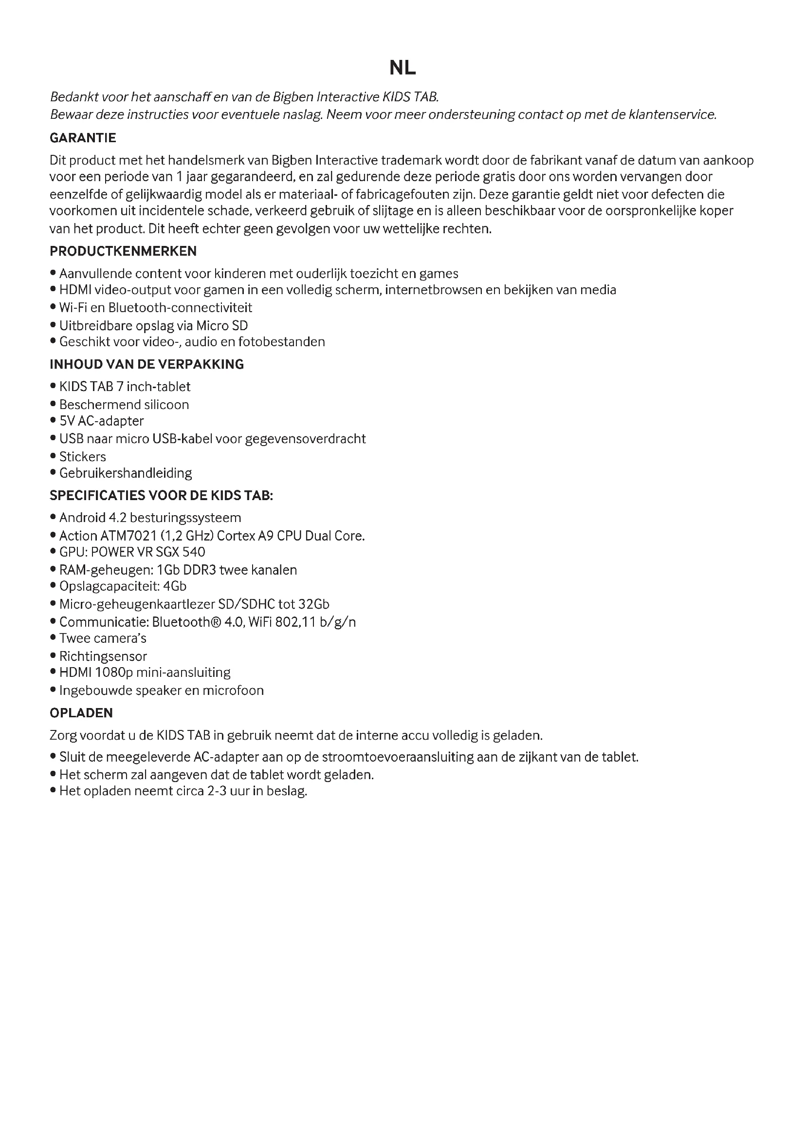 Bedankt voor het aanschaff en van de Bigben Interactive KIDS TAB.