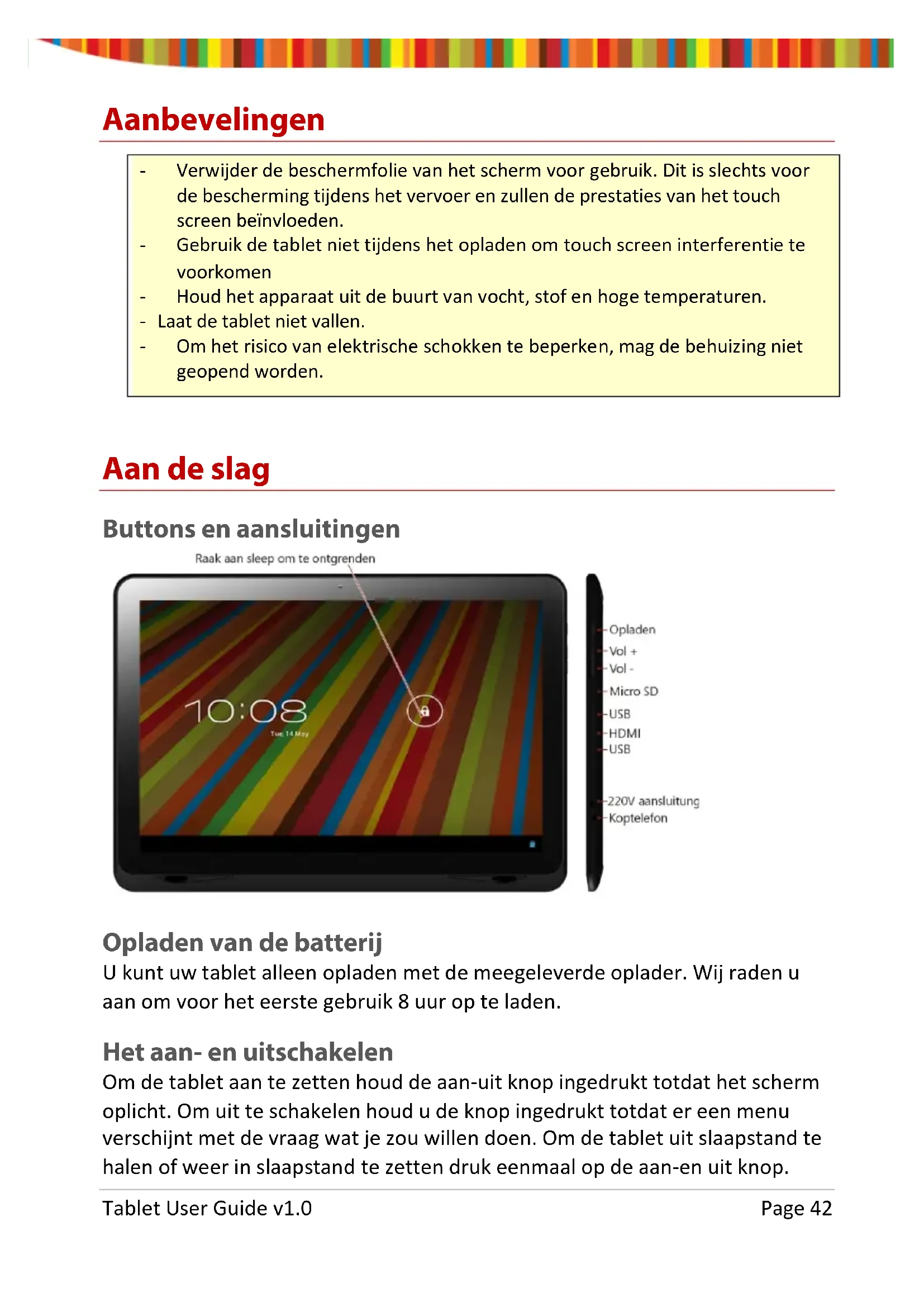 Tablet User Guide v1.0 Page 41Aanbevelingen - Verwijder de beschermfolie van het scherm voor gebruik. Dit is slechts voor de bescherming tijdens het vervoer en zullen de prestaties van het touch screen beïnvloeden. - Gebruik de tablet niet tijdens het opladen om touch screen interferentie te voorkomen - Houd het apparaat uit de buurt van vocht, stof en hoge temperaturen. - Laat de tablet niet vallen. - Om het risico van elektrische schokken te beperken, mag de behuizing niet geopend worden. Aan de slag Buttons en aansluitingen Opladen van de batterij U kunt uw tablet alleen opladen met de meegeleverde oplader. Wij raden u aan om voor het eerste gebruik 8 uur op te laden. Het aan- en uitschakelen Om de tablet aan te zetten houd de aan-uit knop ingedrukt totdat het scherm oplicht. Om uit te schakelen houd u de knop ingedrukt totdat er een menu verschijnt met de vraag wat je zou willen doen. Om de tablet uit slaapstand te halen of weer in slaapstand te zetten druk eenmaal op de aan-en uit knop. Tablet User Guide v1.0 Page 42Het scherm ontgrendelen Voor het gebruik van de tablet moet het scherm ontgrendeld worden. Om dit te doen plaats de vinger op het slotje en sleep naar de andere kant van het scherm. Het scherm vergrendelen Standaard vergrendelt de tablet zich als hij 1 minuut niet gebruikt wordt. Om het scherm handmatig te vergrendelen, druk op de aan- en uit knop. Het scherm wordt leeg gemaakt en het toestel wordt vergrendeld. Gebruik van het touch screen Het capacitieve touch screen zorgt voor een vloeiende en responsieve touch- ervaring zonder kracht uit te oefenen op het scherm.