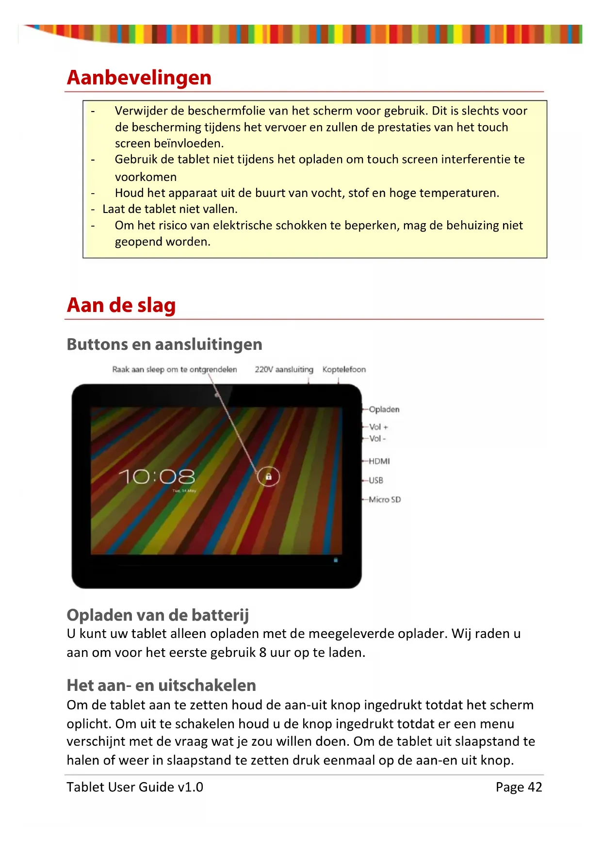 Tablet User Guide v1.0 Page 41Aanbevelingen - Verwijder de beschermfolie van het scherm voor gebruik. Dit is slechts voor de bescherming tijdens het vervoer en zullen de prestaties van het touch screen beïnvloeden. - Gebruik de tablet niet tijdens het opladen om touch screen interferentie te voorkomen - Houd het apparaat uit de buurt van vocht, stof en hoge temperaturen. - Laat de tablet niet vallen. - Om het risico van elektrische schokken te beperken, mag de behuizing niet geopend worden. Aan de slag Buttons en aansluitingen Opladen van de batterij U kunt uw tablet alleen opladen met de meegeleverde oplader. Wij raden u aan om voor het eerste gebruik 8 uur op te laden. Het aan- en uitschakelen Om de tablet aan te zetten houd de aan-uit knop ingedrukt totdat het scherm oplicht. Om uit te schakelen houd u de knop ingedrukt totdat er een menu verschijnt met de vraag wat je zou willen doen. Om de tablet uit slaapstand te halen of weer in slaapstand te zetten druk eenmaal op de aan-en uit knop. Tablet User Guide v1.0 Page 42Het scherm ontgrendelen Voor het gebruik van de tablet moet het scherm ontgrendeld worden. Om dit te doen plaats de vinger op het slotje en sleep naar de andere kant van het scherm. Het scherm vergrendelen Standaard vergrendelt de tablet zich als hij 1 minuut niet gebruikt wordt. Om het scherm handmatig te vergrendelen, druk op de aan- en uit knop. Het scherm wordt leeg gemaakt en het toestel wordt vergrendeld. Gebruik van het touch screen Het capacitieve touch screen zorgt voor een vloeiende en responsieve touch- ervaring zonder kracht uit te oefenen op het scherm.