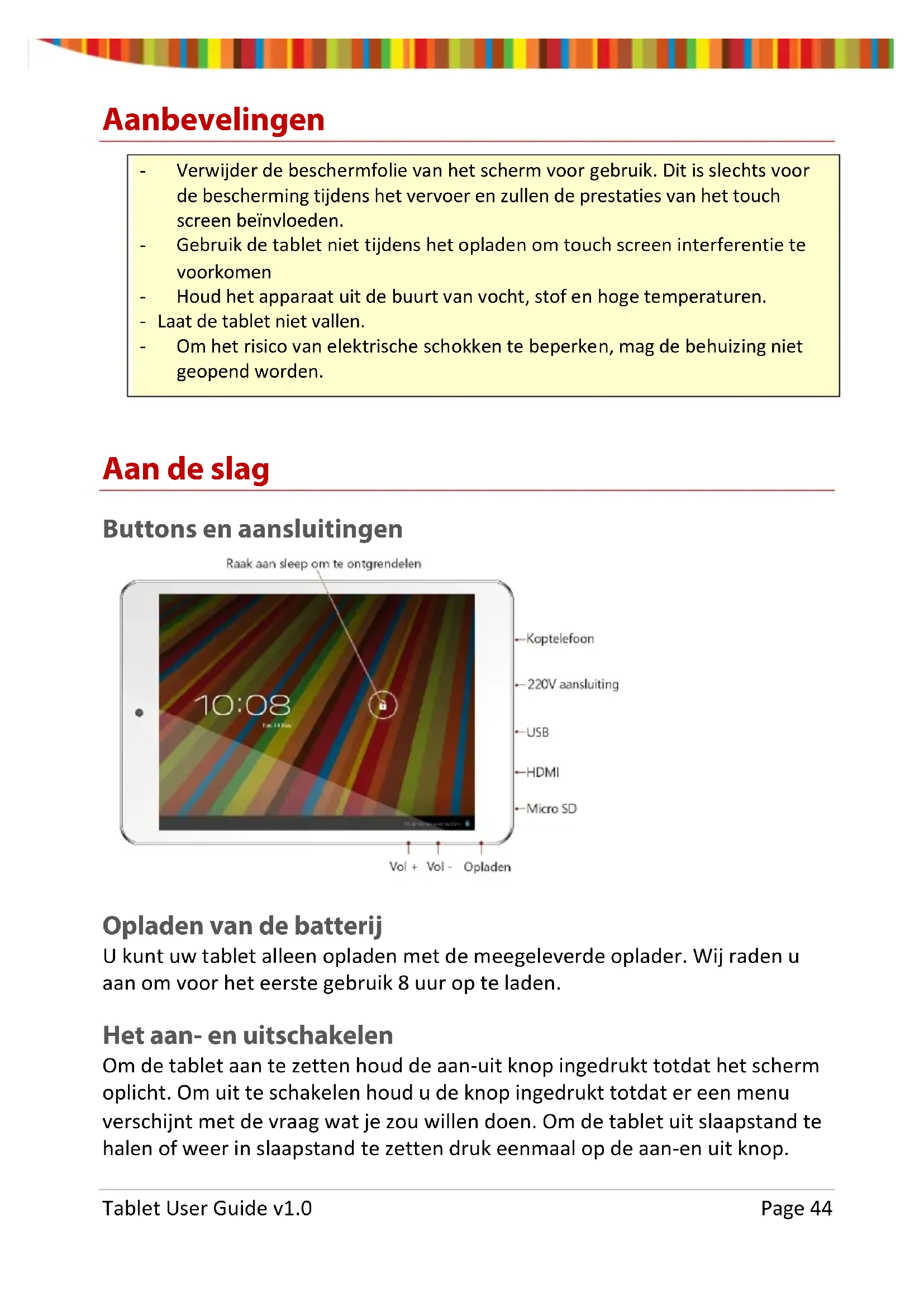 Tablet User Guide v1.0 Page 43Aanbevelingen - Verwijder de beschermfolie van het scherm voor gebruik. Dit is slechts voor de bescherming tijdens het vervoer en zullen de prestaties van het touch screen beïnvloeden. - Gebruik de tablet niet tijdens het opladen om touch screen interferentie te voorkomen - Houd het apparaat uit de buurt van vocht, stof en hoge temperaturen. - Laat de tablet niet vallen. - Om het risico van elektrische schokken te beperken, mag de behuizing niet geopend worden. Aan de slag Buttons en aansluitingen Opladen van de batterij U kunt uw tablet alleen opladen met de meegeleverde oplader. Wij raden u aan om voor het eerste gebruik 8 uur op te laden. Het aan- en uitschakelen Om de tablet aan te zetten houd de aan-uit knop ingedrukt totdat het scherm oplicht. Om uit te schakelen houd u de knop ingedrukt totdat er een menu verschijnt met de vraag wat je zou willen doen. Om de tablet uit slaapstand te halen of weer in slaapstand te zetten druk eenmaal op de aan-en uit knop. Tablet User Guide v1.0 Page 44Het scherm ontgrendelen Voor het gebruik van de tablet moet het scherm ontgrendeld worden. Om dit te doen plaats de vinger op het slotje en sleep naar de andere kant van het scherm. Het scherm vergrendelen Standaard vergrendelt de tablet zich als hij 1 minuut niet gebruikt wordt. Om het scherm handmatig te vergrendelen, druk op de aan- en uit knop. Het scherm wordt leeg gemaakt en het toestel wordt vergrendeld. Gebruik van het touch screen Het capacitieve touch screen zorgt voor een vloeiende en responsieve touch- ervaring zonder kracht uit te oefenen op het scherm.