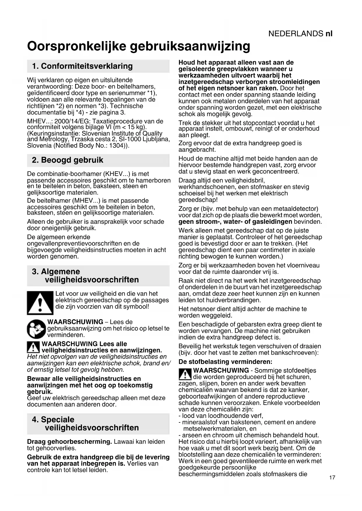 Oorspronkelijke gebruiksaanwijzing Wij verklaren op eigen en uitsluitende verantwoording: Deze boor- en beitelhamers, geïdentificeerd door type en serienummer *1), voldoen aan alle relevante bepalingen van de richtlijnen *2) en normen *3). Technische documentatie bij *4) - zie pagina 3. MHEV...: 2000/14/EG: Taxatieprocedure van de conformiteit volgens bijlage VI (m < 15 kg). (Keuringsinstantie: Slovenian Institute of Quality and Metrology, Trzaska cesta 2, SI-1000 Ljubljana, Slovenia (Notified Body No.: 1304)). De combinatie-boorhamer (KHEV...) is met passende accessoires geschikt om te hamerboren en te beitelen in beton, baksteen, steen en gelijksoortige materialen. De beitelhamer (MHEV...) is met passende accessoires geschikt om te beitelen in beton, baksteen, steen en gelijksoortige materialen. Alleen de gebruiker is aansprakelijk voor schade door oneigenlijk gebruik. De algemeen erkende ongevallenpreventievoorschriften en de bijgevoegde veiligheidsinstructies moeten in acht worden genomen. Let voor uw veiligheid en die van het elektrisch gereedschap op de passages die zijn voorzien van dit symbool! WAARSCHUWING – Lees de gebruiksaanwijzing om het risico op letsel te verminderen. WAARSCHUWING Lees alle veiligheidsinstructies en aanwijzingen. Het niet opvolgen van de veiligheidsinstructies en aanwijzingen kan een elektrische schok, brand en/ of ernstig letsel tot gevolg hebben. Bewaar alle veiligheidsinstructies en aanwijzingen met het oog op toekomstig gebruik. Geef uw elektrisch gereedschap alleen met deze documenten aan anderen door. Draag gehoorbescherming. Lawaai kan leiden tot gehoorverlies. Gebruik de extra handgreep die bij de levering van het apparaat inbegrepen is. Verlies van controle kan tot letsel leiden. Houd het apparaat alleen vast aan de geïsoleerde greepvlakken wanneer u werkzaamheden uitvoert waarbij het inzetgereedschap verborgen stroomleidingen of het eigen netsnoer kan raken. Door het contact met een onder spanning staande leiding kunnen ook metalen onderdelen van het apparaat onder spanning worden gezet, met een elektrische schok als mogelijk gevolg. Trek de stekker uit het stopcontact voordat u het apparaat instelt, ombouwt, reinigt of er onderhoud aan pleegt. Zorg ervoor dat de extra handgreep goed is aangebracht. Houd de machine altijd met beide handen aan de hiervoor bestemde handgrepen vast, zorg ervoor dat u stevig staat en werk geconcentreerd. Draag altijd een veiligheidsbril, werkhandschoenen, een stofmasker en stevig schoeisel bij het werken met elektrisch gereedschap! Zorg er (bijv. met behulp van een metaaldetector) voor dat zich op de plaats die bewerkt moet worden, geen stroom-, water- of gasleidingen bevinden. Werk alleen met gereedschap dat op de juiste manier is geplaatst. Controleer of het gereedschap goed is bevestigd door er aan te trekken. (Het gereedschap dient een paar centimeter in axiale richting bewogen te kunnen worden.) Zorg er bij werkzaamheden boven het vloerniveau voor dat de ruimte daaronder vrij is. Raak niet direct na het werk het inzetgereedschap of onderdelen in de buurt van het inzetgereedschap aan, omdat deze zeer heet kunnen zijn en kunnen leiden tot huidverbrandingen. Het netsnoer dient altijd achter de machine te worden weggeleid. Een beschadigde of gebarsten extra greep dient te worden vervangen. De machine niet gebruiken indien de extra handgreep defect is. Beveilig het werkstuk tegen verschuiven of draaien (bijv. door het vast te zetten met bankschroeven): De stofbelasting verminderen: WAARSCHUWING - Sommige stofdeeltjes die worden geproduceerd bij het schuren, zagen, slijpen, boren en ander werk bevatten chemicaliën waarvan bekend is dat ze kanker, geboorteafwijkingen of andere reproductieve schade kunnen veroorzaken. Enkele voorbeelden van deze chemicaliën zijn: - lood van loodhoudende verf, - mineraalstof van bakstenen, cement en andere metselwerkmaterialen, en - arseen en chroom uit chemisch behandeld hout. Het risico dat u hierbij loopt varieert, afhankelijk van hoe vaak u met dit soort werk bezig bent. Om de blootstelling aan deze chemicaliën te verminderen: Werk in een goed geventileerde ruimte en werk met goedgekeurde persoonlijke beschermingsmiddelen zoals stofmaskers die