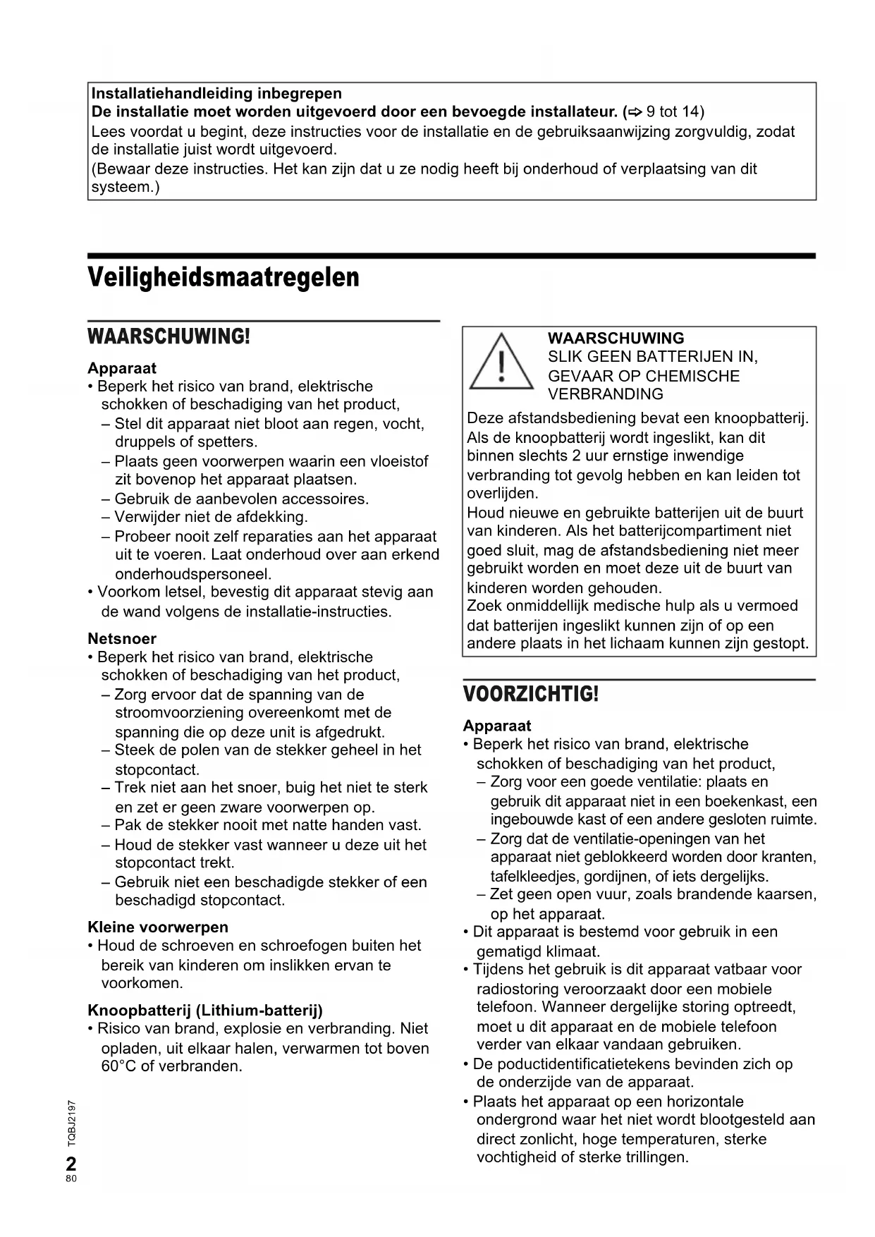 Deze afstandsbediening bevat een knoopbatterij. Als de knoopbatterij worden ingeslikt, kan dit binnen slechts 2aar ernstige inwendige verbranding tot gevolg hebben en kan leiden tot overlijden.