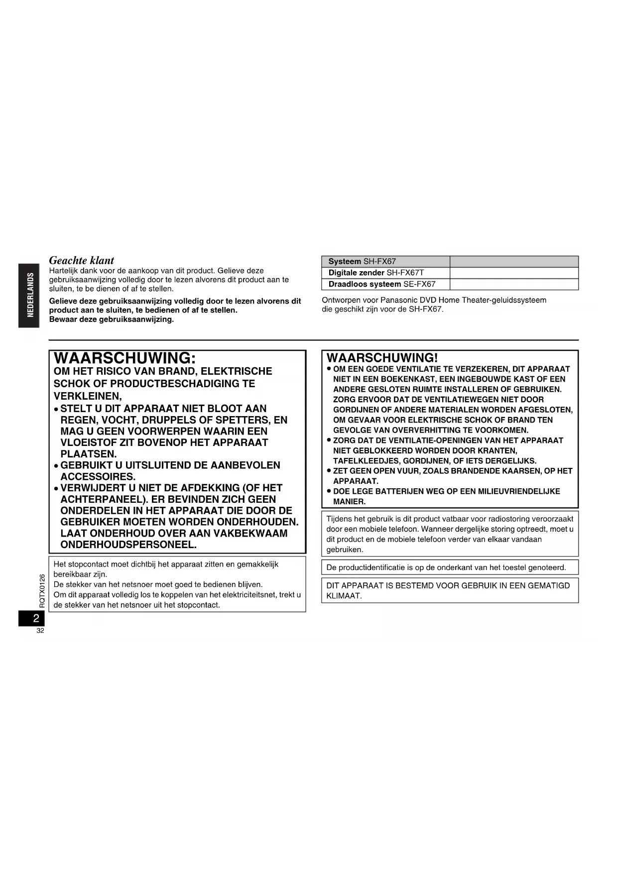 SH-FX67_RQTX0126_IT.fm Page 11 Thursday, November 29, 2007 10:49 PM2 RQTX0126 NEDERLANDS Geachte klant Hartelijk dank voor de aankoop van dit product. Gelieve deze gebruiksaanwijzing volledig door te lezen alvorens dit product aan te sluiten, te be dienen of af te stellen.Gelieve deze gebruiksaanwijzing volledig door te lezen alvorens dit product aan te sluiten, te bedienen of af te stellen.Bewaar deze gebruiksaanwijzing.Ontworpen voor Panasonic DVD Home Theater-geluidssysteem die geschikt zijn voor de SH-FX67.Systeem SH-FX67Digitale zender SH-FX67TDraadloos systeem SE-FX67 WAARSCHUWING: