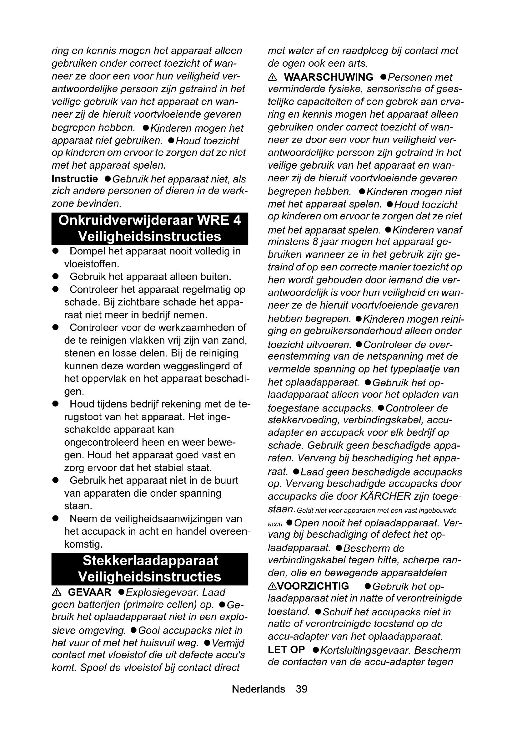 • EU-conformiteitsverklaring Nederlands 39 ring en kennis mogen het apparaat alleen gebruiken onder correct toezicht of wan- neer ze door een voor hun veiligheid ver- antwoordelijke persoon zijn getraind in het veilige gebruik van het apparaat en wan- neer zij de hieruit voortvloeiende gevaren begrepen hebben. ●Kinderen mogen het apparaat niet gebruiken. ●Houd toezicht op kinderen om ervoor te zorgen dat ze niet met het apparaat spelen. Instructie ●Gebruik het apparaat niet, als zich andere personen of dieren in de werk- zone bevinden. Onkruidverwijderaar WRE 4 Veiligheidsinstructies Dompel het apparaat nooit volledig in vloeistoffen. Gebruik het apparaat alleen buiten. Controleer het apparaat regelmatig op schade. Bij zichtbare schade het appa- raat niet meer in bedrijf nemen. Controleer voor de werkzaamheden of de te reinigen vlakken vrij zijn van zand, stenen en losse delen. Bij de reiniging kunnen deze worden weggeslingerd of het oppervlak en het apparaat beschadi- gen. Houd tijdens bedrijf rekening met de te- rugstoot van het apparaat. Het inge- schakelde apparaat kan ongecontroleerd heen en weer bewe- gen. Houd het apparaat goed vast en zorg ervoor dat het stabiel staat. Gebruik het apparaat niet in de buurt van apparaten die onder spanning staan. Neem de veiligheidsaanwijzingen van het accupack in acht en handel overeen- komstig. Stekkerlaadapparaat Veiligheidsinstructies GEVAAR ●Explosiegevaar. Laad geen batterijen (primaire cellen) op. ●Ge- bruik het oplaadapparaat niet in een explo- sieve omgeving. ●Gooi accupacks niet in het vuur of met het huisvuil weg. ●Vermijd contact met vloeistof die uit defecte accu's komt. Spoel de vloeistof bij contact direct met water af en raadpleeg bij contact met de ogen ook een arts. 몇 WAARSCHUWING ●Personen met verminderde fysieke, sensorische of gees- telijke capaciteiten of een gebrek aan erva- ring en kennis mogen het apparaat alleen gebruiken onder correct toezicht of wan- neer ze door een voor hun veiligheid ver- antwoordelijke persoon zijn getraind in het veilige gebruik van het apparaat en wan- neer zij de hieruit voortvloeiende gevaren begrepen hebben. ●Kinderen mogen niet met het apparaat spelen. ●Houd toezicht op kinderen om ervoor te zorgen dat ze niet met het apparaat spelen. ●Kinderen vanaf minstens 8 jaar mogen het apparaat ge- bruiken wanneer ze in het gebruik zijn ge- traind of op een correcte manier toezicht op hen wordt gehouden door iemand die ver- antwoordelijk is voor hun veiligheid en wan- neer ze de hieruit voortvloeiende gevaren hebben begrepen. ●Kinderen mogen reini- ging en gebruikersonderhoud alleen onder toezicht uitvoeren. ●Controleer de over- eenstemming van de netspanning met de vermelde spanning op het typeplaatje van het oplaadapparaat. ●Gebruik het op- laadapparaat alleen voor het opladen van toegestane accupacks. ●Controleer de stekkervoeding, verbindingskabel, accu- adapter en accupack voor elk bedrijf op schade. Gebruik geen beschadigde appa- raten. Vervang bij beschadiging het appa- raat. ●Laad geen beschadigde accupacks op. Vervang beschadigde accupacks door accupacks die door KÄRCHER zijn toege- staan. Geldt niet voor apparaten met een vast ingebouwde accu ●Open nooit het oplaadapparaat. Ver- vang bij beschadiging of defect het op- laadapparaat. ●Bescherm de verbindingskabel tegen hitte, scherpe ran- den, olie en bewegende apparaatdelen 몇 VOORZICHTIG ●Gebruik het op- laadapparaat niet in natte of verontreinigde toestand. ●Schuif het accupacks niet in natte of verontreinigde toestand op de accu-adapter van het oplaadapparaat. LET OP ●Kortsluitingsgevaar. Bescherm de contacten van de accu-adapter tegen40 Nederlands metalen deeltjes. ●Kortsluitingsgevaar. Bewaar accupacks niet samen met meta- len voorwerpen. ●Beschadigingsgevaar. Wikkel de verbindingskabel niet om de stekkervoeding of de accu-adapter. ●Dek het oplaadapparaat tijdens het bedrijf niet af. ●Draag het oplaadapparaat niet aan de verbindingskabel. Instructie ●Lees de veiligheidsinstructies bij het accupack. Neem bij het gebruik de veiligheidsinstructies in acht. Accupack / laadapparaat De handleidingen en veiligheidsaanwijzin- gen met betrekking tot de omgang met het apparaat lezen en in acht nemen. Reglementair gebruik 몇 WAARSCHUWING Letselgevaar door omhoog geslingerde delen Gebruik de onkruidverwijderaar alleen met intacte beschermkap. Het apparaat is voor het verwijderen van mos en onkruid uit rechte voegen en com- plex vormgegeven oppervlaktes bedoeld. Gebruik het apparaat uitsluitend voor de privé-huishouding. De telescoopsteel en de zwenkbare reini- gingskop kunnen aan verschillende li- chaamsgroottes worden aangepast. Te voorzien fout gebruik Niet-reglementair gebruik is verboden. De bediener is aansprakelijk voor schade die ontstaat door niet-reglementair gebruik. Milieubescherming Het verpakkingsmateriaal is recycle- baar. Gooi verpakkingen met het ge- scheiden afval weg. Elektrische en elektronische appara- ten bevatten waardevolle recyclebare materialen en vaak onderdelen zoals batterijen, accu's of olie, die bij onjuiste om- gang of verkeerd weggooien een mogelijk gevaar voor de gezondheid en het milieu kunnen vormen. Voor een correct gebruik van het apparaat zijn deze onderdelen ech- ter noodzakelijk. Apparaten met dit sym- bool mogen niet met het huisvuil worden weggegooid. Instructies voor inhoudsstoffen (RE- ACH) Actuele informatie over inhoudsstoffen vindt u onder: www.kaercher.nl/REACH Veiligheidsafdekking borstel Afbeelding B De veiligheidsafdekking voorkomt dat de gebruiker of omstanders door omhoog ge- slingerde deeltjes verwond raken. Symbolen op het apparaat Onkruidverwijderaar WRE 4 Stekkerlaadapparaat Toebehoren en reserveonderdelen Gebruik alleen origineel toebehoren en ori- ginele reserveonderdelen. Deze garande- ren een veilige en storingsvrije werking van het apparaat. Waarschuwing voor rondvlie- gende objecten. Houd anderen uit de buurt van het werkbereik. D