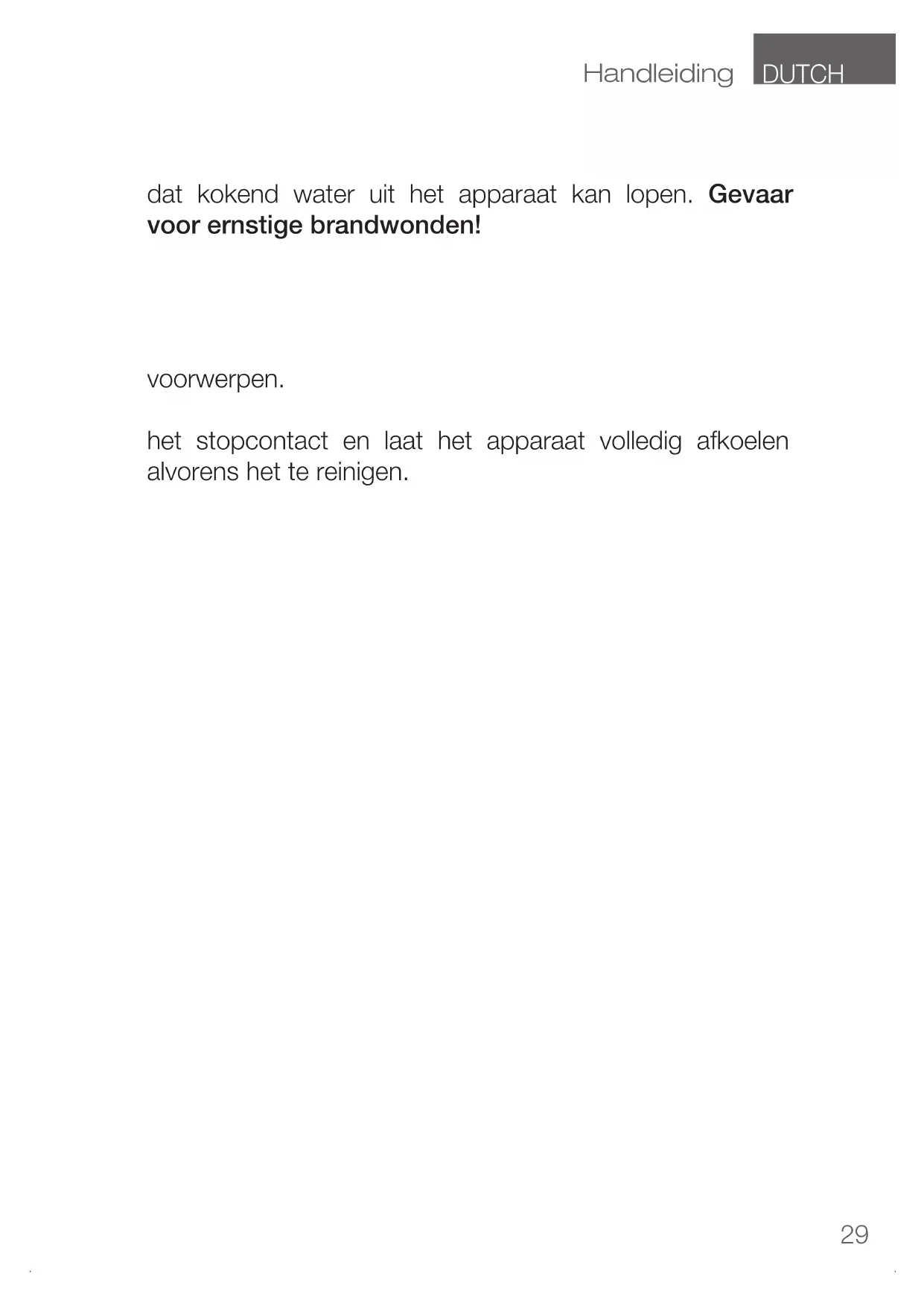 niet handgreep. Gevaar voor ernstige brandwonden! nooit gebruik, er verdampt hete stoom. Gevaar voor ernstige brandwonden!DUTCH Handleiding
