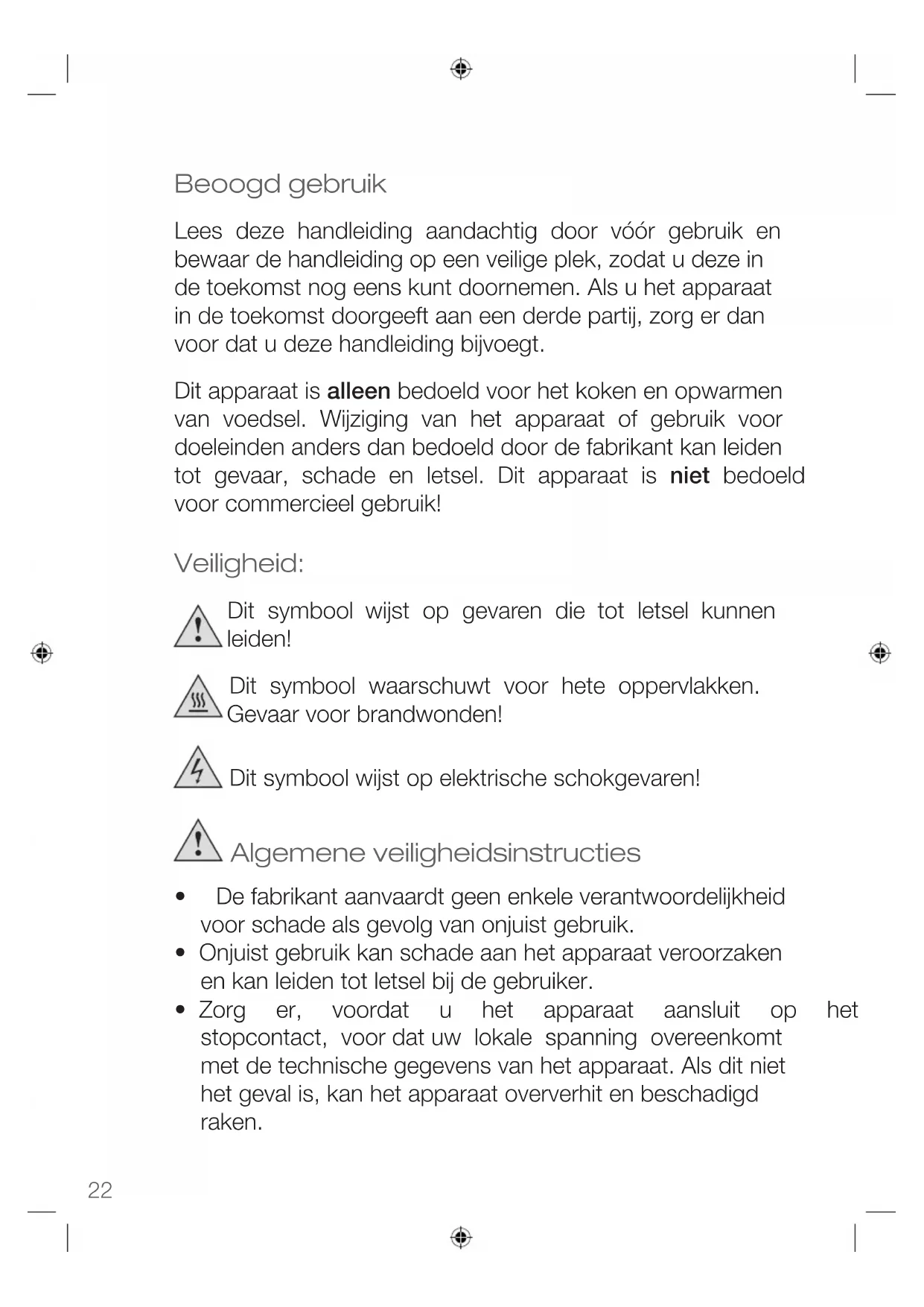- fordamagescausedbyowner This guarantee does not affect your statutory right, nor any legal right you may have as a costumer under applicable national legislation governing the purchase of goods. Inordertoasserthis/herrightinaguaranteecaseduringthe guaranteed period, the customer must provide evidence of thedateofpurchase(receipt). The guarantee is to be asserted against KORONA electric GmbH, Sundern/Germany. Service Address: KORONA Service, Am Steinbach 9, 59872 Meschede, Germany Telephone Hotline: 02933 90284-80 Mail: service@korona-electric.de web: www.korona-electric.de within 2 years after the date of purchase. In case of guarantee the customer is given the right to get the appliance repaired at our own or at an authorized shop. Further rights (due to guaranteecase)arenotgiventothecustomer.22 Beoogd gebruik Lees deze handleiding aandachtig door vóór gebruik en bewaar de handleiding op een veilige plek, zodat u deze in de toekomst nog eens kunt doornemen. Als u het apparaat in de toekomst doorgeeft aan een derde partij, zorg er dan voor dat u deze handleiding bijvoegt. Dit apparaat is alleen bedoeld voor het koken en opwarmen van voedsel. Wijziging van het apparaat of gebruik voor doeleinden anders dan bedoeld door de fabrikant kan leiden tot gevaar, schade en letsel. Dit apparaat is niet bedoeld voor commercieel gebruik! Veiligheid: Dit symbool wijst op gevaren die tot letsel kunnen leiden! Dit symbool waarschuwt voor hete oppervlakken. Gevaar voor brandwonden! Dit symbool wijst op elektrische schokgevaren! Algemene veiligheidsinstructies