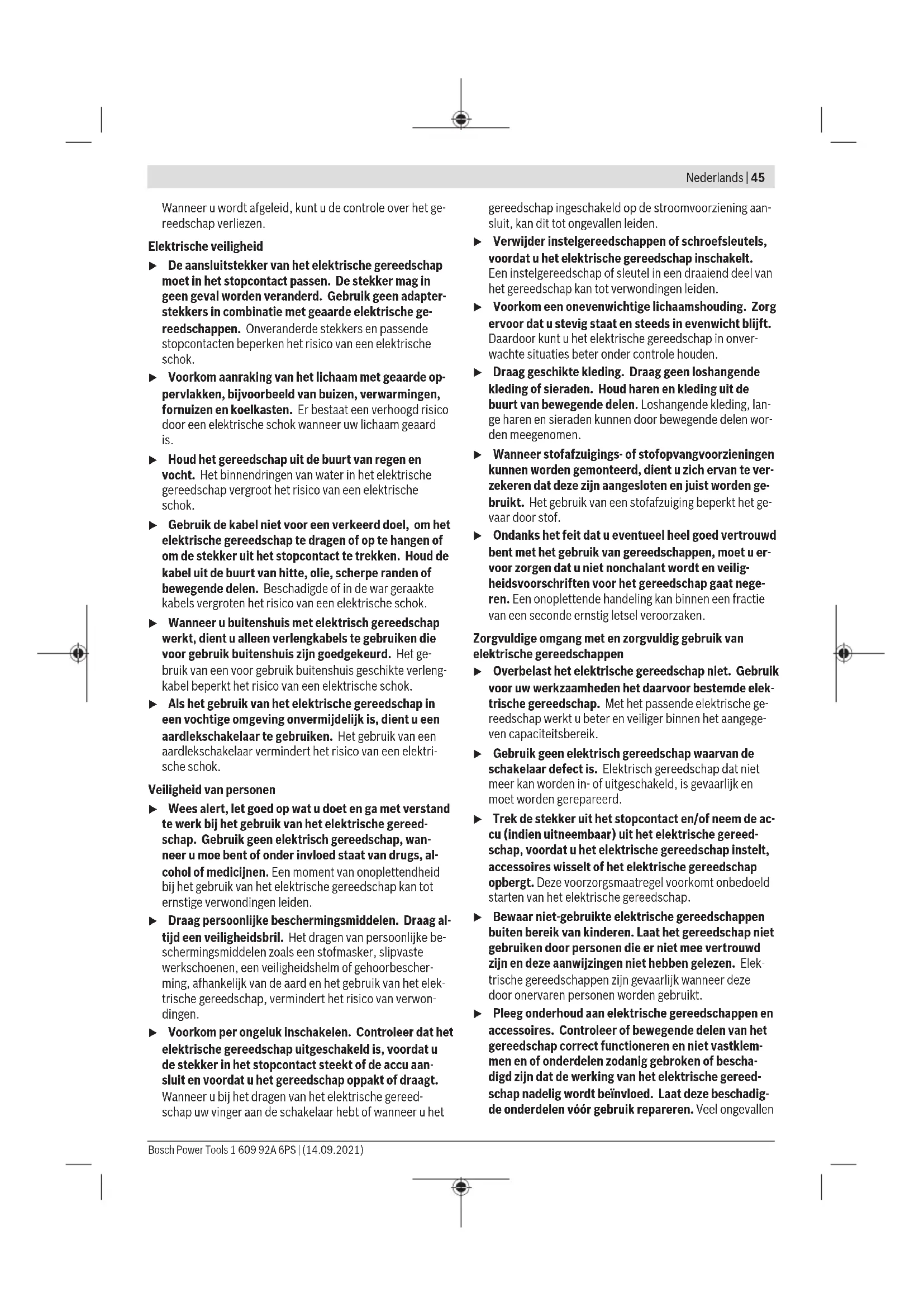 tot =0,12). A scopo di controllo, la coppia di serraggio andrà sempre verificata con una chiave torsiometrica. Classi di durezza secondo DIN267 Viti standard Viti ad alta resistenza 3,6 4,6 5,6 4,8 6,6 5,8 6,8 6,9 8,8 10,9 12,9 M6 2,71 3,61 4,52 4,8 5,42 6,02 7,22 8,13 9,7 13,6 16,2 M8 6,57 8,7 11 11,6 13,1 14,6 17,5 19,7 23 33 39 M10 13 17,5 22 23 26 29 35 39 47 65 78 M12 22,6 30 37,6 40 45 50 60 67 80 113 135 M14 36 48 60 65 72 79 95 107 130 180 215 M16 55 73 92 98 110 122 147 165 196 275 330 Consigli Prima d’inserire viti lunghe e voluminose in materiali duri, andrà eseguito un preforo per circa 2/3 della lunghezza di avvitamento, mediante il diametro del nucleo del filetto. Avvertenza: Accertarsi che nessun pezzo di piccole dimen- sioni penetri nell’elettroutensile. Avvertenze per l’impiego ottimale della batteria Proteggere la batteria dall’umidità e dall’acqua. Conservare la batteria esclusivamente nel campo di tempe- ratura fra –20 °C e 50 °C. Non lasciare la batteria all’interno dell’auto, ad es. nel periodo estivo. Una sensibile riduzione della durata del funzionamento dopo l’operazione di ricarica sta ad indicare che la batteria dovrà essere sostituita. Si prega di attenersi alle indicazioni relative allo smaltimen- to. Pulire occasionalmente le fessure di ventilazione e gli attac- chi della batteria con un pennello morbido, pulito ed asciut- to. Clip di aggancio cintura (vedere figura E) Tramite la clip di aggancio cintura (17) è possibile ad esem- pio agganciare l’elettroutensile ad una cinghia. In questo mo- do si hanno libere entrambe le mani e l’elettroutensile è sem- pre a portata di mano. Fermaglio colorato (vedere figura F) Con il fermaglio colorato (18) è possibile personalizzare in- dividualmente l’elettroutensile. Bosch Power Tools 1 609 92A 6PS | (14.09.2021)44 | Nederlands Manutenzione ed assistenza Manutenzione e pulizia u Pulire l’attacco utensile (1) e la bussola di serraggio (2) di tanto in tanto. u Pulire regolarmente le feritoie di aerazione dell’elet- troutensile. Il ventilatore del motore attira polvere nella carcassa ed una forte raccolta di polvere di metallo può provocare pericoli di origine elettrica. u Prima di qualsiasi intervento sull’elettroutensile (ad es. interventi di manutenzione, sostituzione dell’ac- cessorio ecc.), prelevare la batteria, anche nel caso in cui occorra trasportarlo o conservarlo. In caso di azio- namento accidentale dell’interruttore di avvio/arresto sussiste pericolo di lesioni. u Per poter garantire buone e sicure operazioni di lavo- ro, tenere sempre pulite l’elettroutensile e le fessure di ventilazione. Servizio di assistenza e consulenza tecnica Il servizio di assistenza risponde alle Vostre domande relati- ve alla riparazione e alla manutenzione del Vostro prodotto nonché concernenti i pezzi di ricambio. Disegni in vista esplosa e informazioni relative ai pezzi di ricambio sono con- sultabili anche sul sito www.bosch-pt.com Il team di consulenza tecnica Bosch sarà lieto di rispondere alle Vostre domande in merito ai nostri prodotti e accessori. In caso di richieste o di ordinazione di pezzi di ricambio, co- municare sempre il codice prodotto a 10cifre riportato sulla targhetta di fabbricazione dell’elettroutensile. Italia Tel.: (02) 3696 2314 E-Mail: pt.hotlinebosch@it.bosch.com Per ulteriori indirizzi del servizio assistenza consultare: www.bosch-pt.com/serviceaddresses Trasporto Le batterie al litio contenute sono soggette ai requisiti di leg- ge relativi a merci pericolose. Le batterie possono essere trasportate su strada tramite l’utente senza ulteriori precau- zioni. In caso di spedizione tramite terzi (ad es. per via aerea o tra- mite spedizioniere), andranno rispettati specifici requisiti relativi d’imballaggio e contrassegnatura. In tale caso, per la preparazione dell’articolo da spedire, andrà consultato uno specialista in merci pericolose. Inviare le batterie soltanto se la relativa carcassa non è dan- neggiata. Coprire con nastro adesivo i contatti scoperti ed imballare la batteria in modo che non possa spostarsi nell’imballaggio. Andranno altresì rispettate eventuali ulte- riori norme nazionali complementari. Smaltimento Avviare ad un riciclaggio rispettoso dell’am- biente elettroutensili, batterie, accessori ed im- ballaggi non più impiegabili. Non gettare elettroutensili e batterie/pile tra i rifiuti domestici! Solo per i Paesi UE: Conformemente alla direttiva europea 2012/19/UE, gli elet- troutensili non più utilizzabili e, in base alla direttiva europea 2006/66/CE, le batterie/le pile difettose o esauste, andran- no raccolti separatamente ed avviati ad un riutilizzo rispetto- so dell’ambiente. Batterie/pile: Per le batterie al litio: Attenersi alle avvertenze riportate al paragrafo «Traspor- to» (vedi «Trasporto», Pagina44). Nederlands Veiligheidsaanwijzingen Algemene veiligheidsaanwijzingen voor elektrische gereedschappen WAARSCHU- WING Lees alle waarschuwingen, veilig- heidsaanwijzingen, afbeeldingen en specificaties die bij dit elektri- sche gereedschap worden geleverd. Als de hieronder ver- melde aanwijzingen niet worden opgevolgd, kan dit een elek- trische schok, brand en/of ernstig letsel tot gevolg hebben. Bewaar alle waarschuwingen en voorschriften voor toe- komstig gebruik. Het in de waarschuwingen gebruikte begrip elektrisch ge- reedschap heeft betrekking op elektrische gereedschappen voor gebruik op het stroomnet (met netsnoer) en op elektri- sche gereedschappen voor gebruik met een accu (zonder netsnoer). Veiligheid van de werkomgeving u Houd uw werkomgeving schoon en goed verlicht. Een rommelige of onverlichte werkomgeving kan tot ongeval- len leiden. u Werk met het elektrische gereedschap niet in een om- geving met explosiegevaar waarin zich brandbare vloeistoffen, brandbare gassen of brandbaar stof be- vinden. Elektrische gereedschappen veroorzaken vonken die het stof of de dampen tot ontsteking kunnen brengen. u Houd kin