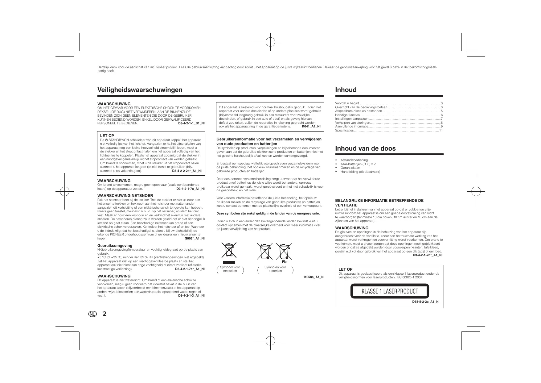 WAARSCHUWING NETSNOER Pak het netsnoer beet bij de stekker. Trek de stekker er niet uit door aan het snoer te trekken en trek nooit aan het netsnoer met natte handen aangezien dit kortsluiting of een elektrische schok tot gevolg kan hebben. Plaats geen toestel, meubelstuk o.i.d. op het netsnoer, en klem het niet vast. Maak er nooit een knoop in en en verbind het evenmin met andere snoeren. De netsnoeren dienen zo te worden geleid dat er niet per ongeluk iemand op gaat staan. Een beschadigd netsnoer kan brand of een elektrische schok veroorzaken. Kontroleer het netsnoer af en toe. Wanneer u de indruk krijgt dat het beschadigd is, dient u bij uw dichtstbijzijnde erkende PIONEER onderhoudscentrum of uw dealer een nieuw snoer te kopen. S002*_A1_Nl
