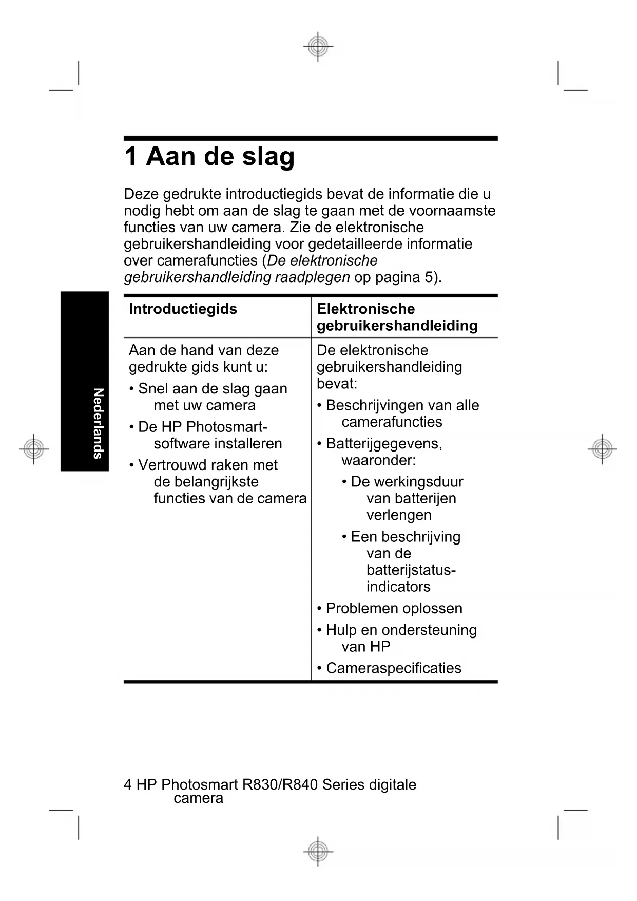 - Cameraspecificaties 4 HP Photosmart R830/R840 Series digitale camera NederlandsDe elektronische gebruikershandleiding raadplegen U vindt de elektronische gebruikershandleiding op de HP Photosmart Software CD. Zo kunt u de gebruikershandleiding bekijken: