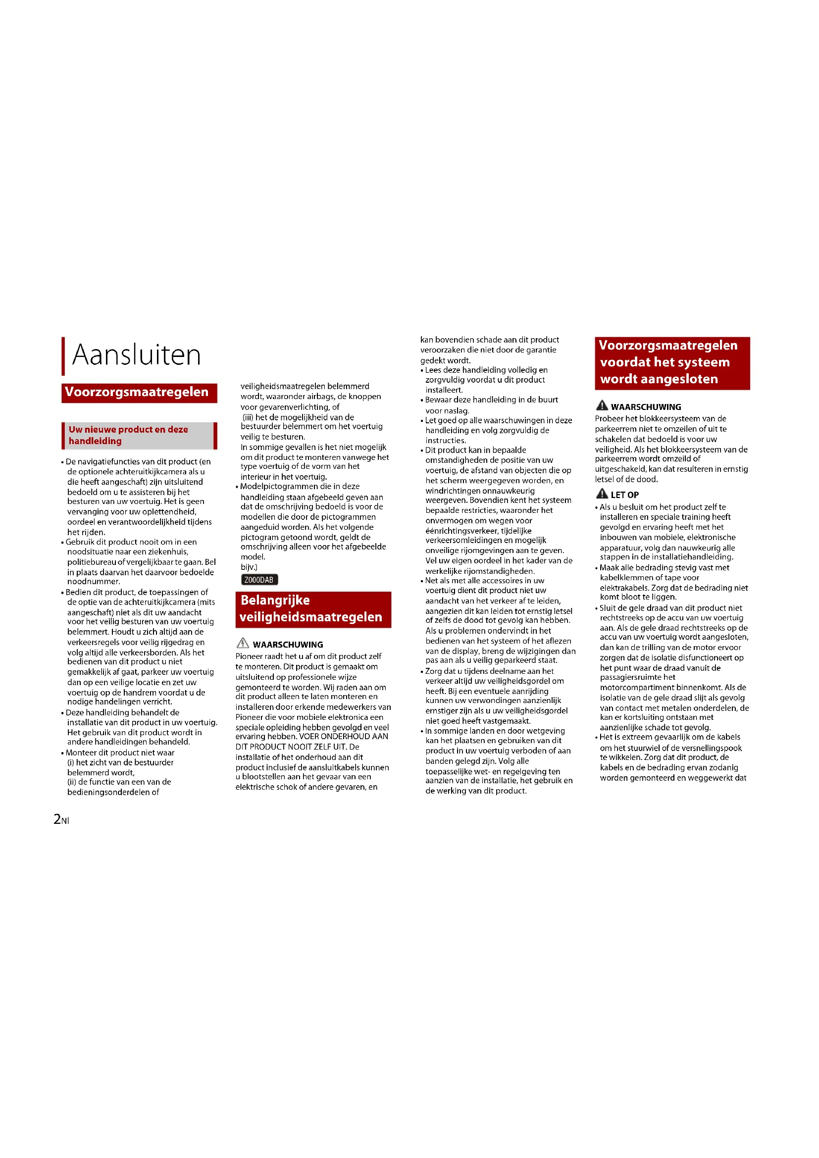 - De navigatiefuncties van dit product (en de optionele achteruitkijkcamera als u die heeft aangeschaft) zijn uitsluitend bedoeld om u te assisteren bij het besturen van uw voertuig. Het is geen vervanging voor uw oplettendheid, oordeel en verantwoordelijkheid tijdens het rijden.• Gebruik dit product nooit om in een noodsituatie naar een ziekenhuis, politiebureau of vergelijkbaar te gaan. Bel in plaats daarvan het daarvoor bedoelde noodnummer.• Bedien dit product, de toepassingen of de optie van de achteruitkijkcamera (mits aangeschaft) niet als dit uw aandacht voor het veilig besturen van uw voertuig belemmert. Houdt u zich altijd aan de verkeersregels voor veilig rijgedrag en volg altijd alle verkeersborden. Als het bedienen van dit product u niet gemakkelijk af gaat, parkeer uw voertuig dan op een veilige locatie en zet uw voertuig op de handrem voordat u de nodige handelingen verricht.• Deze handleiding behandelt de installatie van dit product in uw voertuig. Het gebruik van dit product wordt in andere handleidingen behandeld.• Monteer dit product niet waar(i) het zicht van de bestuurder belemmerd wordt,(ii) de functie van een van de bedieningsonderdelen of veiligheidsmaatregelen belemmerd wordt, waaronder airbags, de knoppen voor gevarenverlichting, of (iii) het de mogelijkheid van de bestuurder belemmert om het voertuig veilig te besturen.In sommige gevallen is het niet mogelijk om dit product te monteren vanwege het type voertuig of de vorm van het interieur in het voertuig.• Modelpictogrammen die in deze handleiding staan afgebeeld geven aan dat de omschrijving bedoeld is voor de modellen die door de pictogrammen aangeduid worden. Als het volgende pictogram getoond wordt, geldt de omschrijving alleen voor het afgebeelde model.bijv.) WAARSCHUWING Pioneer raadt het u af om dit product zelf te monteren. Dit product is gemaakt om uitsluitend op professionele wijze gemonteerd te worden. Wij raden aan om dit product alleen te laten monteren en installeren door erkende medewerkers van Pioneer die voor mobiele elektronica een speciale opleiding hebben gevolgd en veel ervaring hebben. VOER ONDERHOUD AAN DIT PRODUCT NOOIT ZELF UIT. De installatie of het onderhoud aan dit product inclusief de aansluitkabels kunnen u blootstellen aan het gevaar van een elektrische schok of andere gevaren, en Aansluiten Voorzorgsmaatregelen Uw nieuwe product en deze handleiding Belangrijke veiligheidsmaatregelen Z000DABkan bovendien schade aan dit product veroorzaken die niet door de garantie gedekt wordt.• Lees deze handleiding volledig en zorgvuldig voordat u dit product installeert.• Bewaar deze handleiding in de buurt voor naslag.• Let goed op alle waarschuwingen in deze handleiding en volg zorgvuldig de instructies.• Dit product kan in bepaalde omstandigheden de positie van uw voertuig, de afstand van objecten die op het scherm weergegeven worden, en windrichtingen onnauwkeurig weergeven. Bovendien kent het systeem bepaalde restricties, waaronder het onvermogen om wegen voor éénrichtingsverkeer, tijdelijke verkeersomleidingen en mogelijk onveilige rijomgevingen aan te geven. Vel uw eigen oordeel in het kader van de werkelijke rijomstandigheden.• Net als met alle accessoires in uw voertuig dient dit product niet uw aandacht van het verkeer af te leiden, aangezien dit kan leiden tot ernstig letsel of zelfs de dood tot gevolg kan hebben. Als u problemen ondervindt in het bedienen van het systeem of het aflezen van de display, breng de wijzigingen dan pas aan als u veilig geparkeerd staat.• Zorg dat u tijdens deelname aan het verkeer altijd uw veiligheidsgordel om heeft. Bij een eventuele aanrijding kunnen uw verwondingen aanzienlijk ernstiger zijn als u uw veiligheidsgordel niet goed heeft vastgemaakt.• In sommige landen en door wetgeving kan het plaatsen en gebruiken van dit product in uw voertuig verboden of aan banden gelegd zijn. Volg alle toepasselijke wet- en regelgeving ten aanzien van de installatie, het gebruik en de werking van dit product. WAARSCHUWING Probeer het blokkeersysteem van de parkeerrem niet te omzeilen of uit te schakelen dat bedoeld is voor uw veiligheid. Als het blokkeersysteem van de parkeerrem wordt omzeild of uitgeschakeld, kan dat resulteren in ernstig letsel of de dood. LET OP