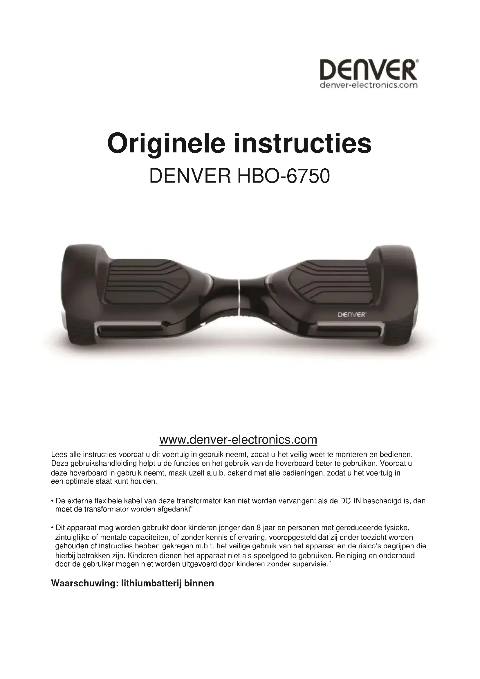 E conforme pertanto ai requisiti essenziali della Direttiva macchine. Identitàe firma della persona abilitata a redigere la dichiarazione e a compilare i file tecnici per conto del produttore Firma: Nomeecognome: Alfred Blank Posizione: Amministratore Delegato Società: DENVER ELECTRONICS A/S Data: 27th July 2020Originele instructies DENVER HBO-6750 www.denver-electronics.com Lees alle instructies voordat u dit voertuig in gebruik neemt, zodat u het veilig weet te monteren en bedienen. Deze gebruikshandleiding helpt u de functies en het gebruik van de hoverboard beter te gebruiken. Voordat u deze hoverboard in gebruik neemt, maak uzelf a.u.b. bekend met alle bedieningen, zodat u het voertuig in een optimale staat kunt houden.
