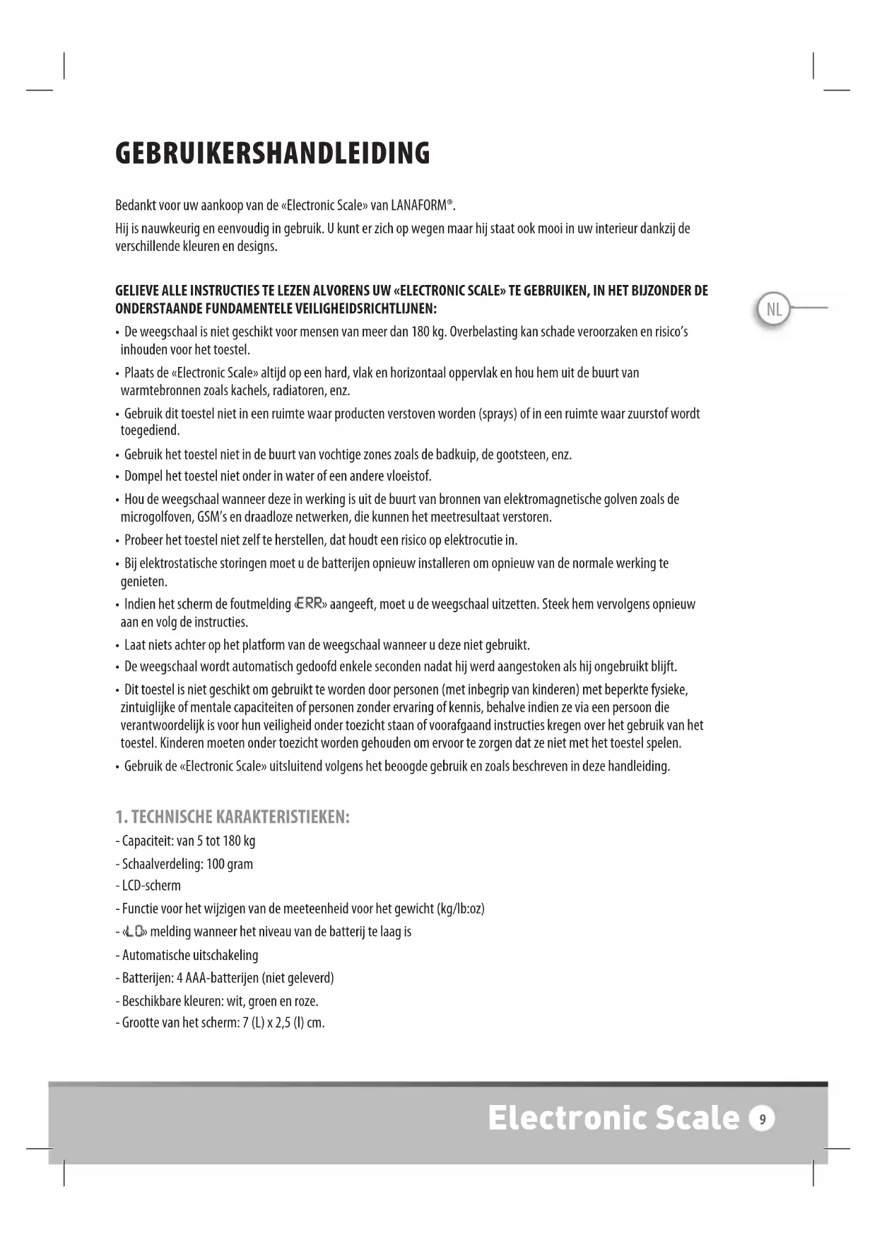 - Wanneer u het toestel niet langer gebruikt, dient u dit op milieuvriendelijke wijze en overeenkomstig de wettelijke richtlijnen te verwijderen. Verwijder de batterij en deponeer deze in een inzamelbak zodat deze gerecycleerd kan worden. Aandacht: de gebruikte batterijen mogen op geen enkele manier bij het huishoudelijk afval geplaatst worden!!! BEPERKTE GARANTIE LANAFORM®garandeert dat dit product geen onderdelen met gebreken en fabricagefouten bevat voor een periode van twee jaar vanaf de aankoopdatum, met uitzondering van de onderstaande gevallen. LANAFORM®dekt geen schade veroorzaakt door een normale slijtage van dit product. Deze garantie op een product van LANAFORM® dekt geen schade, veroorzaakt door een slecht of verkeerd gebruik van het toestel, een ongeluk, het bevestigen van niet-toegestane toebehoren, het aanpassen van het product of om het even welke andere omstandigheid, van welke aard ook, waar LANAFORM® geen controle over heeft. LANAFORM® kan niet aansprakelijk worden gesteld voor gevolgschade, niet-rechtstreekse schade of specifieke schade van welke aard ook. Alle garanties die impliciet te maken hebben met de geschiktheid van het product zijn beperkt tot een periode van twee jaar, te rekenen vanaf de oorspronkelijke aankoopdatum in zover een aankoopsbewijs voorgelegd kan worden. Na ontvangst zal LANAFORM® het toestel herstellen of vervangen, naargelang het geval, en zal het u nadien ook terugsturen. De garantie wordt enkel uitgeoefend via het LANAFORM® Service Center. Elke onderhoudsactiviteit op dit product die wordt toevertrouwd aan elke andere persoon dan iemand van het LANAFORM®Service Center annuleert deze garantie. De foto’s en andere voorstellingen van het product in deze handleiding en op de verpakking zijn zo accuraat mogelijk. De kans bestaat echter dat de gelijkenis met het product niet perfect is. Electronic Scale 11ES