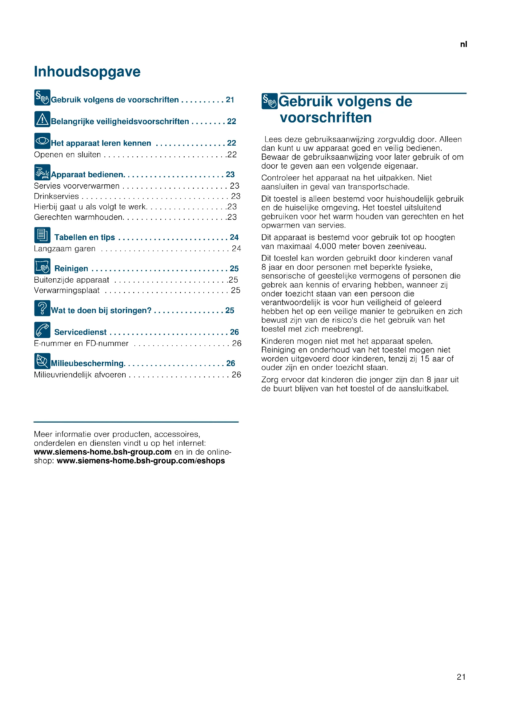 - Het apparaat leren kennen . . . . . . . . . . . . . . . . 22 Openen en sluiten . . . . . . . . . . . . . . . . . . . . . . . . . . .22 1 Apparaat bedienen. . . . . . . . . . . . . . . . . . . . . . . 23 Servies voorverwarmen . . . . . . . . . . . . . . . . . . . . . . . 23 Drinkservies . . . . . . . . . . . . . . . . . . . . . . . . . . . . . . . . 23 Hierbij gaat u als volgt te werk. . . . . . . . . . . . . . . . . .23 Gerechten warmhouden. . . . . . . . . . . . . . . . . . . . . . .23 J Tabellen en tips . . . . . . . . . . . . . . . . . . . . . . . . . 24 Langzaam garen . . . . . . . . . . . . . . . . . . . . . . . . . . . . 24 D Reinigen . . . . . . . . . . . . . . . . . . . . . . . . . . . . . . . 25 Buitenzijde apparaat . . . . . . . . . . . . . . . . . . . . . . . . .25 Verwarmingsplaat . . . . . . . . . . . . . . . . . . . . . . . . . . . 25 3 Wat te doen bij storingen? . . . . . . . . . . . . . . . . 25 4 Servicedienst . . . . . . . . . . . . . . . . . . . . . . . . . . . 26 E-nummer en FD-nummer . . . . . . . . . . . . . . . . . . . . . 26 7 Milieubescherming. . . . . . . . . . . . . . . . . . . . . . . 26 Milieuvriendelijk afvoeren . . . . . . . . . . . . . . . . . . . . . . 26 Produktinfo Meer informatie over producten, accessoires, onderdelen en diensten vindt u op het internet: www.siemens-home.bsh-group.com en in de online- shop: www.siemens-home.bsh-group.com/eshops 8Gebruik volgens de voorschriften Gebr ui k vol gens de voor schr i f t en Lees deze gebruiksaanwijzing zorgvuldig door. Alleen dan kunt u uw apparaat goed en veilig bedienen. Bewaar de gebruiksaanwijzing voor later gebruik of om door te geven aan een volgende eigenaar. Controleer het apparaat na het uitpakken. Niet aansluiten in geval van transportschade. Dit toestel is alleen bestemd voor huishoudelijk gebruik en de huiselijke omgeving. Het toestel uitsluitend gebruiken voor het warm houden van gerechten en het opwarmen van servies. Dit apparaat is bestemd voor gebruik tot op hoogten van maximaal 4.000 meter boven zeeniveau. Dit toestel kan worden gebruikt door kinderen vanaf 8 jaar en door personen met beperkte fysieke, sensorische of geestelijke vermogens of personen die gebrek aan kennis of ervaring hebben, wanneer zij onder toezicht staan van een persoon die verantwoordelijk is voor hun veiligheid of geleerd hebben het op een veilige manier te gebruiken en zich bewust zijn van de risico's die het gebruik van het toestel met zich meebrengt. Kinderen mogen niet met het apparaat spelen. Reiniging en onderhoud van het toestel mogen niet worden uitgevoerd door kinderen, tenzij zij 15 aar of ouder zijn en onder toezicht staan. Zorg ervoor dat kinderen die jonger zijn dan 8 jaar uit de buurt blijven van het toestel of de aansluitkabel.nl Belangrijke veiligheidsvoorschriften