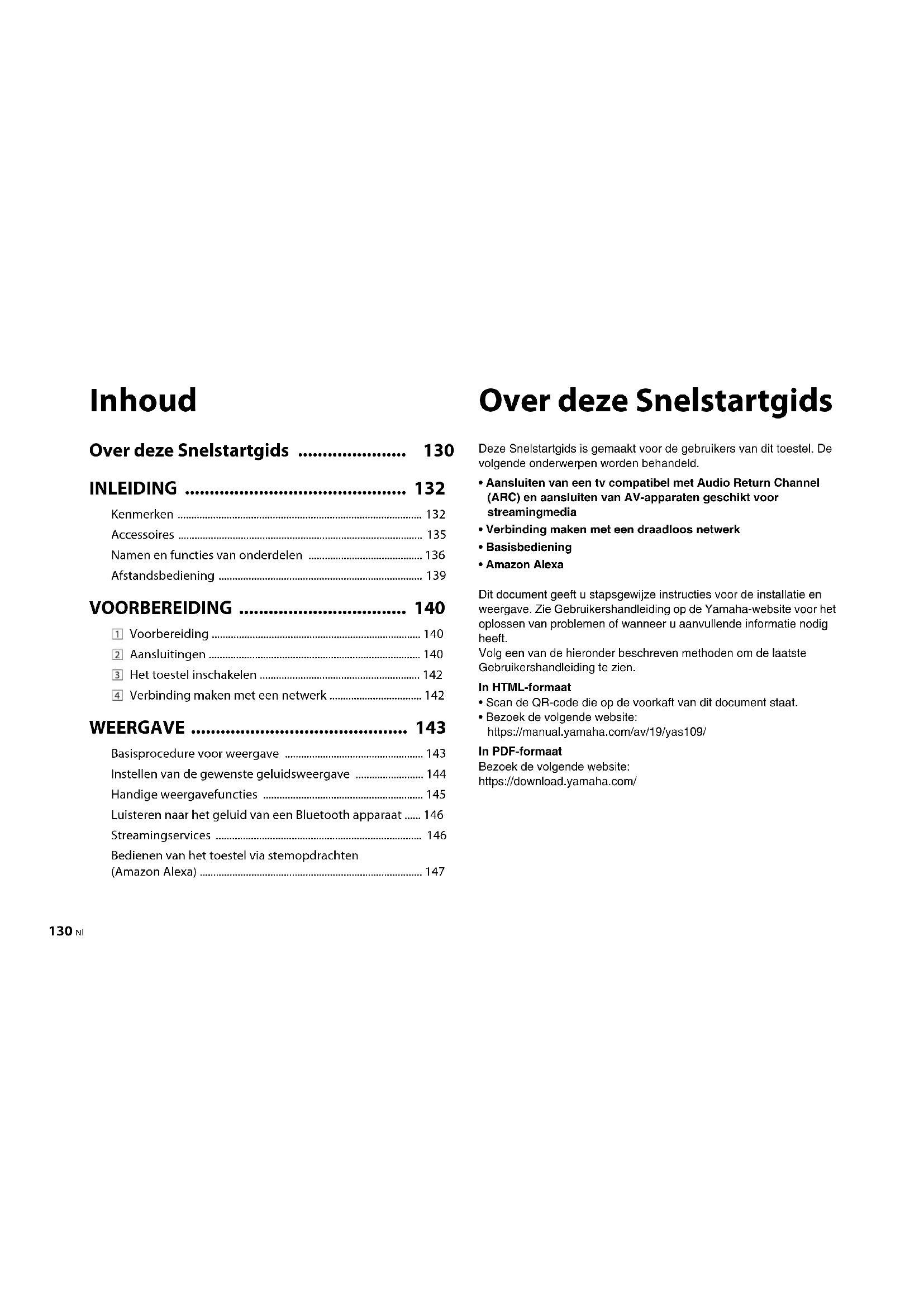 - Bezoek de volgende website: https://manual.yamaha.com/av/19/yas109/ In PDF-formaat Bezoek de volgende website: https://download.yamaha.com/Nl 131 [Alleen voor gebruikers in de VS] Ga naar de volgende website voor aanvullende informatie, veelgestelde vragen, downloads zoals de "Gebruikershandleiding" en updates voor het product: http://usa.yamaha.com/support/ Informatie over de inhoud van deze handleiding