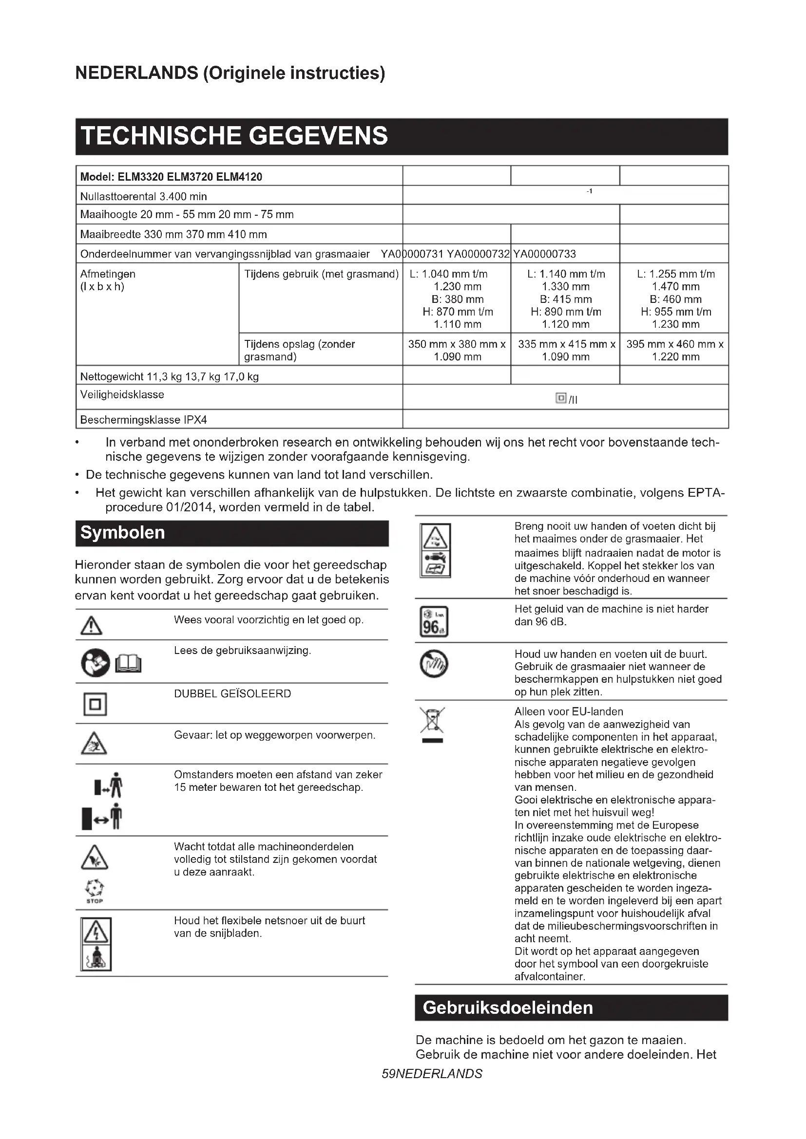 Gevaar: let op weggeworpen voorwerpen. Omstanders moeten een afstand van zeker 15 meter bewaren tot het gereedschap. Wacht totdat alle machineonderdelen volledigtotstilstandzijngekomenvoordat u deze aanraakt. Houdhetexibelenetsnoeruitdebuurt vandesnijbladen. Brengnooituwhandenofvoetendichtbij het maaimes onder de grasmaaier. Het maaimesblijftnadraaiennadatdemotoris uitgeschakeld. Koppel het stekker los van de machine vóór onderhoud en wanneer het snoer beschadigd is. Het geluid van de machine is niet harder dan 96 dB. Houd uw handen en voeten uit de buurt. Gebruik de grasmaaier niet wanneer de beschermkappen en hulpstukken niet goed op hun plek zitten. Alleen voor EU-landen Als gevolg van de aanwezigheid van schadelijkecomponenteninhetapparaat, kunnen gebruikte elektrische en elektro- nische apparaten negatieve gevolgen hebben voor het milieu en de gezondheid van mensen. Gooi elektrische en elektronische appara- ten niet met het huisvuil weg! In overeenstemming met de Europese richtlijninzakeoudeelektrischeenelektro- nische apparaten en de toepassing daar- van binnen de nationale wetgeving, dienen gebruikte elektrische en elektronische apparaten gescheiden te worden ingeza- meldentewordeningeleverdbijeenapart inzamelingspuntvoorhuishoudelijkafval dat de milieubeschermingsvoorschriften in acht neemt. Dit wordt op het apparaat aangegeven door het symbool van een doorgekruiste afvalcontainer. Gebruiksdoeleinden De machine is bedoeld om het gazon te maaien. Gebruik de machine niet voor andere doeleinden. Het60 NEDERLANDS gebruikvandemachinebijanderewerkzaamheden dan waarvoor deze bedoeld is, kan leiden tot gevaar- lijkesituaties. Voeding Het gereedschap mag alleen worden aangesloten op een voeding van dezelfde spanning als aangegeven ophettypeplaatje,enkanalleenwordengebruiktop enkelfase-wisselstroom. Het gereedschap is dubbel-ge- isoleerd en kan derhalve ook op een niet-geaard stop- contact worden aangesloten. Als het netsnoer beschadigd is, moet het worden ver- vangen door de fabrikant of haar servicecentrum om gevaarlijkesituatiestevoorkomen. Voor openbare laagspanningsverdeelsystemen van tussen 220 V en 250 V Het in- en uitschakelen van elektrische apparatuur veroorzaakt spanningsvariaties. Het gebruik van dit gereedschapterwijlhetelektriciteitsnetineenslechte toestand verkeert, kan de werking van andere appara- tuurnadeligbeïnvloeden.Alsdenetweerstandgelijkis aan of lager is dan 0,425 ohm (voor ELM3720) of 0,427 ohm (voor ELM4120), mag u ervan uitgaan dat geen nadeligeeectenoptreden.Hetstopcontactwaaropdit gereedschapisaangeslotenmoetzijnbeveiligdmet een zekering of veiligheidsstroomonderbreker met trage uitschakeling. Geluidsniveau Toepasselijkenorm:ENIEC62841-4-3 Model Geluidsdrukniveau Geluidsvermogenniveau
