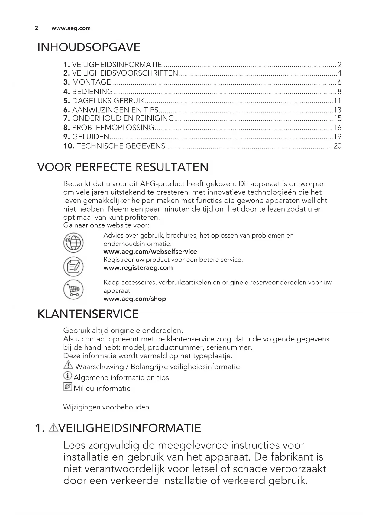 Bedankt dat u voor dit AEG-product heeft gekozen. Dit apparaat is ontworpen om vele jaren uitstekend te presteren, met innovatieve technologieën die het leven gemakkelijker helpen maken met functies die gewone apparaten wellicht niet hebben. Neem een paar minuten de tijd om het door te lezen zodat u er optimaal van kunt profiteren. Ga naar onze website voor: Advies over gebruik, brochures, het oplossen van problemen en onderhoudsinformatie: www.aeg.com/webselfservice Registreer uw product voor een betere service: www.registeraeg.com Koop accessoires, verbruiksartikelen en originele reserveonderdelen voor uw apparaat: www.aeg.com/shop KLANTENSERVICE Gebruik altijd originele onderdelen. Als u contact opneemt met de klantenservice zorg dat u de volgende gegevens bij de hand hebt: model, productnummer, serienummer. Deze informatie wordt vermeld op het typeplaatje. Waarschuwing / Belangrijke veiligheidsinformatie Algemene informatie en tips Milieu-informatie Wijzigingen voorbehouden.
