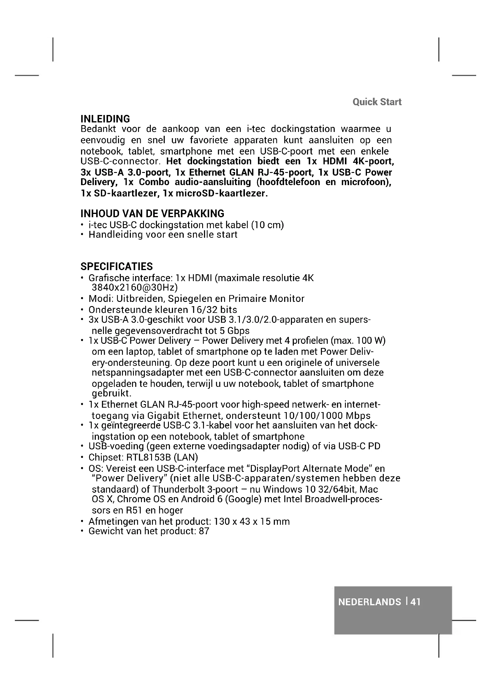NEDERLANDS INLEIDING Bedankt voor de aankoop van een i-tec dockingstation waarmee u eenvoudig en snel uw favoriete apparaten kunt aansluiten op een notebook, tablet, smartphone met een USB-C-poort met een enkele USB-C-connector. Het dockingstation biedt een 1x HDMI 4K-poort, 3x USB-A 3.0-poort, 1x Ethernet GLAN RJ-45-poort, 1x USB-C Power Delivery, 1x Combo audio-aansluiting (hoofdtelefoon en microfoon), 1x SD-kaartlezer, 1x microSD-kaartlezer.