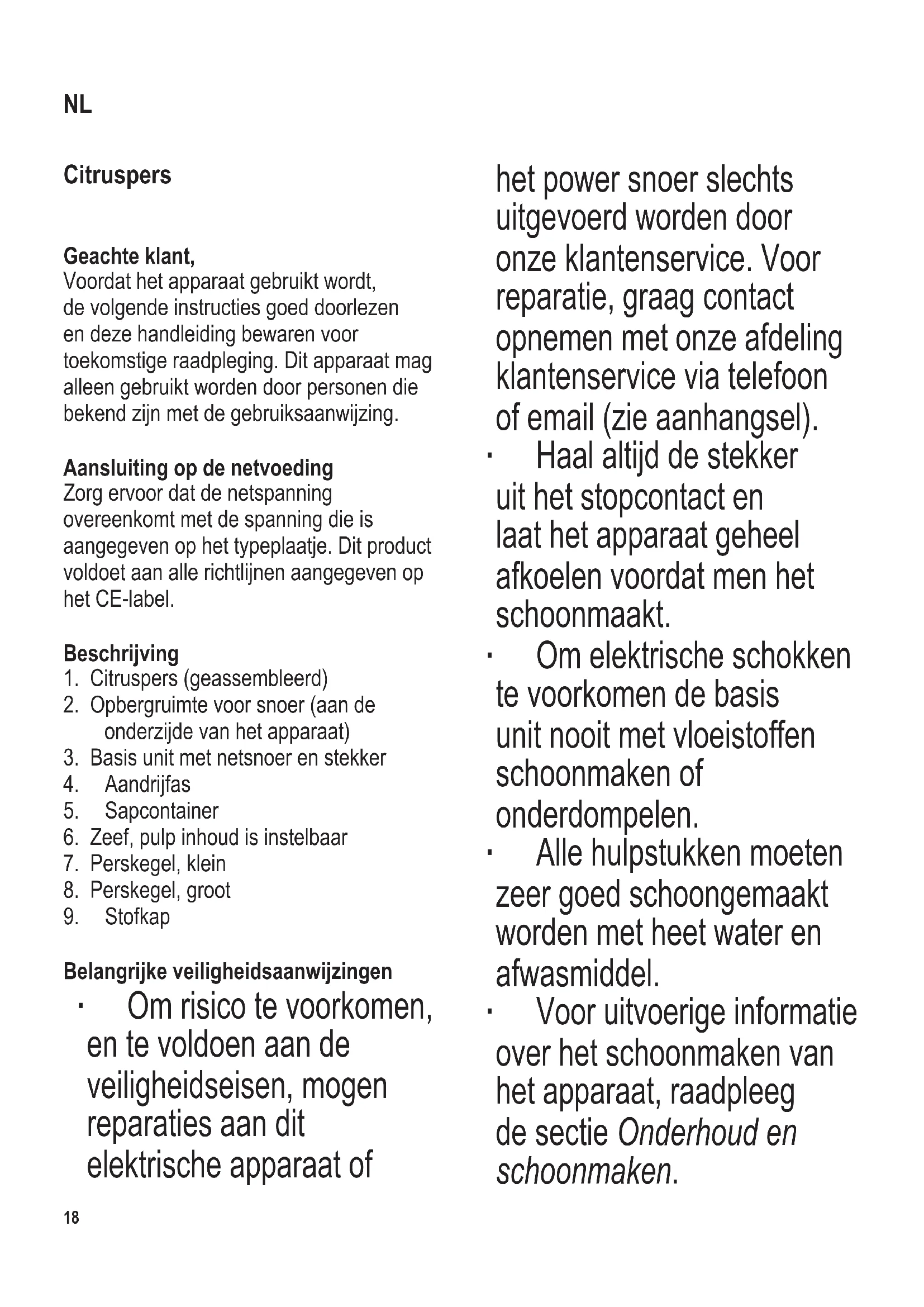 te duwen totdat hij hoorbaar goed vergrendeld. ∙ Plaats de pulpzeef met de perskegel op de sapcontainer. ∙ Wanneer men groot citrusfruit perst, zoals sinaasappels, gebruik dan de grote perskegel. Deze past over de kleineperskegel;zorgervoordatde uitsparingen in de grote kegel passen over de richels op de kleine kegel. Tip De hoeveelheid pulp in het sap kan aangepast worden door het openen of sluiten van de pulpzeef: =zeefgeopend→hoger pulpgehalte =zeefgesloten→lager pulpgehalte ∙ Stop nu de stekker in het stopcontact. ∙ Snij het citrusfruit door de helft en druk de helft zachtjes op de perskegel met de opengesneden kant naar beneden. ∙ De aandrijfas zal automatisch gaan draaien wanneer men druk uitoefent op de perskegel. Het apparaat zal stoppen wanneer de druk van de perskegel verminderd wordt. ∙ Om het sap er beter uit te kunnen persen draait de motor in beide richtingen en kan hij ook tijdens gebruik van draairichting veranderen. ∙ Wanneer men grote hoeveelheden fruit perst moet men de pulpzeef regelmatig leegmaken. ∙ Verwijder altijd de stekker uit het stopcontact alvorens het sap uit te schenken. ∙ Om het uitgeperste sap uit te schenken, de pulpzeef en kegel verwijderen uit de sap container, ontgrendel dan de sap container van de basis unit door de container met de klok mee te draaien. ∙ Bewaar het sap in een geschikte houder. Onderhoud en schoonmaken ∙ Voordat men het apparaat schoonmaakt de stekker uit het stopcontact halen. ∙ Om elektrische schokken te voorkomen dit apparaat nooit met vloeistoffen schoonmaken of onderdompelen. ∙ Gebruik nooit schuurmiddelen, bijtende stoffen of harde borstels voor het schoonmaken. ∙ De basis unit mag schoongeveegd worden met een pluisvrije vochtige doek. ∙ Alle hulpstukken moeten direct na gebruik zeer goed schoongemaakt worden met heet water en afwasmiddel. ∙ Gedurende de periode dat het apparaat niet wordt gebruikt moeten de pulpzeef, de perskegels en de stofkap na het schoonmaken op het apparaat geplaatst worden. Afval weggooien Instrumenten gemerkt met dit symbool moeten apart weggegooid worden van het huishoudelijke afval, daar deze waardevolle materialen bevatten welke men kan recyclen. Juist wegdoen zal het milieu en de menselijke gezondheid beschermen. De plaatselijke autoriteit of handelaar kan daar informatie over geven.22 104 x 142 mm Garantieverklaring Voor dit apparaat geldt een garantie van twee jaar na de aankoopdatum voor materiaal- en fabrieksfouten. Uitgesloten van garantie is schade die ontstaan is door het niet in acht nemen van de gebruiksaanwijzing, normale slijtage en zeer breekbare onderdelen zoals glazen kannen etc. Deze garantieverklaring heeft geen invloed op uw wettelijke rechten, en ook niet op uw legale rechten welke men heeft als een consument onder de toepasselijke nationale wetgeving welke de aankoop van goederen beheerst. De garantie vervalt bij reparatie door niet door ons bevoegde instellingen.104 x 142 mm