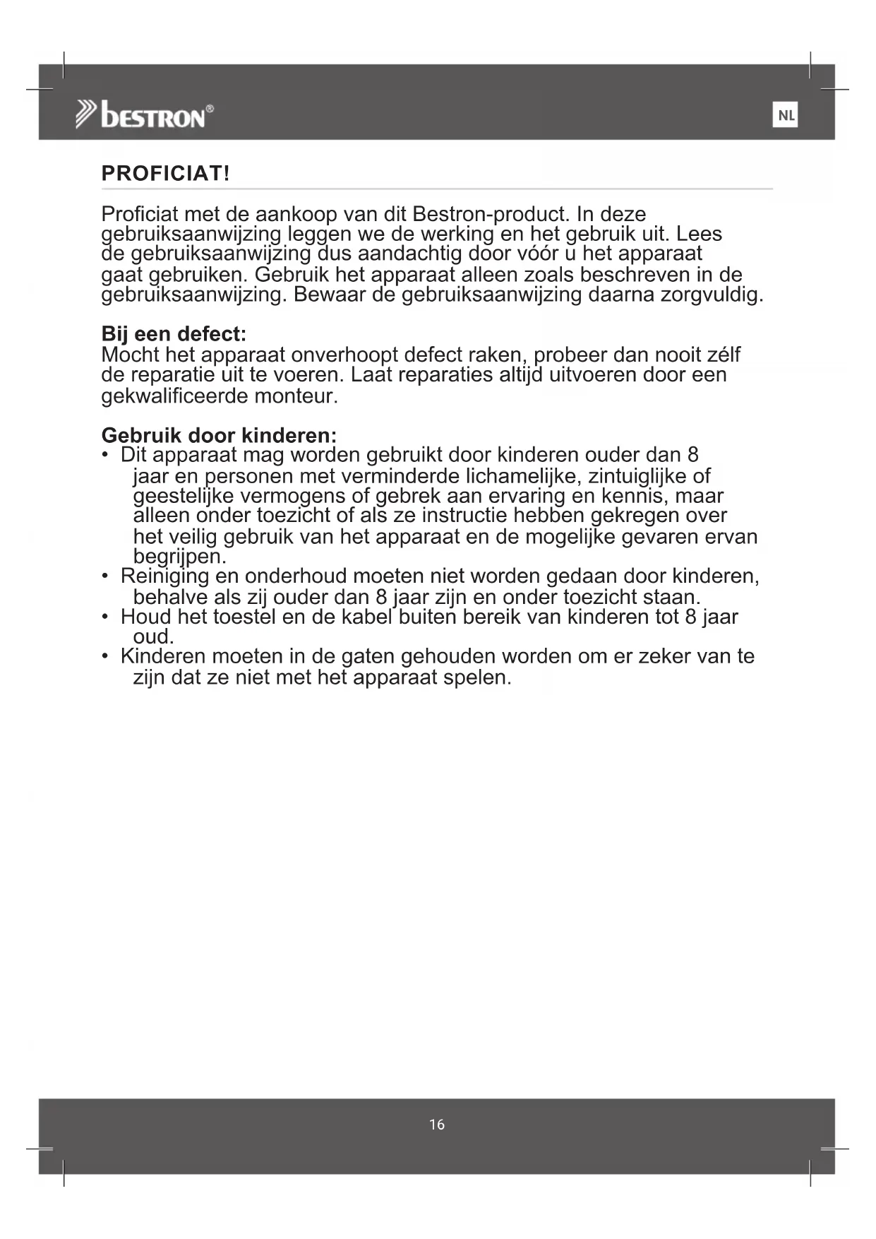 PROFICIAT! Proficiat met de aankoop van dit Bestron-product. In deze gebruiksaanwijzing leggen we de werking en het gebruik uit. Lees de gebruiksaanwijzing dus aandachtig door vóór u het apparaat gaat gebruiken. Gebruik het apparaat alleen zoals beschreven in de gebruiksaanwijzing. Bewaar de gebruiksaanwijzing daarna zorgvuldig. Bij een defect: Mocht het apparaat onverhoopt defect raken, probeer dan nooit zélf de reparatie uit te voeren. Laat reparaties altijd uitvoeren door een gekwalificeerde monteur. Gebruik door kinderen: