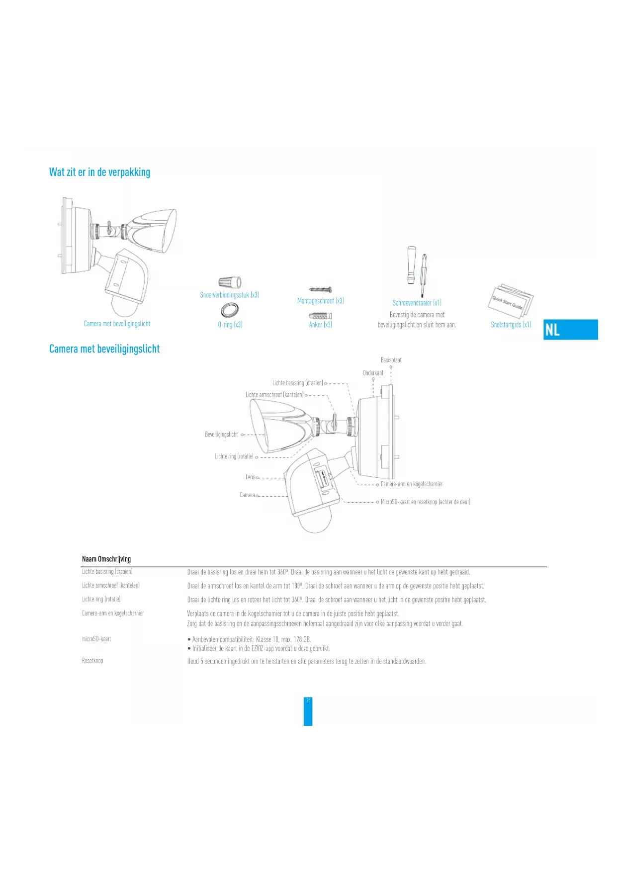 Zorg bij het plaatsen van de basisplaat dat het logo (UP) naar boven gericht is. Aanbevolen installatiehoogte: 10feet (3m) boven de grond. Aanbevolen boor: Ø6 spec. boor. Aanbevolen boordiepte: 0,13feet tot 0,14feet (40 tot 43mm).28 Stap 4 Monteer de camera met beveiligingslicht aan de basisplaat.