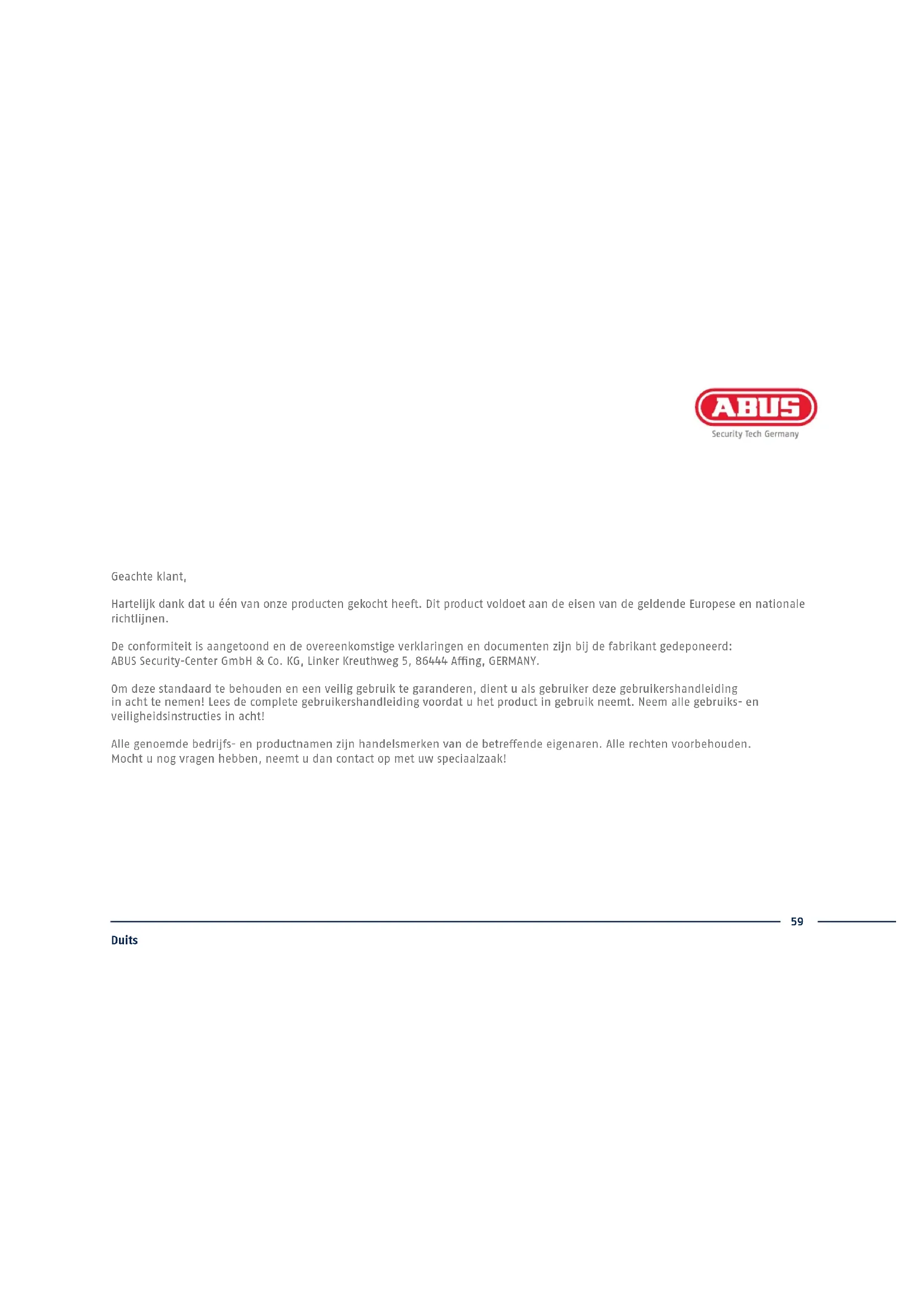 In deze korte handleiding worden de eerste installatiestappen voor uw IP-recorder beschreven. Gedetailleerde informatie vindt u in de gebruikershandleiding.59 Duits Geachte klant, Hartelijk dank dat u één van onze producten gekocht hee. Dit product voldoet aan de eisen van de geldende Europese en nationale richtlijnen. De conformiteit is aangetoond en de overeenkomstige verklaringen en documenten zijn bij de fabrikant gedeponeerd: ABUS Security-Center GmbH & Co. KG, Linker Kreuthweg 5, 86444 Ang, GERMANY. Om deze standaard te behouden en een veilig gebruik te garanderen, dient u als gebruiker deze gebruikershandleiding in acht te nemen! Lees de complete gebruikershandleiding voordat u het product in gebruik neemt. Neem alle gebruiks- en veiligheidsinstructies in acht! Alle genoemde bedrijfs- en productnamen zijn handelsmerken van de betreende eigenaren. Alle rechten voorbehouden. Mocht u nog vragen hebben, neemt u dan contact op met uw speciaalzaak!60 Duits