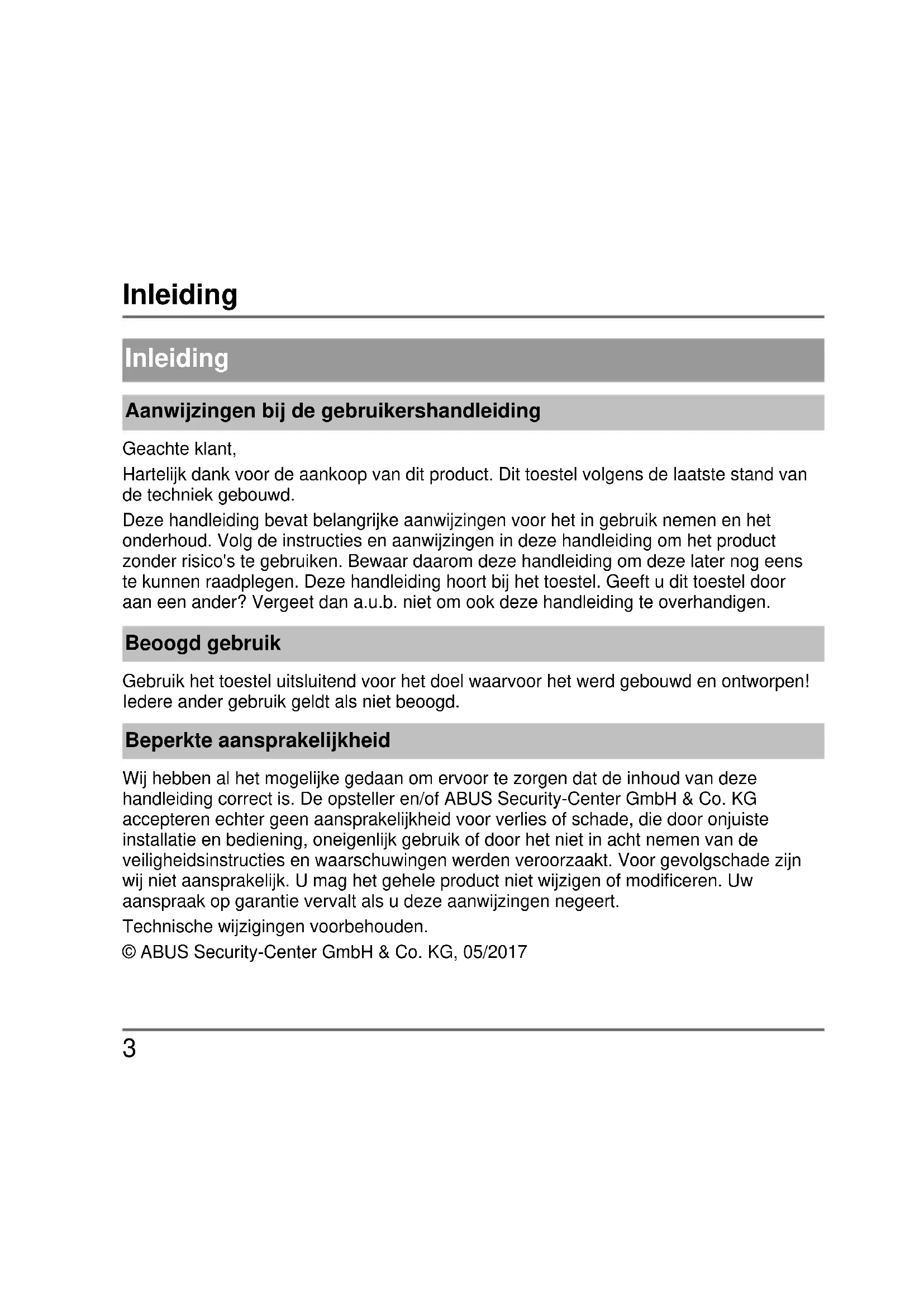 Inleiding Aanwijzingen bij de gebruikershandleiding Geachte klant, Hartelijk dank voor de aankoop van dit product. Dit toestel volgens de laatste stand van de techniek gebouwd. Deze handleiding bevat belangrijke aanwijzingen voor het in gebruik nemen en het onderhoud. Volg de instructies en aanwijzingen in deze handleiding om het product zonder risico's te gebruiken. Bewaar daarom deze handleiding om deze later nog eens te kunnen raadplegen. Deze handleiding hoort bij het toestel. Geeft u dit toestel door aan een ander? Vergeet dan a.u.b. niet om ook deze handleiding te overhandigen. Beoogd gebruik Gebruik het toestel uitsluitend voor het doel waarvoor het werd gebouwd en ontworpen! Iedere ander gebruik geldt als niet beoogd. Beperkte aansprakelijkheid Wij hebben al het mogelijke gedaan om ervoor te zorgen dat de inhoud van deze handleiding correct is. De opsteller en/of ABUS Security-Center GmbH & Co. KG accepteren echter geen aansprakelijkheid voor verlies of schade, die door onjuiste installatie en bediening, oneigenlijk gebruik of door het niet in acht nemen van de veiligheidsinstructies en waarschuwingen werden veroorzaakt. Voor gevolgschade zijn wij niet aansprakelijk. U mag het gehele product niet wijzigen of modificeren. Uw aanspraak op garantie vervalt als u deze aanwijzingen negeert. Technische wijzigingen voorbehouden. © ABUS Security-Center GmbH & Co. KG, 05/2017Veiligheidsinstructies